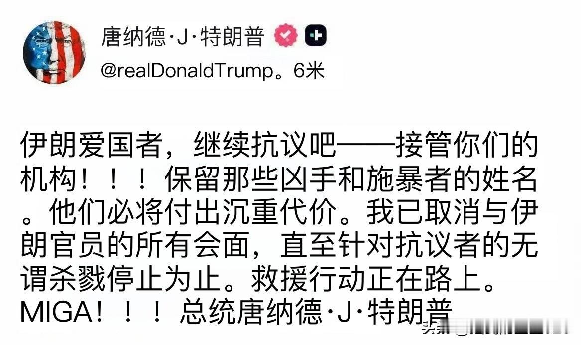 装都不装一下,直接煽动。 美国总统特朗普再次发文,号召所谓的“抗议者”继续在伊朗“抗议”。 特朗普还呼吁抗议者“接管”伊朗各个机构。但要保留那些“凶手和施暴者”(显然是指伊朗当局的执法者)的姓名 特朗普还警告称,“他们”必将付出沉重代价。 特朗普还强调,他已经取消了与伊朗官员的所有会面,直至伊朗针对“抗议者”的无谓杀戮停止为止。 最后,特朗普还强调,“救援行动正在路上。”