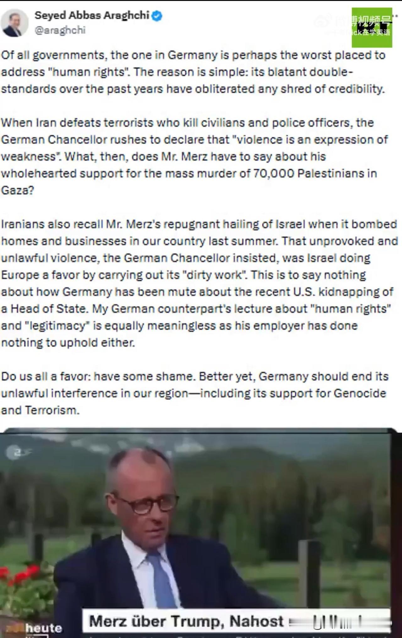 伊朗外交部长阿拉格齐谴责德国总理默茨在对待人权问题上采用双重标准。 伊朗外长阿