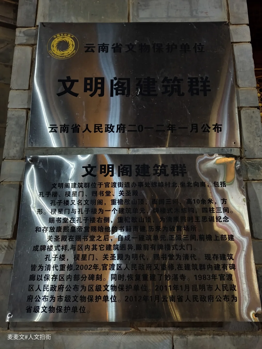 妙湛寺旁是文明阁建筑群,又称孔子楼,里面还有关圣殿、赐书堂等建筑。三组建筑坐北朝南,呈品字形。
