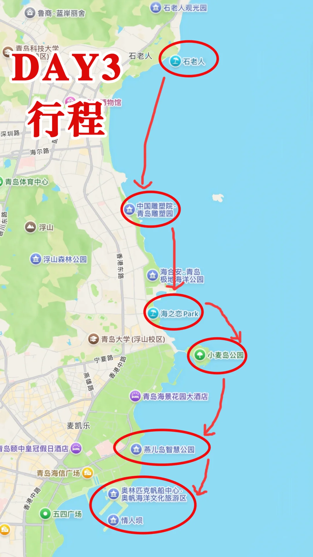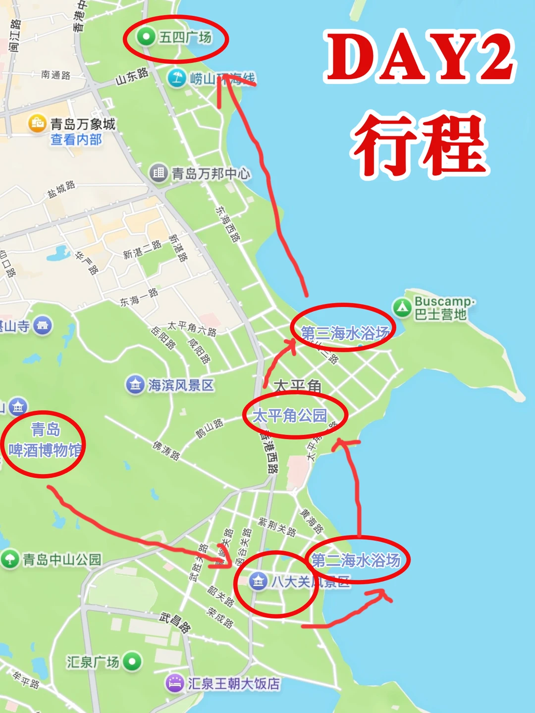 📍市区:第一、第二、第三海水浴场,石老人海水浴场,可以下海游泳,基础设施完善,安全性比较高。但商业化严重;燕儿岛、小麦岛、琴屿路,属于海边公园,很多木栈道,适合散步拍照;栈桥、五四广场、奥帆中心青岛地标打卡!