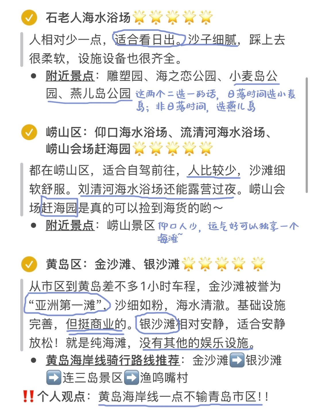 📍黄岛区:金沙滩、金沙滩!要玩推荐金沙滩,沙子非常细软;想安静看海推荐银沙滩,但没啥娱乐设施!