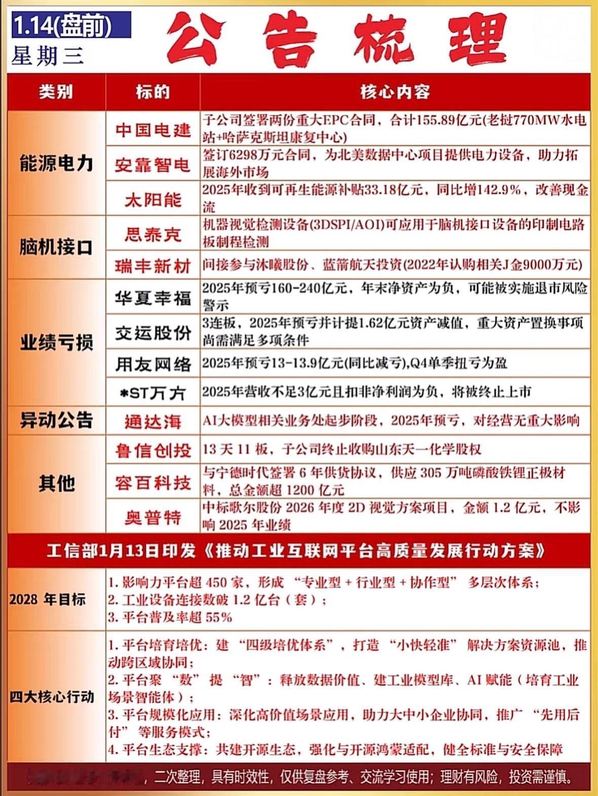 1月14日盘前上市公司公告信息梳理 中国电建签海外大单,新能源与工业互联网迎政策利好,多家企业面临退市风险但部分业务突破。投资需谨慎。 中国电建海外签单,容百科技与宁德时代千亿合作,工业互联网方案发布,多家企业预亏警示。