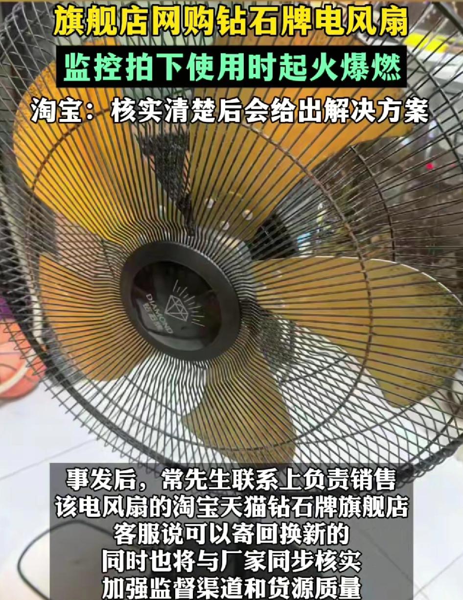 海南一男子在淘宝旗舰店购买了一台钻石牌电风扇,一天在客厅发现电风扇在使用过程中突然冒烟。没想到时隔一个月,电风扇再次在使用过程中爆烟。火花差点把床单都点着了,情况非常惊险,客服人员称这种情况还是没有遇到过,男子发现风扇虽然写的是钻石牌风扇,但事实上厂家是广东三角牌的公司,客服怀疑有假冒的产品对男子提出给予300元补偿的建议,但是男子拒绝了。