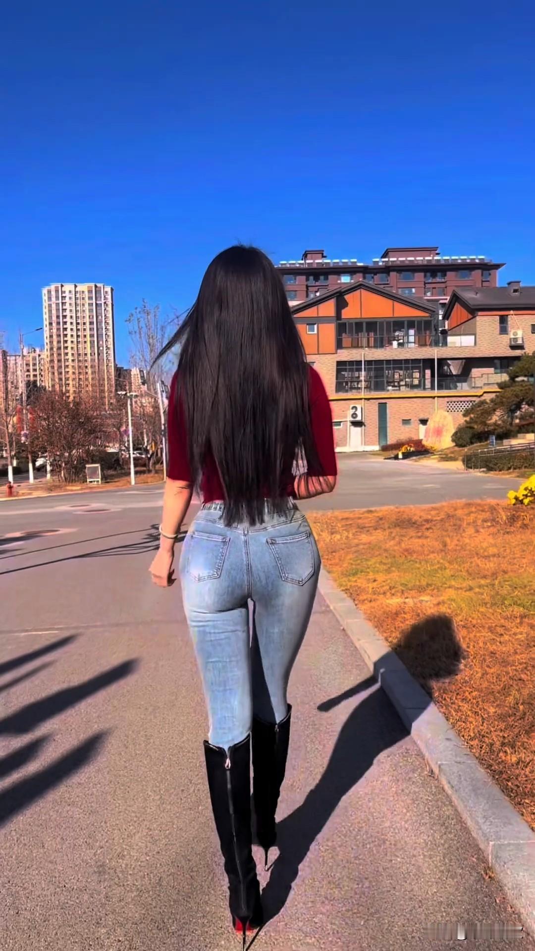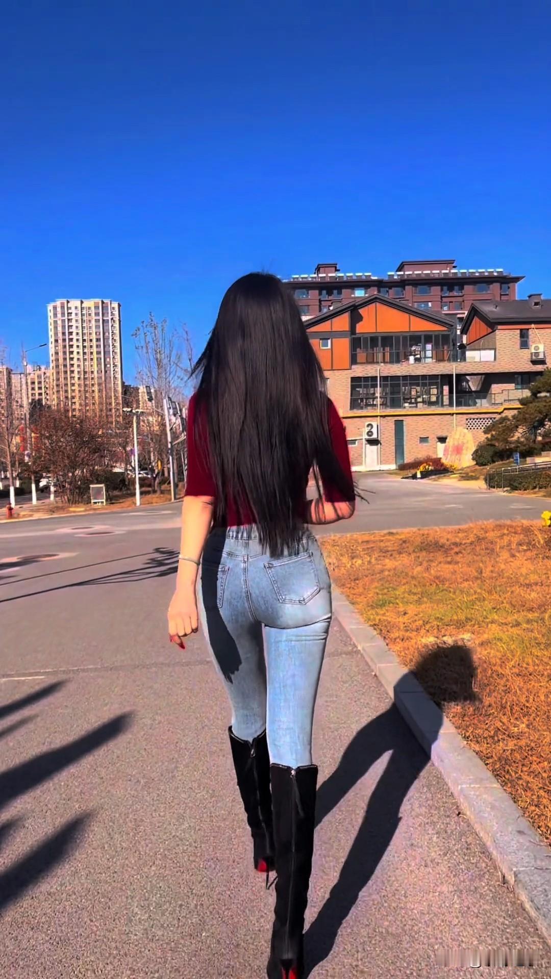 街头随拍的牛仔裤背影杀,这身材比例直接封神! 谁能拒绝牛仔裤搭配长靴的绝美背影?画面中的女子身着酒红色修身上衣,搭配浅蓝色高腰牛仔裤与黑色过膝长靴,在湛蓝天空下的城市街道上,将极致的身材曲线展现得淋漓尽致。 高腰牛仔裤完美贴合腰臀线条,饱满的臀部曲线与纤细的腰肢形成鲜明对比,酒红色上衣的简约设计更凸显出身形的曼妙;过膝长靴拉长了腿部比例,让整体身形更显高挑。乌黑的长发垂落背后,与蓝天、城市建筑相映成趣,行走的瞬间,透着一股随性又性感的街头氛围感。 这组随拍没有刻意的摆拍,却把日常穿搭的美感与身材优势融合得恰到好处。你觉得牛仔裤搭配什么上衣最能凸显腰臀比例? 街头随拍 牛仔裤穿搭 背影杀 极致身材比例