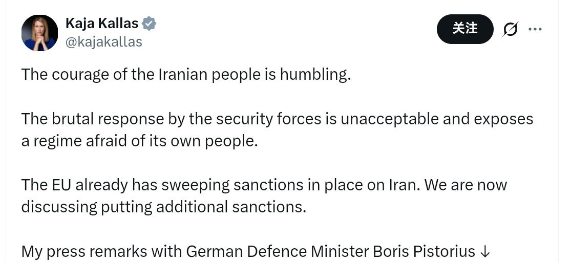 欧盟委员会副主席卡娅·卡拉斯: 伊朗人民的勇气令人敬佩。安全部队的残暴镇压令人无法接受,这暴露了一个害怕自己人民的政权本质。欧盟已经对伊朗实施了全面制裁,我们目前正在讨论进一步追加制裁措施。