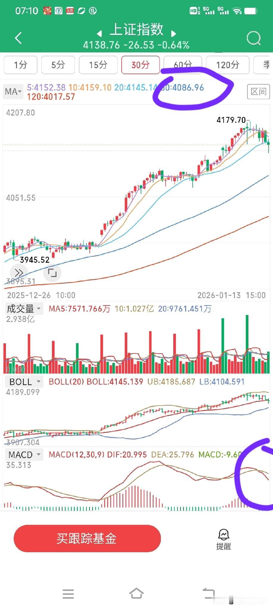 1月14日早评。隔夜美股三大指教全线下跌收小阴(图1),纳斯达克中国金指数、中概股及富时三倍做多中国ETF均收出中阴线(图2、3、4),提示今日A股继续调整的概率较大。 事实上,从天量见天价和放量下跌两个方面讲,A股短期调整一下并非坏事,涨多了就回下来一点,走得可能更远。 毗陵猎人昨晚收评告诉大家做T并非看空市场,而是敬畏那句“牛市多长阴”的股训,牛市中快速调整时幅度往往很大,短短2~3天的跌幅有时会吞没一两周的涨幅,做T可以有效避免利润回吐。 从技术面看,本人更相信这是一次30分钟级别的回调,指数可能回踩一下4086点(图4)。当然,今天的第一关口是60周期15分钟移动平均线的4126点(图5),如果4126点不破就是15分钟调查结构,今天略微低开后就能高走;如果破了就是30分钟结构调整,对应3个交易日。因为后天是期指交割日,所以毗陵猎人认为后一种可能性大一点。 大家正好趁着调整间隙现察一下板块和个股的强弱,除了自己长期持有的仓内票不动之外,灵活资金是要有所调整的。 个人观点,不构成投资依据,不喜勿喷。祝大家今日好运。