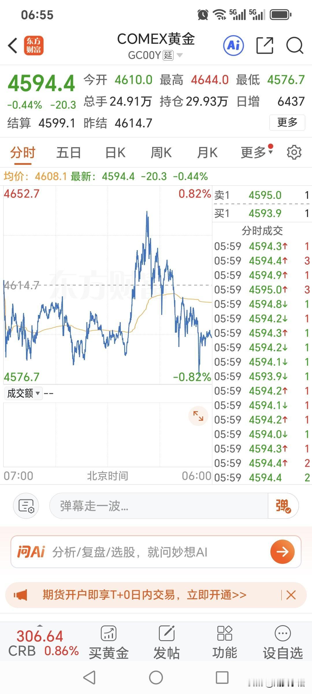周二国际金价震荡运行, 虽然盘中一度拉高收红, 但是最终仍以下跌收盘。 昨日国际金价开盘4610美元, 盘中最高升至4644美元, 最低跌至4576.7美元, 收盘于4594.4美元, 较上一日下跌20.3美金, 跌幅不大,仅为0.44%。 对于国际金价, 期货小褚观点不变, 还是建议大家观望为主!