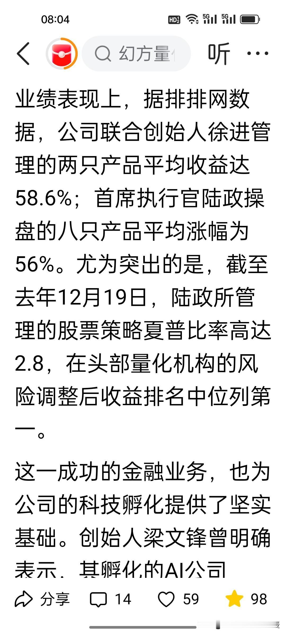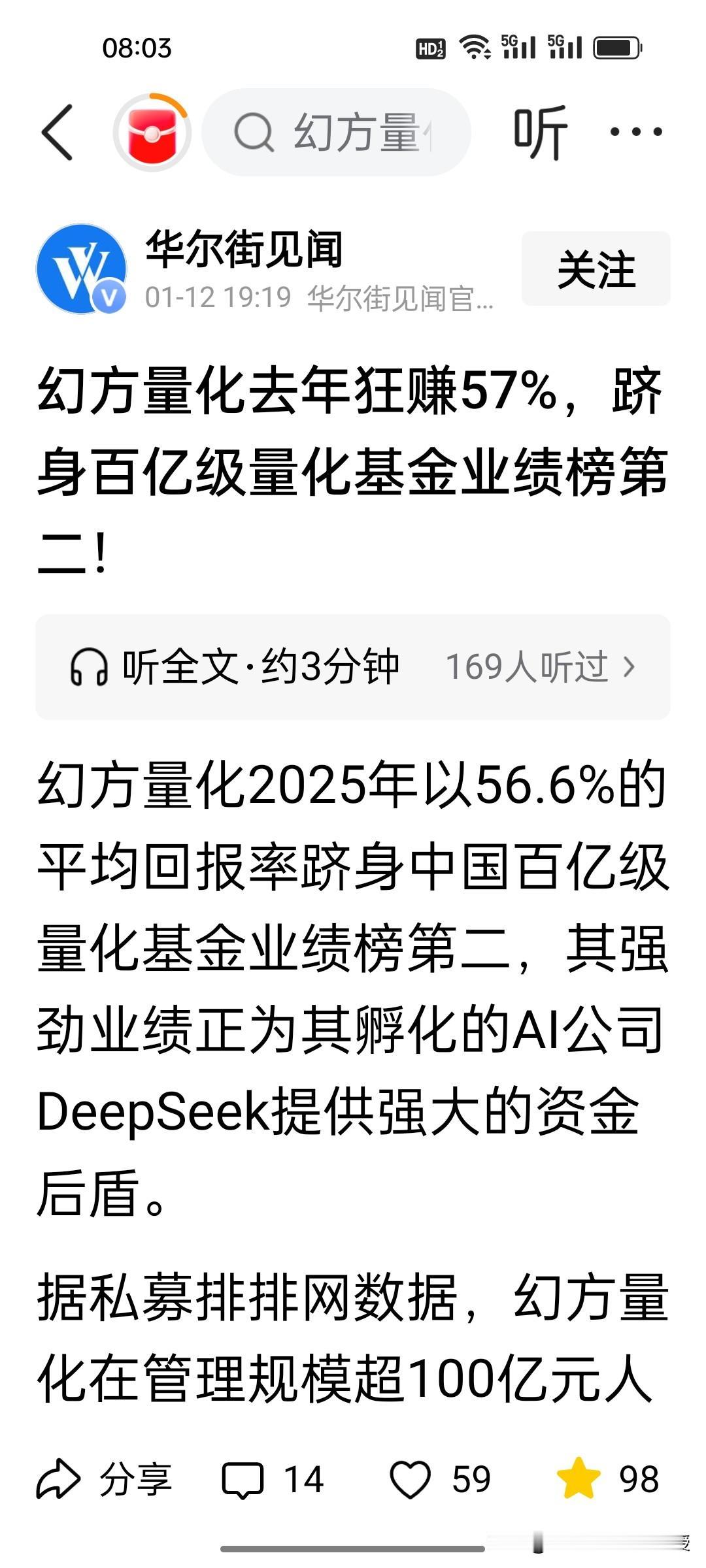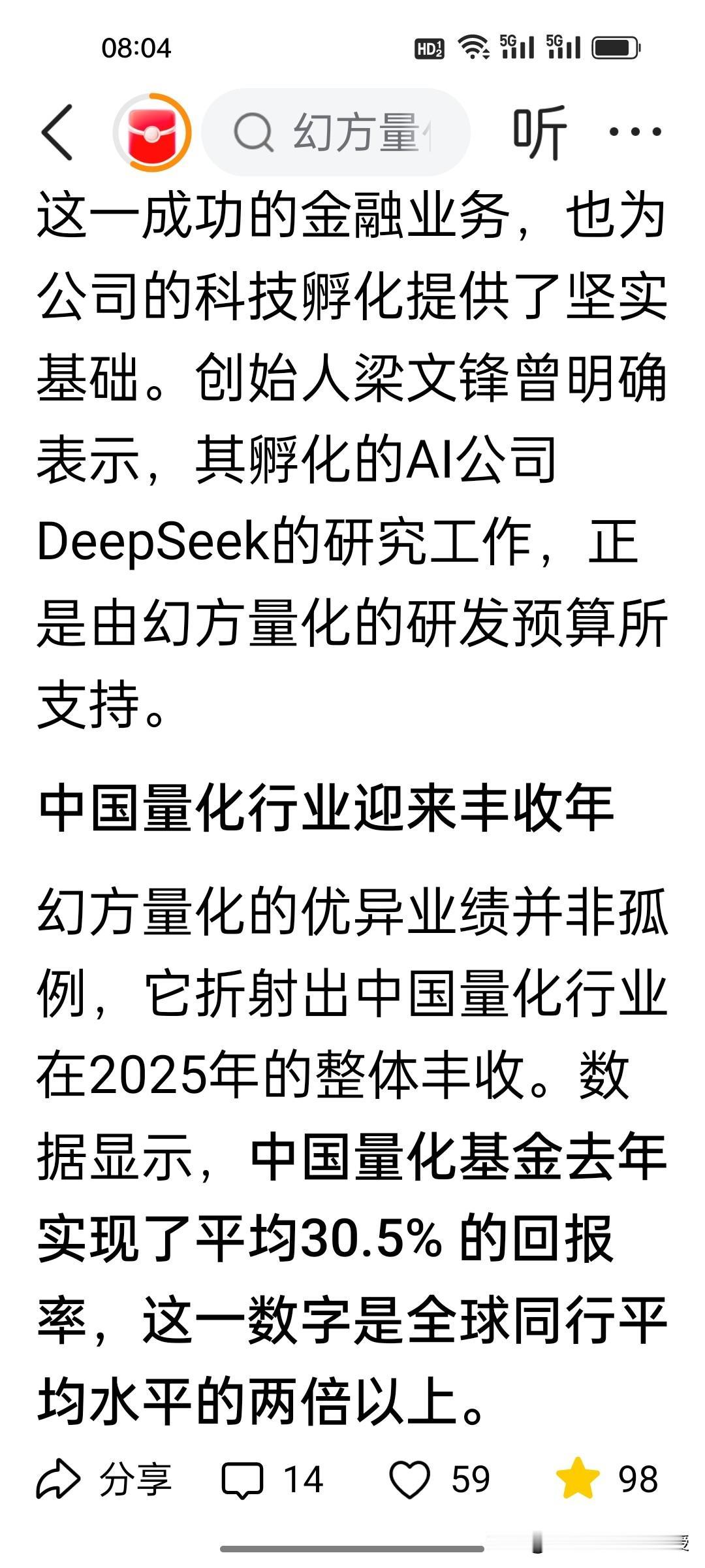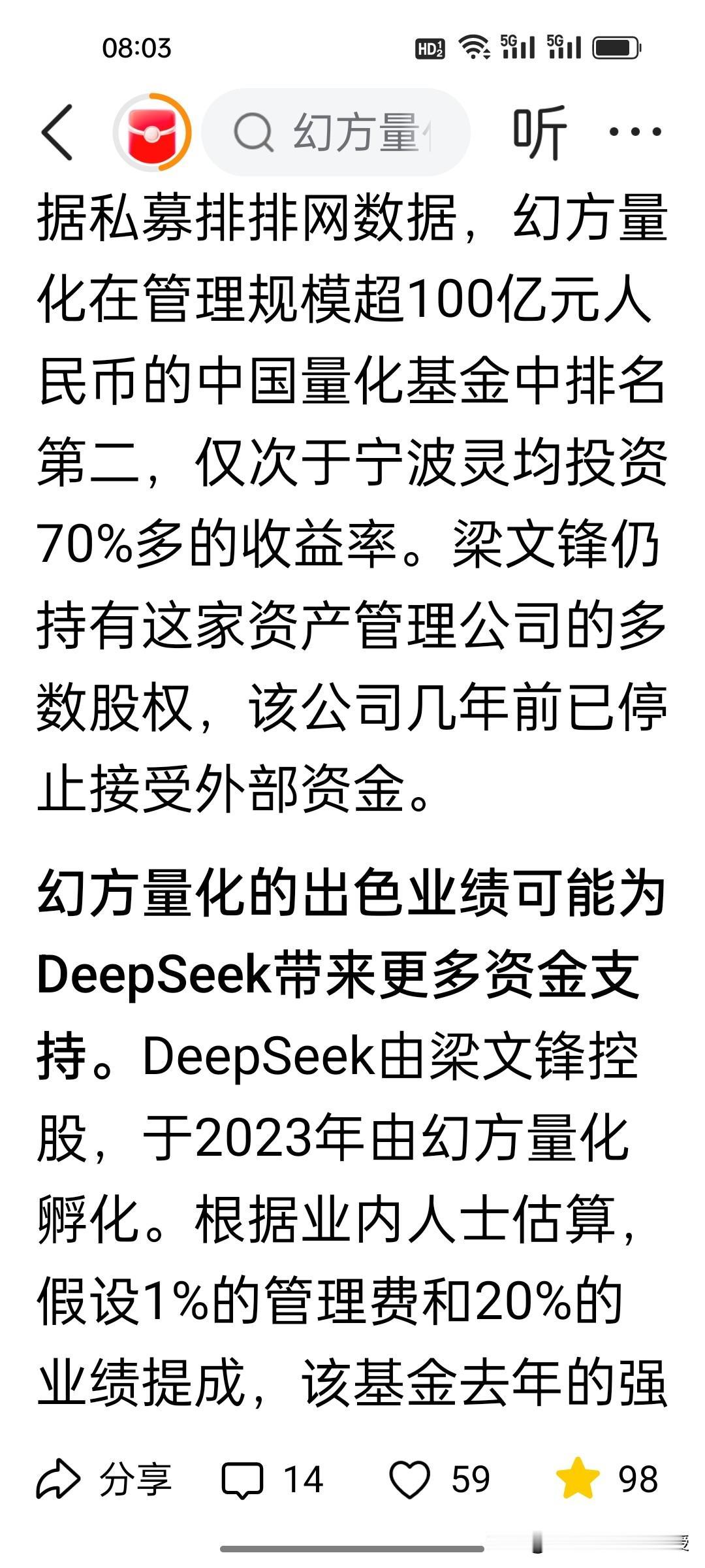 梁文锋自己去年赚了50亿!根据《华尔街见闻》报道,幻方量化去年收益率高达57%,仅次于灵均投资70%,位于百亿私募排行榜第二,根据推算,梁文锋个人能分得的收益在7亿美金左右,大概50亿人民币。中国量化基金去年实现了平均30.5% 的回报率,高于全球平均水平。 根据《福布斯》排行榜,梁文锋已经有800亿身价。而deepseek之前公布的投入预算只有600万美元。可以说用幻方量化赚来的钱投入deepseek的研发是目前的状态,资金也是绰绰有余,梁文锋至今没有接受任何外国资本的投资,也没有移民。这就是在股市赚钱再反哺研发的底气。