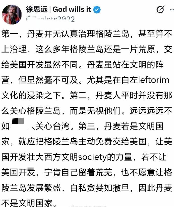 不交格陵兰岛丹麦就不是“文明”国家了! 著名殖人徐思远发文称,因为丹麦不把格陵兰岛双手奉送给美国,所以丹麦不是文明国家。 还列出了三个理由: 第一,丹麦没认真治理格陵兰岛,甚至算不上治理,这么多年格陵兰岛还是一片荒原,交给美国开发显然不同。丹麦虽站在文明的阵营,但显然蠢不可及。尤其是在白左lefortim文化的浸染之下。 第二,丹麦人平时并没有那么关心格陵兰岛,而是无视他们。 第三,丹麦要是文明国家,就应把格陵兰岛主动免费交给美国,让美国开发壮大西方文明社会的力量,要素不让美国开发,宁肯自己留着荒芜,也不愿意让格陵兰岛发展繁盛,自私贪婪如撒旦,因此丹麦不是文明国家。 这就“闭环了”,之前著名学者鲍鹏山就讲过,“不要动不动落后就要挨打,野蛮才会挨打”, 这么看来,丹麦被抢格陵兰岛那一定是因为“不文明”了![看][看]