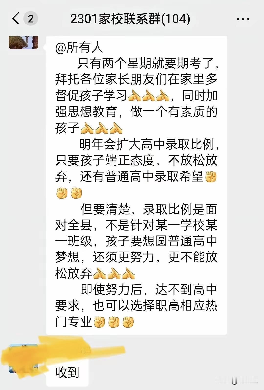 利好消息!这是一位初中班主任的通知,直接给焦虑的初三家长们打了一针“强心剂”! 这位班主任坦言,明年全县高中录取比例将扩大,其中特意提醒,扩招是全县统筹,并非针对某校某班,期末在即,家长仍要督促孩子抓紧学习。 最后,这位班主任说的也很实在,努力后,即使考不上普高,也可以选择职高等热门专业。 所以,各位初中生家长,千万别放松警惕,赶紧借着这股劲儿,陪孩子查漏补缺、稳步冲刺。#寻美三湘# #长沙新朋友#