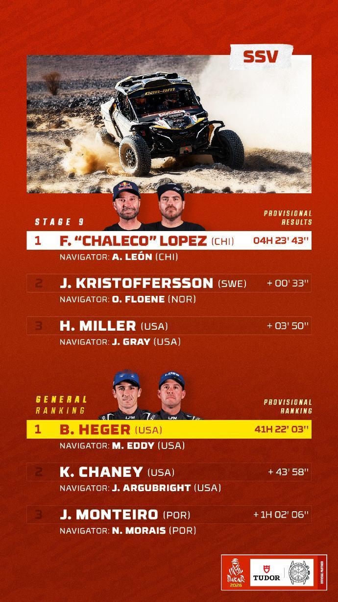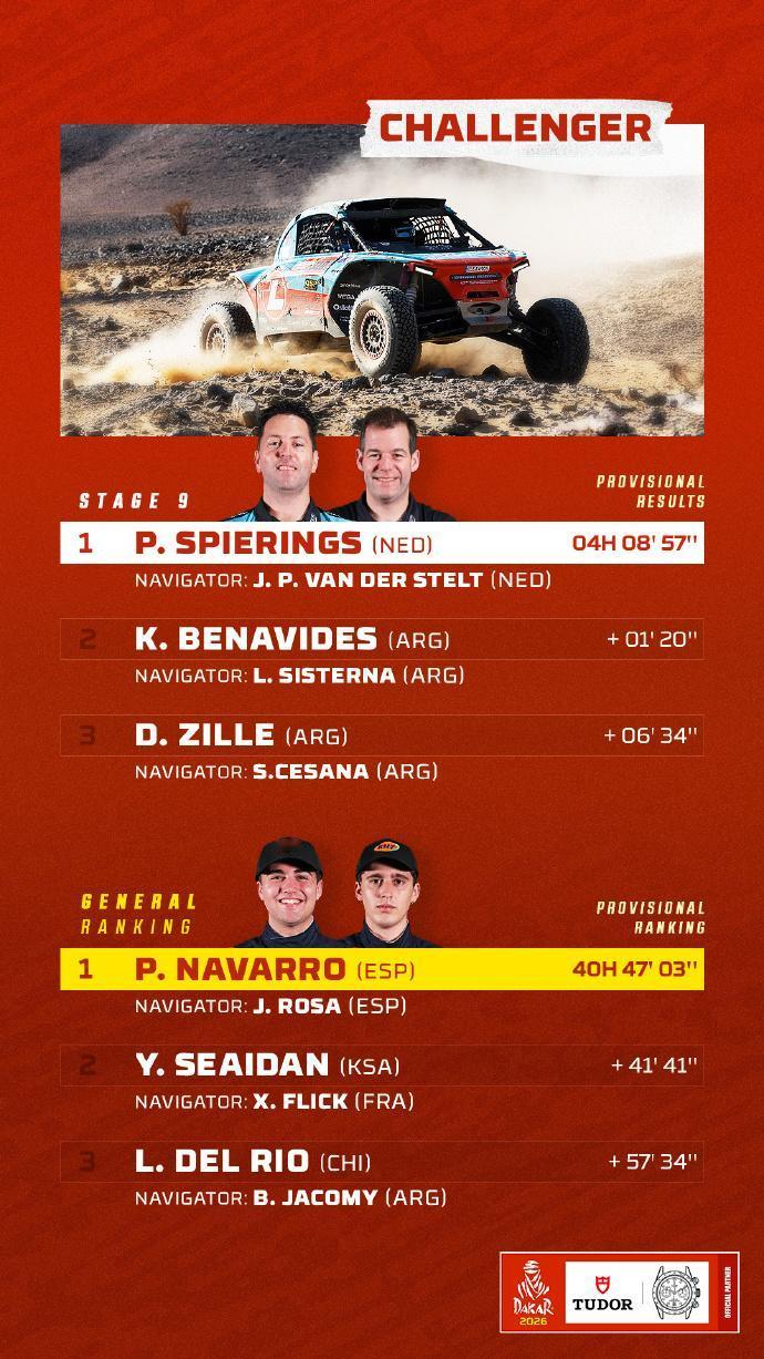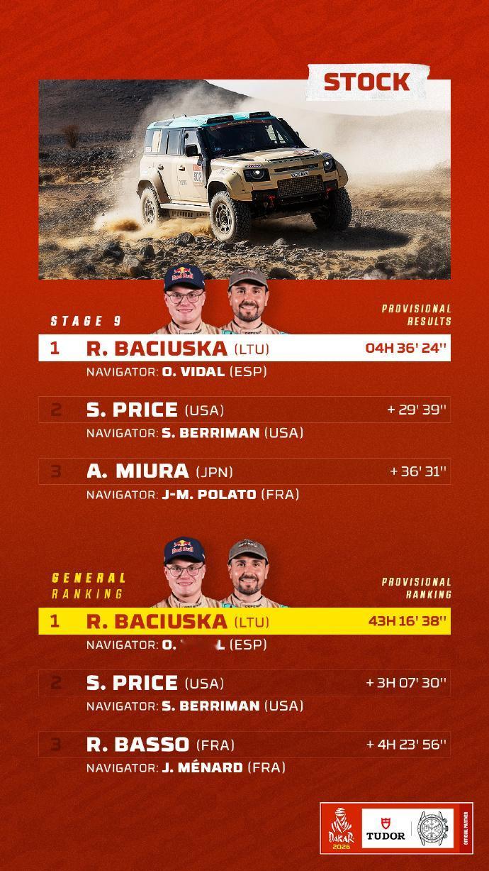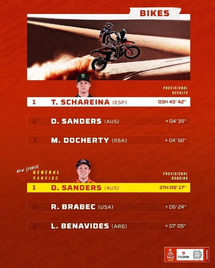 赛车:2026(沙特)达喀尔拉力赛第9赛段 第9赛段介绍: 路线:瓦迪达瓦西尔 ➡️ 露营避难所 🛣🏍 行驶赛段:123公里 - 特殊赛段:418公里 🛣 🚗 行驶赛段:122公里 - 特殊赛段: 410公里 🕒 发车时间(GMT+3) 🏍摩托车组 07:40 🚗汽车组 08:10 北京时间1月13日,2026达喀尔拉力赛结束第9赛段的角逐。 摩托车组方面,多位车手在赛段初期迷路,沙雷纳取得赛段冠军。桑德斯获得赛段亚军后,又一次领跑总成绩榜。布拉贝克和卢西亚诺·贝纳维德斯分列总榜二三。 汽车组方面,埃里克·格扎尔获得赛段胜利。阿尔阿提亚和埃克斯特罗姆因为迷路损失将近30分钟。拉特甘遭遇液压故障还撞碎了挡风玻璃。普罗科普出现了翻车。福特车手罗马和老塞恩斯上到总成绩榜前两名,但第三的阿尔阿提亚只落后1分10秒而已。 6个组别成绩单(TOP3) 🚗 T1+组:埃里克·戈扎尔赛段冠军,罗马领跑总成绩; 🚘量产T2组:萨拉赛段冠军,罗卡斯继续领跑总成绩; 🏍️摩托车组:托沙·沙雷纳赛段冠军,桑德斯领跑总成绩。