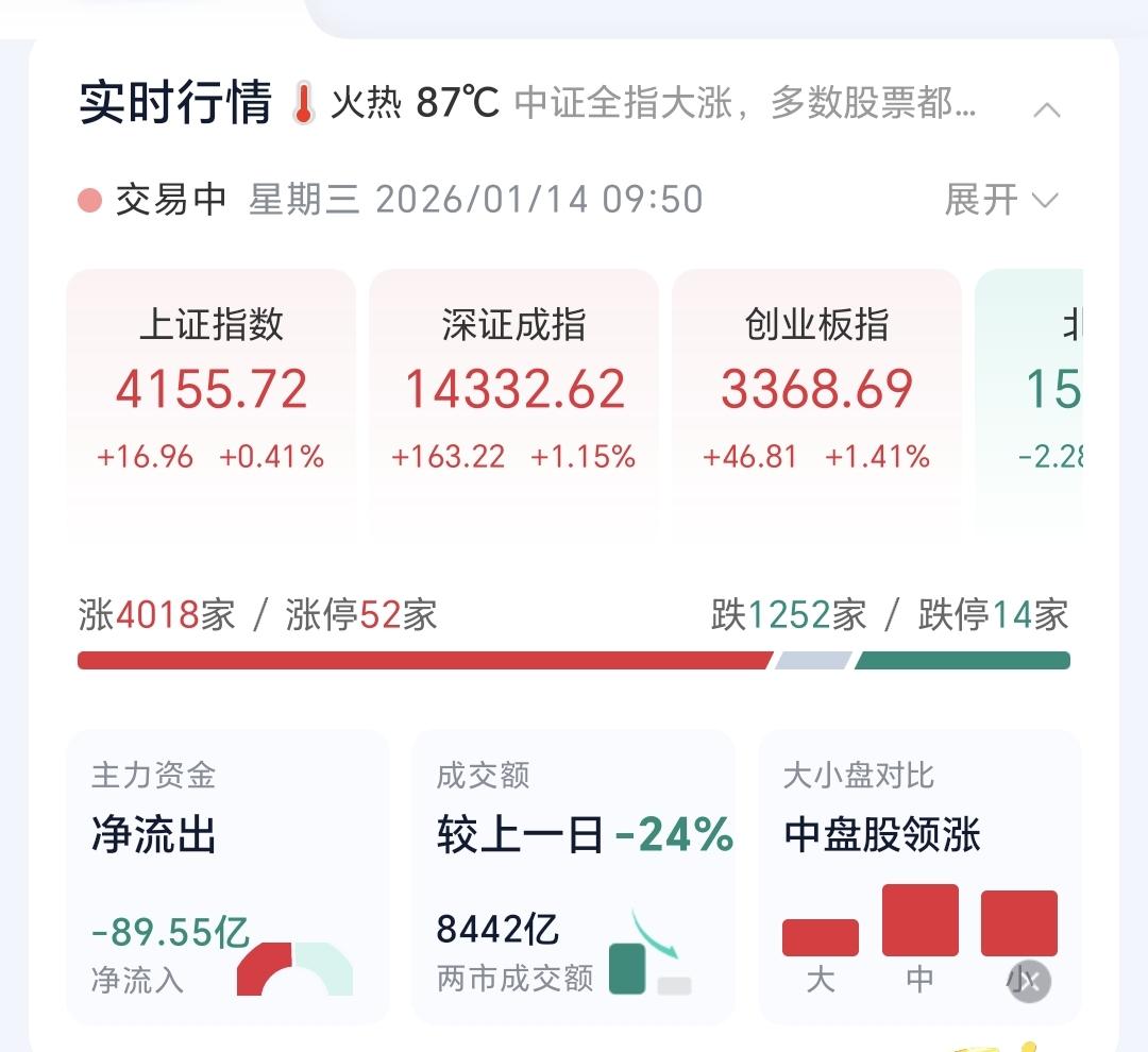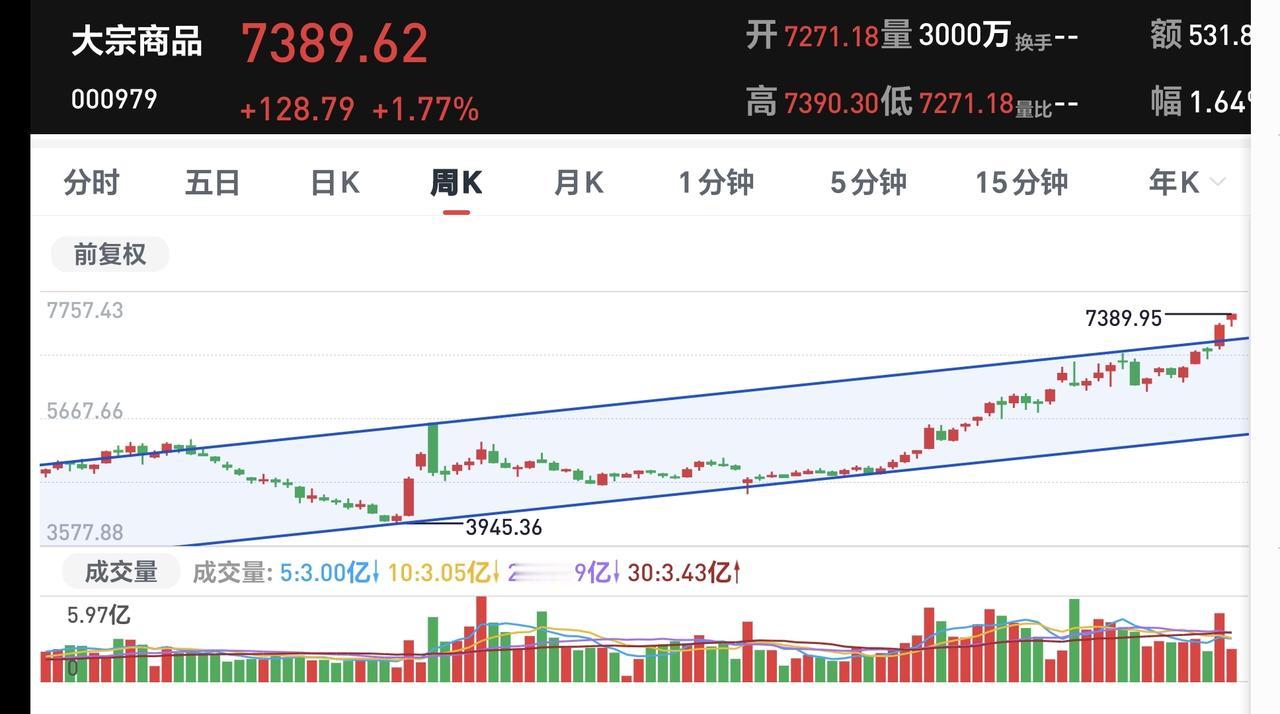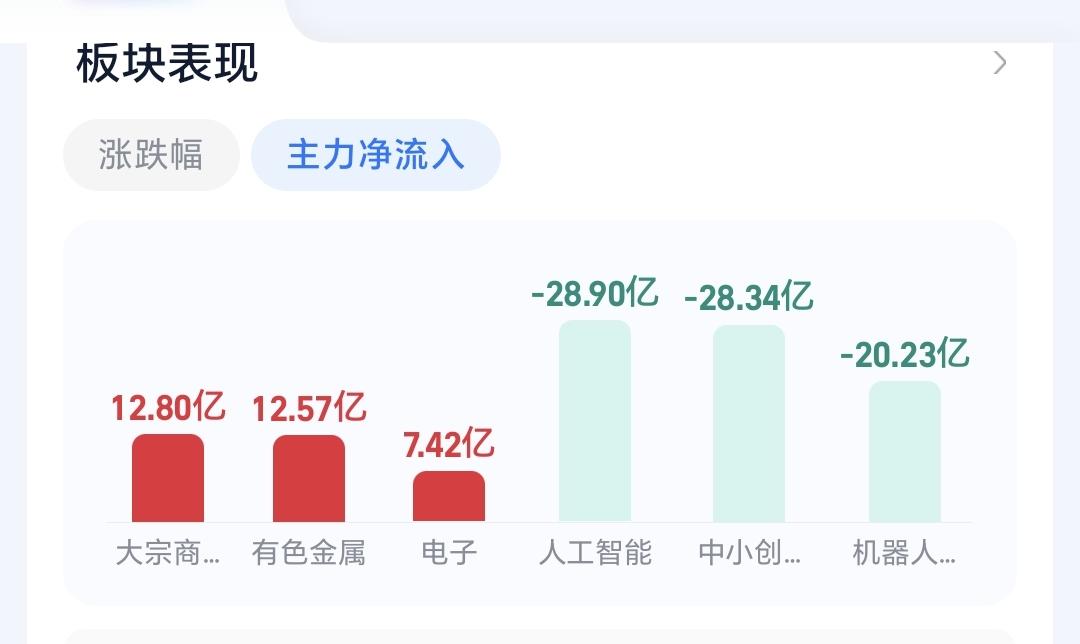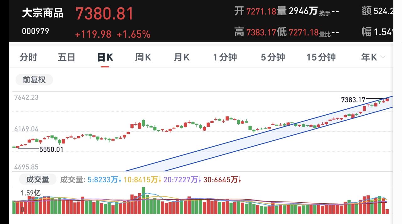 基金:三大指数全线上涨,但存在一个隐患 今天市场开盘的时候涨跌不一,开盘以后全线上涨,创业板指上涨了1.39%,盘中点位3368点,上证指数上涨了0.38%,盘中点位4154点。 今天黄色线在蓝色线上方,两条线之间的敞口比较大,这样的情况下有利于市场继续向上上涨,即使没有大幅度上涨,但大幅度跳水的可能性也不大。 现在两市累计成交8442亿,相比于昨天缩量了24%,是属于大幅度的缩量,这并不是一个好现象,这样的情况之下,虽然黄色线高高在上,但今天大幅度上涨的可能性不大,如果黄色线不能保持住高高在上,还是会有跳水的可能性。 从黄色线位置的角度看,今天有可能会大涨,不会大幅度跳水,从成交量的角度看,今天不会有大涨,还有可能会跳水,所以,综合判断今天没有大涨,也不会有大跌,是一个高位震荡的走势,决定走势变化的是成交量,会不会能有所提高,还有黄色线与蓝色线的位置会不会有变化,成交量的大幅度萎缩是今天市场的一个隐患。 持有的基金中,现在盘中估值下跌的只有军工板块,上涨幅度最大的三个板块是:AI应用板块,可控核聚变板块,证券板块,估值整体上涨了9027元。 我们来看一下下面的截图8,这是主力资金进出板块的情况,主力资金净流入最多的三个板块是:大宗商品板块,有色金属板块,电子板块,主力资金净流出最多的三个板块是:人工智能板块,中小创板块,机器人板块。 我们来看一下今天主力资金净流入最多的大宗商品板块的情况,看下面的截图9,这是大宗商品板块日K线图,从图中可以看出,我画了两条倾斜向上的斜线,这是大宗商品板块日线级别短期上涨通道,现在的位置处于这个上涨通道内,而且距离这个上涨通道的上轨比较近,所以,虽然这个板块处于上涨趋势中,但短线进场还需要等待。 我们来看一下下面的截图10,这是大宗商品板块周K线图,从图中可以看出,我画了两条倾斜向上的斜线,这是大宗商品板块周线级别上涨通道,上周的上涨突破了这个上涨通道的上轨,也就是说,大宗商品板块周线级有可能已经处于加速上涨中,持有的人可以继续持有,除非跌破这个上涨通道的下轨才可以考虑,要不要止盈出来观望。 我每天都会分享我的观点,我的观点只代表我个人的看法,不能作为你操作的依据,据此操作后果自负。