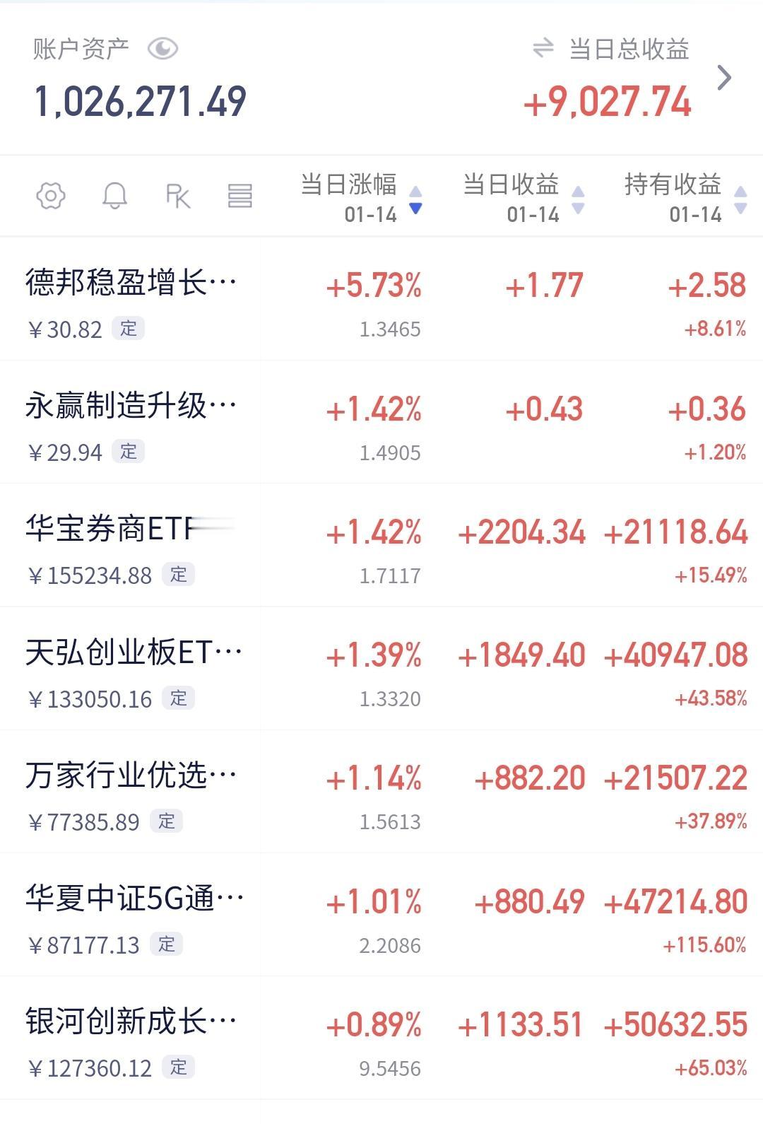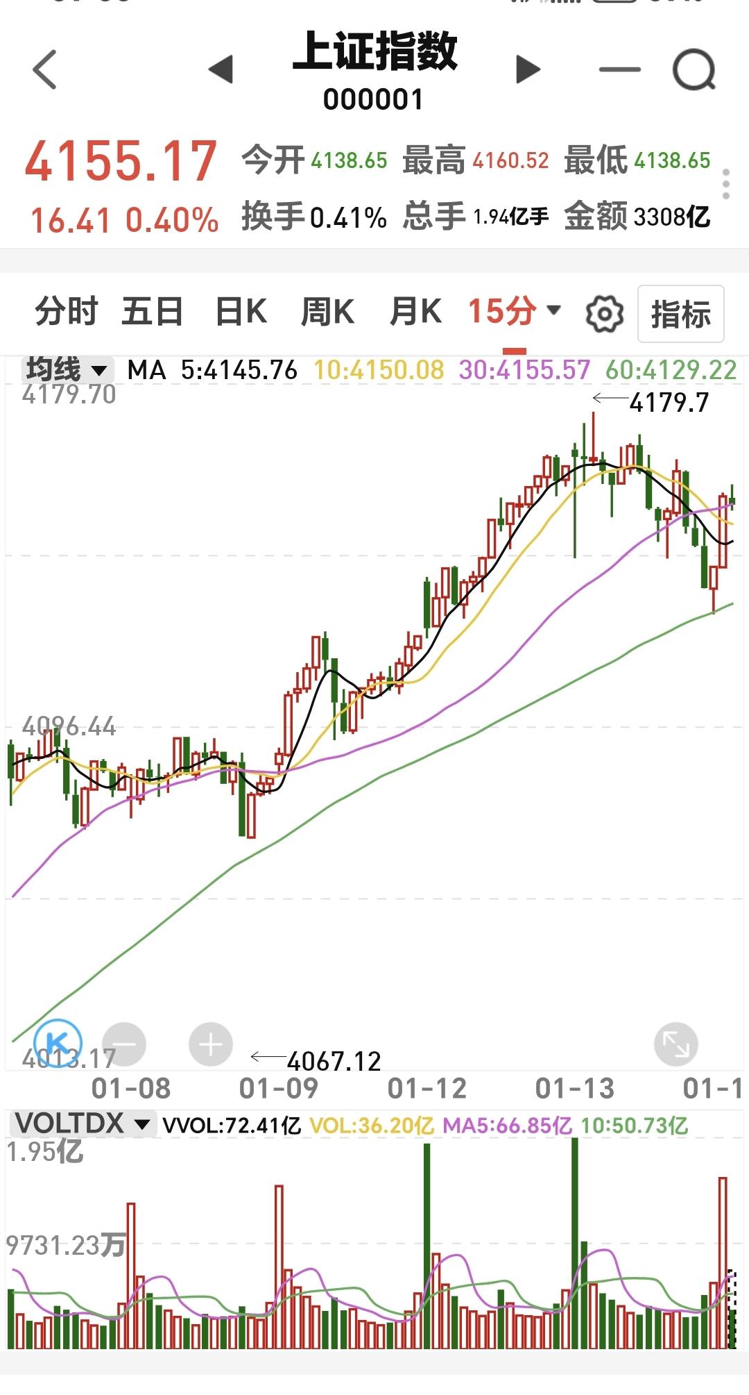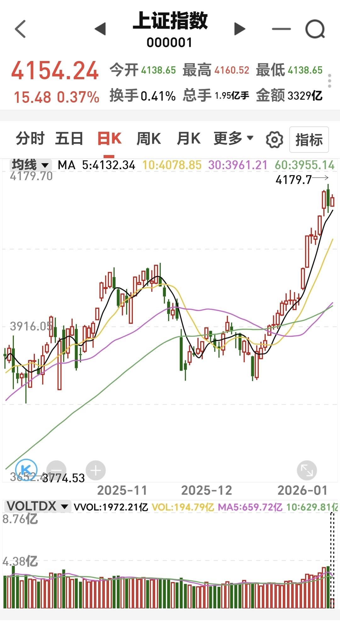 基金:三大指数全线上涨,但存在一个隐患 今天市场开盘的时候涨跌不一,开盘以后全线上涨,创业板指上涨了1.39%,盘中点位3368点,上证指数上涨了0.38%,盘中点位4154点。 今天黄色线在蓝色线上方,两条线之间的敞口比较大,这样的情况下有利于市场继续向上上涨,即使没有大幅度上涨,但大幅度跳水的可能性也不大。 现在两市累计成交8442亿,相比于昨天缩量了24%,是属于大幅度的缩量,这并不是一个好现象,这样的情况之下,虽然黄色线高高在上,但今天大幅度上涨的可能性不大,如果黄色线不能保持住高高在上,还是会有跳水的可能性。 从黄色线位置的角度看,今天有可能会大涨,不会大幅度跳水,从成交量的角度看,今天不会有大涨,还有可能会跳水,所以,综合判断今天没有大涨,也不会有大跌,是一个高位震荡的走势,决定走势变化的是成交量,会不会能有所提高,还有黄色线与蓝色线的位置会不会有变化,成交量的大幅度萎缩是今天市场的一个隐患。 持有的基金中,现在盘中估值下跌的只有军工板块,上涨幅度最大的三个板块是:AI应用板块,可控核聚变板块,证券板块,估值整体上涨了9027元。 我们来看一下下面的截图8,这是主力资金进出板块的情况,主力资金净流入最多的三个板块是:大宗商品板块,有色金属板块,电子板块,主力资金净流出最多的三个板块是:人工智能板块,中小创板块,机器人板块。 我们来看一下今天主力资金净流入最多的大宗商品板块的情况,看下面的截图9,这是大宗商品板块日K线图,从图中可以看出,我画了两条倾斜向上的斜线,这是大宗商品板块日线级别短期上涨通道,现在的位置处于这个上涨通道内,而且距离这个上涨通道的上轨比较近,所以,虽然这个板块处于上涨趋势中,但短线进场还需要等待。 我们来看一下下面的截图10,这是大宗商品板块周K线图,从图中可以看出,我画了两条倾斜向上的斜线,这是大宗商品板块周线级别上涨通道,上周的上涨突破了这个上涨通道的上轨,也就是说,大宗商品板块周线级有可能已经处于加速上涨中,持有的人可以继续持有,除非跌破这个上涨通道的下轨才可以考虑,要不要止盈出来观望。 我每天都会分享我的观点,我的观点只代表我个人的看法,不能作为你操作的依据,据此操作后果自负。