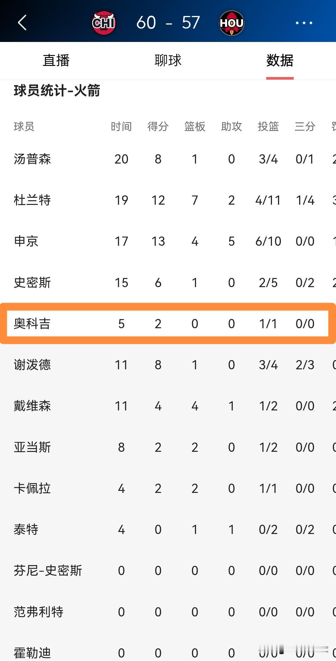 火箭大将奥科吉真是太憋屈了!在今天火箭主场迎战公牛的比赛中,目前双方半场战罢,火箭以57:60落后对手3分。值得一提的是,在前两节比赛中,奥科吉首发出战5分钟,投篮1中1得到2分1抢断,没有出现任何的失误和犯规。 坦白说,当奥科吉在场上的时候,火箭在攻防两端的效果都非常好,可是火箭主帅乌度卡一看奥科吉打得太好就选择了弃用,试问奥科吉在乌度卡手下打球能不憋屈吗?