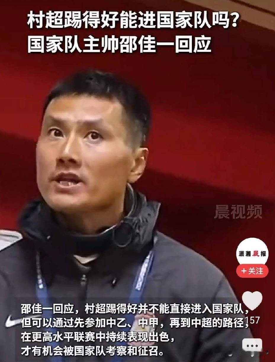 邵佳一高情商回复村超顶尖能否入选国家队,职业再差也非业余可比 近日,国足主帅邵佳一接受采访时回答了一个热度挺高的问题:村超顶尖球员能否进国家队? 这问题看似如玩笑,实则挺尖锐。 村超、苏超如火如荼,当时热度之高能把中超比下去,还引发出诸多热梗。 而国家队则成绩惨淡,纵然世界杯扩军48强,依然出线无门。 两相对比,一个被点赞、一个被抨击,邵佳一若回答不好,很容易引火烧身。 好在这位留洋德甲的少帅情商颇高,并没正面硬怼,用委婉的方式表达了观点。 业余无法取代职业,即便职业再差,也别用兴趣挑战别人的饭碗! 其实这个观点本人在半年前就写过,当时也引发不少网友评论。 很多人曾质疑我的观点,如今总算得到专业人士力挺,层次还不低。 邵佳一这番话多少让我有些扬眉吐气,至少证明我的观点更接近职业领域。 “得先经过中乙、中甲的考验”,邵帅的意思很明确,村超踢得再好,也难比职业。 国足主帅、职业球员出身,他的结论总不会有错了吧? 别看苏超、村超各种集锦很精彩,比赛也很热闹,真跟职业较量,可能过半场都会很难。 毕竟对抗强度、力量、速度、跑位、整体移动等方面,两者都不在同一层面。 即便成绩再差,也是常年专业训练,踢人家国家队不行,还能输给散装足球? 有人可能会抬杠,新加坡不也业余球员? 其实这“业余”并非通常理解的意思,跟村超的球员并不一样。 他们有职业体系,只不过休赛期有些会从事兼职,这可能跟收入有关。 此外,一些媒体刻意误导球迷,故意夸大其词,混淆是非。 所以,真要是一群业余球员比赛,绝对踢不过职业球员。 再退一步讲,即便人家可以做到,但在我们这里不现实。 别急着反对,首先问问自己,跟职业球队踢过比赛吗? 若没跟职业球员们踢过,别听风便是雨罢了。 真较量一下就能明白,职业球员根本没必要使出全力,便能轻松战胜业余。 人家的核心力量、速度、摆脱、跑位,根本不是业余能比。 举个例子,职业球员一发力,由于力量差距太大,普通人都站不住。 等你缓过神,人家早带球过去了,这球还怎么踢? 类似成年人踢孩子,不在一个层面。 邵佳一这话说得一点没错,别因村超、苏超火爆,下意识觉得他们厉害。 外行看热闹、内行看门道,我们的职业水平确实不太行,但碾压业余很轻松。 所以邵佳一听完这问题也笑了,因为这问题本身就很业余。 职业是职业,业余是业余,别混为一谈。 球迷开开玩笑可以,当真就傻了。 当然真要无所谓成绩,有人参加就行,那安排业余也可以。 但这现实吗? 不过从全民体育角度讲,村超和苏超意义重大,职业足球不是每个人都能玩,但业余比赛可以。 这样的比赛一多,能把全国足球氛围提起来,肯定有利于足球发展。 我们得辩证看问题,肯定村超,但别混淆职业。