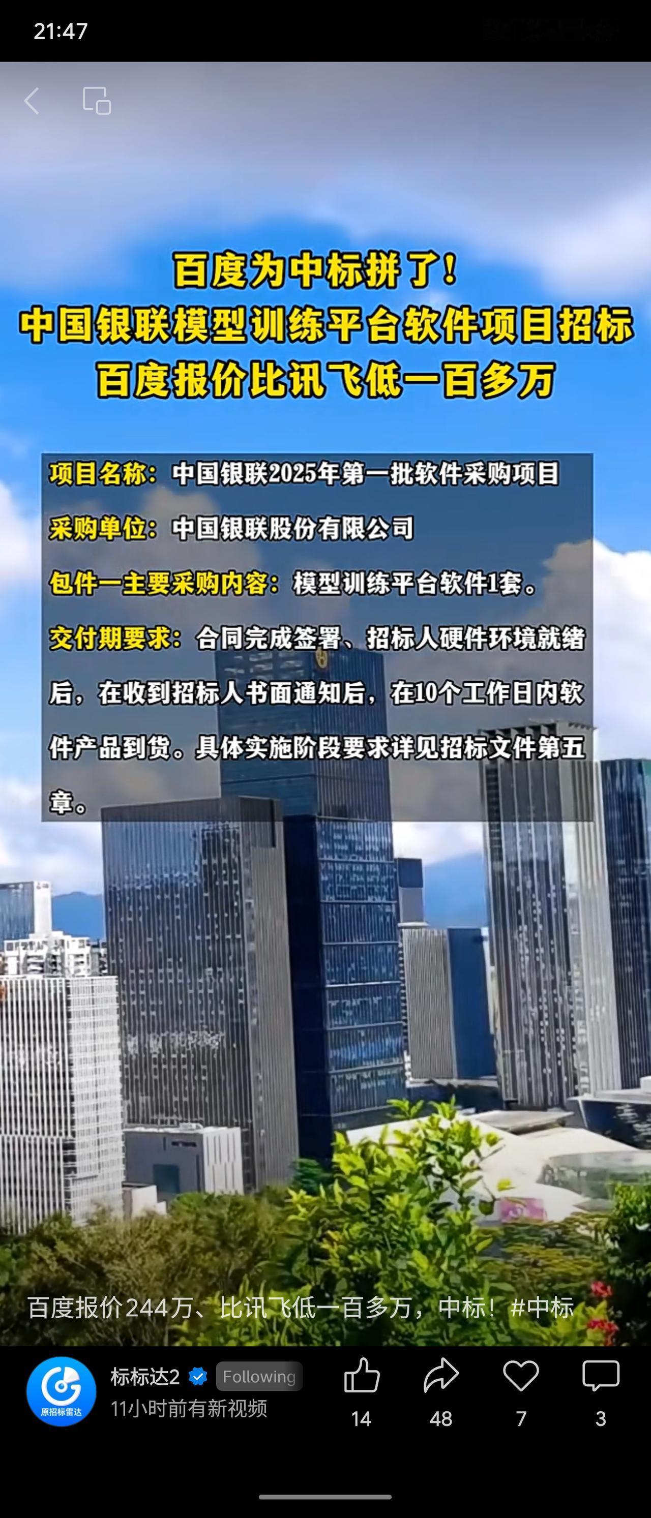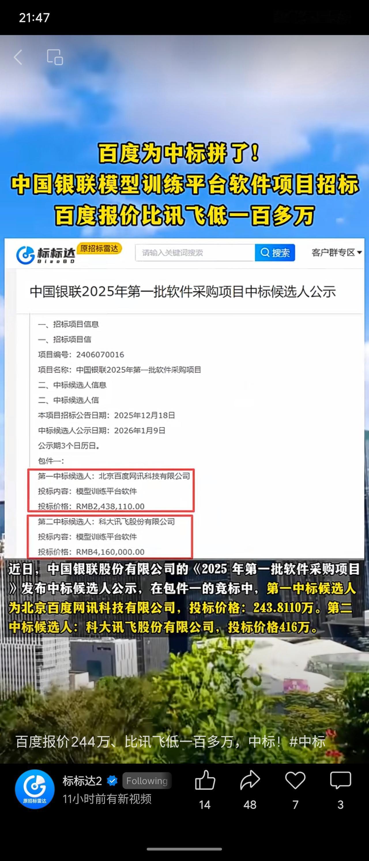 在中国银联的模型训练平台软件项目招标中,百度以约244万元的报价中标,其出价显著低于竞争对手科大讯飞的416万元,差价超过170万元。