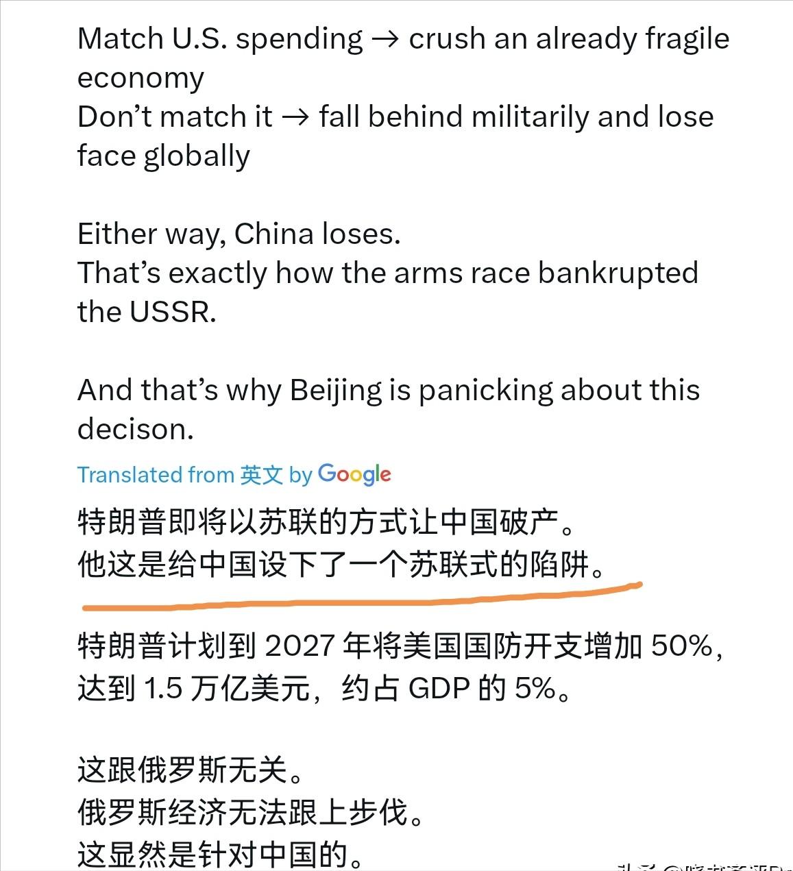 怪不得日本右翼分子不怕我们!在特朗普推出1.5万亿美元的国防开支预算之后,一位日本右翼分子博主写到,特朗普即将以苏联的方式让中国破产。他这是给中国设下了一个苏联式的“陷阱”。特朗普计划到2027年将美国国防开支增加50%,达到1.5万亿美元,约占GDP的5%。这跟俄罗斯无关。俄罗斯经济无法跟上步伐。这显然是针对中国的。 根据公开信息,这比美国2026年刚获批的9010亿美元军费足足涨了50%,特朗普还在社交平台上吹嘘要靠这笔钱打造“梦想军队”。 从数据上看确实吓人,瑞典斯德哥尔摩国际和平研究所都提到,这额度堪比冷战巅峰期的美国军费水平。 而且明眼人都能看出来,这钱主要不是针对俄罗斯的——毕竟俄罗斯经济实力有限,根本跟不上这种军费竞赛的节奏。 特朗普政府的《临时国防战略指导意见》早就把话说透了,把中国称作“唯一步步紧逼的威胁”,还明确要把战略重心转向印太地区,这1.5万亿军费的针对性不言而喻。 日本右翼拿苏联当例子,纯属找错了参照。当年美国靠军备竞赛拖垮苏联,是因为苏联经济结构畸形,把大量资源都砸在了军事上,民生和轻工业长期滞后。 但中国和当年的苏联完全不一样,我们的经济根基是完整且多元的,既有强大的工业体系,又有庞大的国内市场,军费支出一直保持在合理范围,从来不会为了竞赛而牺牲民生和发展。 特朗普的军费计划本身就充满了内部矛盾,能不能落地还两说。美国现在财政赤字问题本就突出,2026财年军费已经突破1万亿美元,再往上加到1.5万亿,钱从哪来? 特朗普说靠加征关税,但这种做法已经让美国国内企业和民众承压,还引发了盟友不满。更别说美国军工产业早就达产能极限,熟练工人短缺,就算有了钱,也未必能造出那么多装备。 再看日本右翼的叫嚣,本质上还是“狐假虎威”的心态。他们觉得抱住美国的大腿,就能在对华问题上硬气起来,但却没看清美国的真实算盘。 特朗普政府之所以急着提升军费、拉拢盟友,是因为美国的全球影响力在下滑,想靠军事威慑维持霸权。 之前美国就逼着欧洲盟友把军费提到GDP的5%,现在又在亚太拉拢日本、菲律宾等国,说白了就是想让盟友出钱出力气,自己坐收渔利。 可这种捆绑式的联盟根本不牢靠,美国动辄对盟友挥舞关税大棒,连日本企业都没能幸免,长期下来只会侵蚀盟友关系。 日本右翼所谓“特朗普让中国破产”的言论,不过是自欺欺人的幻想。中国的发展韧性和战略定力,不是靠一场军备竞赛就能撼动的。我们始终坚持走和平发展道路,国防建设是为了维护国家主权和领土完整,而不是搞军备竞赛。 反观美国,盲目扩张军费只会加剧国内财政负担,透支国家实力,美国《福布斯》杂志都直言,这样的高军费只会削弱美国国力。 那些跟着美国起哄的日本右翼,与其幻想靠外部势力施压,不如认清时代大势——霸权主义早已行不通,合作共赢才是主流,逆势而为最终只会搬起石头砸自己的脚。