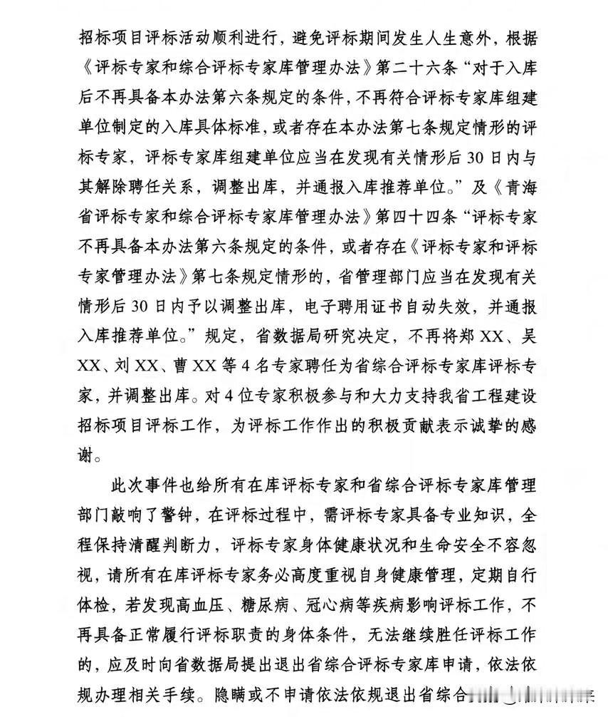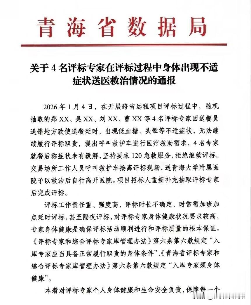 新华网、央广网等权威媒体消息,2026年1月13日,青海省数据局在青海省公共资源交易网发布一则通报,披露了1月4日跨省远程项目评标中的一起特殊事件,四名评标专家因身体不适中断评标,后续也迎来了从业资格的调整。 1月4日的评标现场,随机抽取的四位评标专家正参与跨省远程项目的评审工作。送餐员送错地点的意外,让现场的送餐环节出现了延时,这也成为了后续一系列情况的起因。 就餐延迟后,四位专家相继出现了低血糖、头晕的身体不适症状。身体的异样让他们无法继续端坐评标席,履行评审的工作职责,也让原本有序的评标流程暂时停摆。 事出突然,现场工作人员第一时间响应专家的需求,为其安排了就餐。只是就餐结束后,四位专家均表示身体的不适症状并未得到缓解。 “坚持要求120急救服务,拒绝继续评标。” 这是四位专家在身体不适未缓解后,向现场工作人员明确提出的诉求,也是他们当时最直接的选择。 现场工作人员随即按照流程呼叫了救护车,四位专家被救护车接离评标现场,送往青海大学附属医院接受专业的救治,而这一次的送医,也让他们在救治后自行离开了医院。 事以密成,语以泄败。评标工作的推进容不得长时间的停滞,项目招标人在第一时间启动了应急措施,重新补充抽取了评标专家,这场被中断的评标工作,也在新的专家团队到位后顺利完成。 青海省数据局在通报中也明确了评标工作的特性,这是一项责任重、强度高的工作,评标时长本就没有固定标准,参与的专家时常需要加班加点延时评标,甚至会出现隔夜评标的情况,对专家的身体健康状况,自然也有着较高的要求。 《评标专家和综合评标专家库管理办法》中,早已明确入库专家应当具备正常履行职责的身体条件,青海省的本地管理办法,也对专家的身体健康作出了硬性规定。 本着对评标专家个人身体健康和生命安全负责的态度,也为了保障每一个招标项目评标活动的顺利进行,避免评标期间发生人身意外,青海省数据局依据相关管理办法的规定,作出了最终的处理决定。 不再将这四位专家聘任为青海省综合评标专家库的评标专家,同时将其从专家库中调整出库,这份通报,也让四位专家的评标从业之路,在青海画上了句号。 青海省数据局也在通报中提及,对四位专家此前积极参与和大力支持青海省工程建设招标项目评标工作的付出,以及为评标工作作出的积极贡献,表达了诚挚的感谢。 千钧将一羽,轻重在平衡。评标工作的推进,既需要专家的专业素养加持,也离不开健康的身体作为支撑,二者的平衡,才是评标工作有序开展的关键。