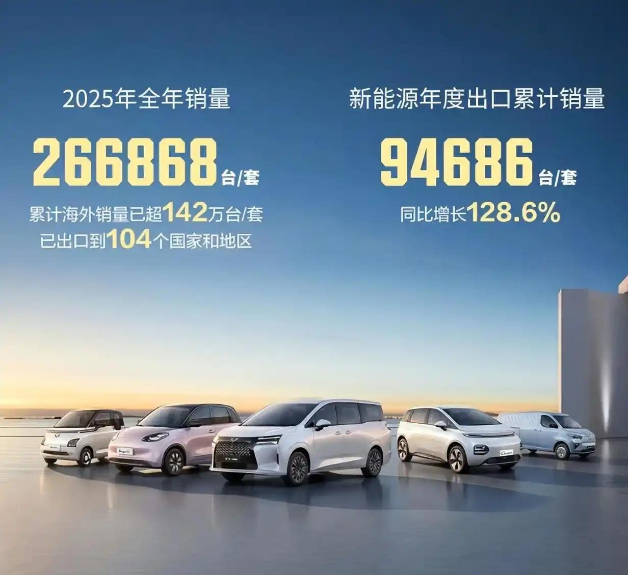 官方数据显示,2025年,上汽通用五菱全年销量1635066辆,同比增长6.2%。 五菱的销量,主要由主打商用系列的五菱红标(577886辆)、主打乘用车的五菱银标(741310辆)以及宝骏品牌(49002辆)构成。 其中,新能源销量达到1000066辆,同比增长31.9%,首次突破百万辆。 海外出口266868辆,同比增长18.6%,这是五菱连续10年海外销量实现增长;其中,新能源出口94686辆,同比增长128.6%。 实际上,如果看上汽通用五菱的累计数据,会更加惊人。