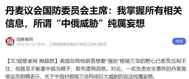 头脑终于清醒了,丹麦国防委员主席开口:所谓的中俄威胁纯属妄想,全世界人民都知道特朗普只是以中俄威胁为由想抢占格陵兰岛而已。 这位美国前总统对格陵兰岛的执念可不是一时兴起,2026 年 1 月短短十天里,他就连续四次强硬表态要 “拿下格陵兰岛”,一会儿说要花钱购买,一会儿又放话动用美军 “始终是一个选项”,把国际政治当成了自家生意谈判,态度强硬到连北约盟友的关系都不在乎。 全世界都看得明白,所谓 “中俄威胁” 就是个站不住脚的借口,丹麦自己也清楚,真要让美国把格陵兰岛拿走,不仅自己的主权受损,整个北约的互信基础都可能崩塌,所以丹麦首相直接警告,任何动武企图都可能让北约走向终点。 而欧盟这边更是坐不住了,格陵兰岛虽然是丹麦自治领地,但对欧盟的战略意义非同一般,岛上有欧盟认定的 34 种关键矿产中的 31 种,是欧盟关键资源供应的重要潜力地,欧盟甚至计划把 2028 到 2034 年对格陵兰岛的拨款增加到 5.3 亿欧元,比之前翻了一倍还多。 可面对美国的强硬施压,欧盟在军事上帮不上太多忙,只能另寻出路,而中国就成了他们不得不争取的力量。 这也就有了欧盟对中国电动车政策的 180 度大转弯,之前还拿着所谓 “产能过剩” 的理由对中国电动车发起调查、酝酿关税制裁,现在却一改之前的打压姿态,在 2026 年 1 月 12 日与中国达成共识,发布指导文件允许中国车企提交价格承诺申请,相当于变相取消了打压措施。 欧盟这么做可不是突然良心发现,而是现实需求摆在那,中国电动车在欧洲市场的分量早已不容忽视。 2024 年数据显示,欧盟进口的电动汽车中 55% 都来自中国,远超韩国、日本和美国,而中国电动车的价格优势更是明显,国际能源署报告显示,2024 年中国 39% 的电动汽车售价低于 2.5 万美元,欧洲同类车型却只占 3%。 对于正在推进绿色转型的欧盟来说,中国电动车不仅能满足欧洲民众对平价零排放车辆的需求,更是其能源转型产业链上不可或缺的一环,真要是彻底打压,受损的还是欧洲自己的企业和消费者。 反观丹麦,作为格陵兰岛的宗主国,之前在一些国际议题上偶尔会跟着西方阵营对中国说三道四,但真遇到美国这个 “盟友” 的强硬索取,才发现光靠自己根本扛不住。 其实中丹之间本就有不错的合作基础,2024 年两国双边贸易额达到 154.6 亿美元,同比增长 12.8%,中国还是丹麦在亚洲最大的贸易伙伴,可丹麦之前的一些反中操作,说白了就是没看清现实。 现在欧盟都主动向中国释放友好信号,希望请中国从中周旋,本质上就是认可了中国的实力和国际影响力。 这个世界终究是靠实力说话的,格陵兰岛的争端把这点体现得淋漓尽致。 美国仗着自己实力强,就想把别人的领土当成商品买卖,甚至不惜动用军事威胁;欧盟之前还想给中国设置贸易壁垒,现在为了保住自身利益,只能放下身段寻求合作;而丹麦这样的小国,要是看不清大势,跟着别人盲目反中,最后受损的还是自己。 毕竟在国际舞台上,实力差距就摆在那,就像大象和蚂蚁,真要硬碰硬,吃亏的肯定是弱小的一方,与其做些不切实际的对抗,不如好好维护合作关系,这才是长久之道。