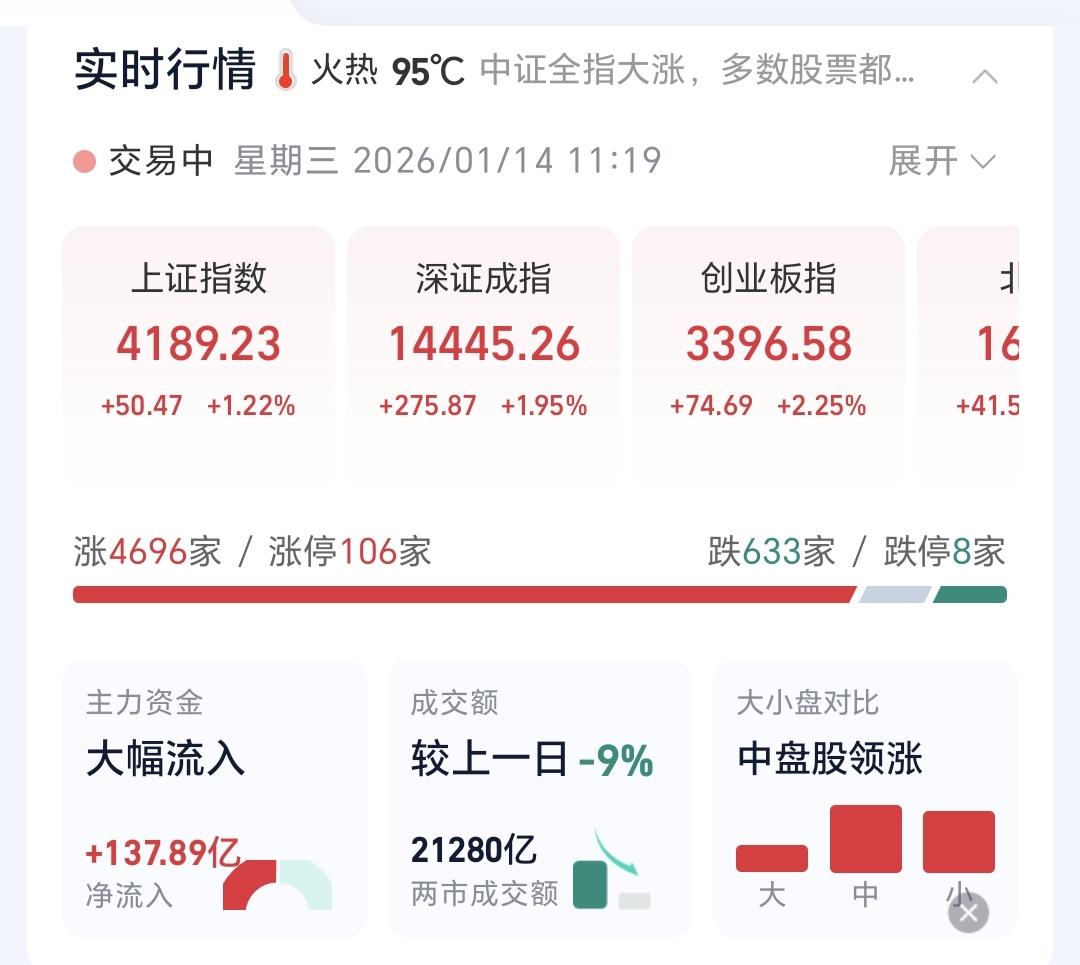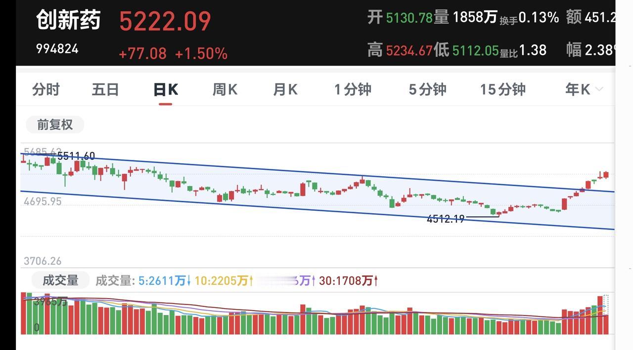 基金:创新药板块应该怎么办 市场指数继续创新高,在爬升的过程当中,成交量缓慢放大,创业板指上涨了2.18%,盘中点位3394点,上证指数上涨了1.16%,盘中点位4186点。 只要黄色线能够在蓝色线上方,只要黄色线能够保持在高高在上,上涨的过程中就不需要过分担心跳水,即使跳下去也会拉回来,在两次累计成交21280亿,相比于昨天同期缩量了9%,这样的缩量幅度是在正常的范围之内。 我们来看一下下面的截图6,这是主力资金进出板块的情况,主力资金净流入最多的三个板块是:大科技板块,蓝筹策略板块,信息技术板块,主力资金净流出最多的三个板块是:机器人板块,中小创板块,5G板块。 持有的基金中,现在盘中估值全部都是上涨,上涨幅度最大的三个板块是:AI应用板块,可控核聚变板块,芯片半导体板块,上涨幅度最小的三个板块是:白酒板块,大消费板块,医疗板块,估值整体上涨了16815元。 创新药板块今天也是上涨,现在盘中估值上涨了0.53%,这是连续第8个交易日上涨,持有人数在所有的板块中排名第8位,这个板块中的散户也是不少,见下面的截图9。 我们来看一下下面的截图10,这是创新药板块日K线图,从图中可以看出,我画了两条倾斜向下的斜线,这是创新药板块日线级别下跌通道,上周四的上涨突破了这个下跌通道的上轨,然后是一直上涨到现在,也就是说,创新药板块日线级别下跌趋势有可能已经被改变,持有的人可以继续持有。 我们来看一下下面的截图11,这是创新药板块周K线图,从图中可以看出,我画了两条倾斜向上的斜线,这是创新药板块周线级别上涨通道,前段时间跌破了这个上涨通道的下轨,上周的上涨又回到了这个上涨通道中,现在是在通道内继续上涨,也就是说,创新药板块现在是上涨趋势中,持有的人可以继续持有,除非再次跌破这个上涨通道的下轨,才可以考虑要不要止盈出来观望。 创新药板块的日线级别下跌趋势已经被改变,周线级别又回到了上涨趋势中,持有的人可以继续持有,除非这两个条件被改变。 我每天都会分享我的观点,我的观点只代表我个人的看法,不能作为你操作的依据,据此操作后果自负。
