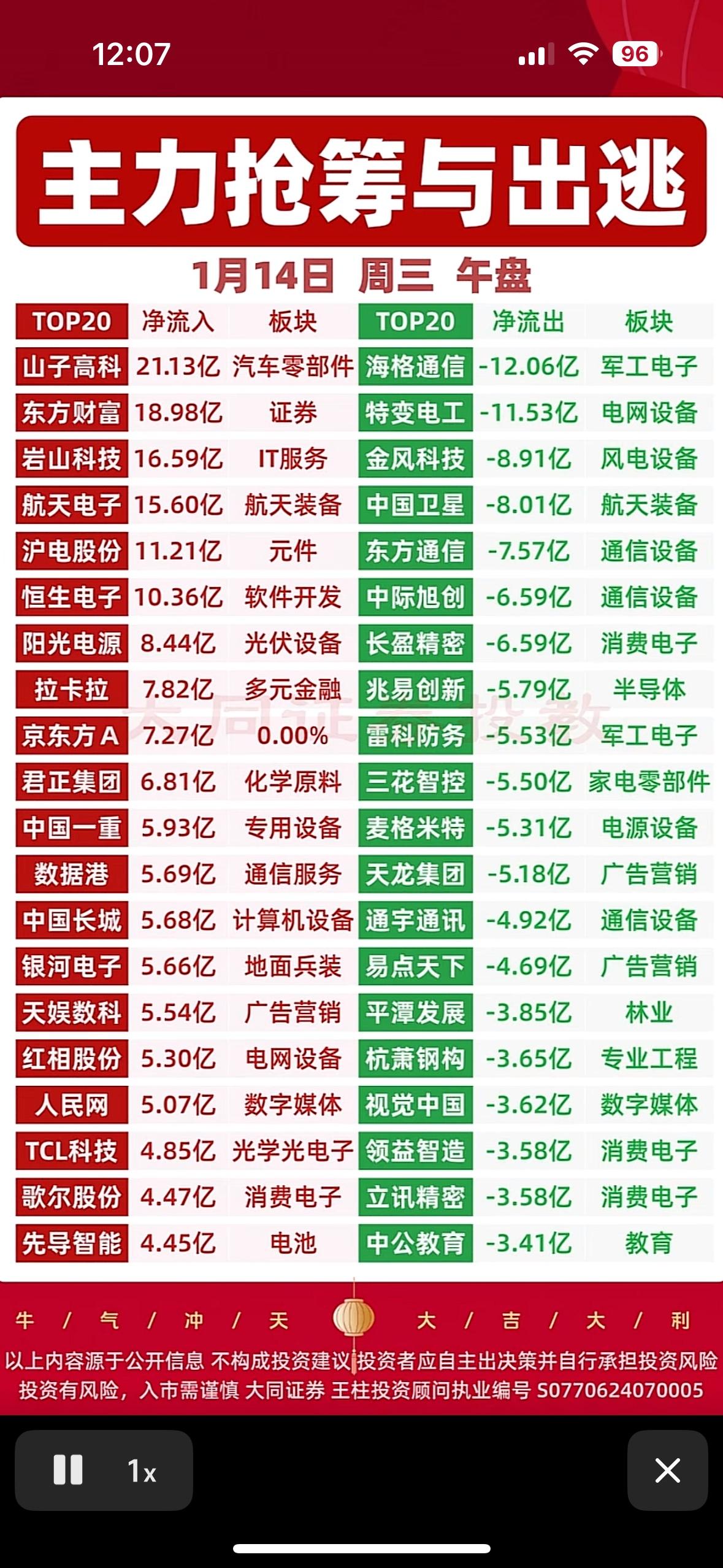 主力抢筹与出逃,1月14日午盘TOP20分析 主力资金动向:汽车零部件、证券获抢筹,军工电子、电网设备遭抛售,板块分化明显,投资需谨慎。