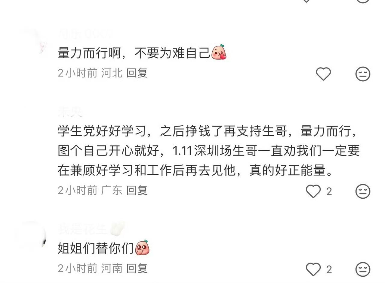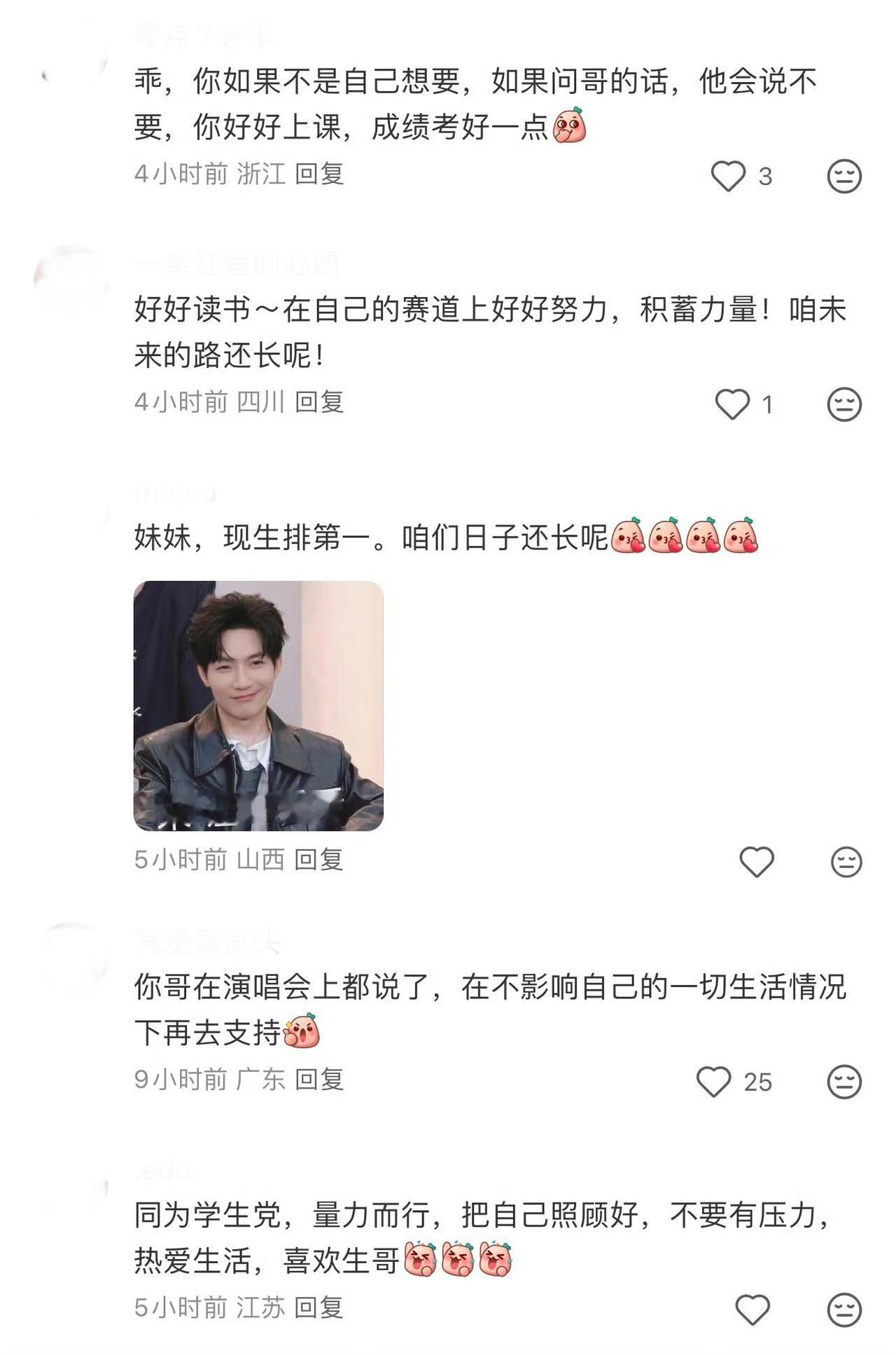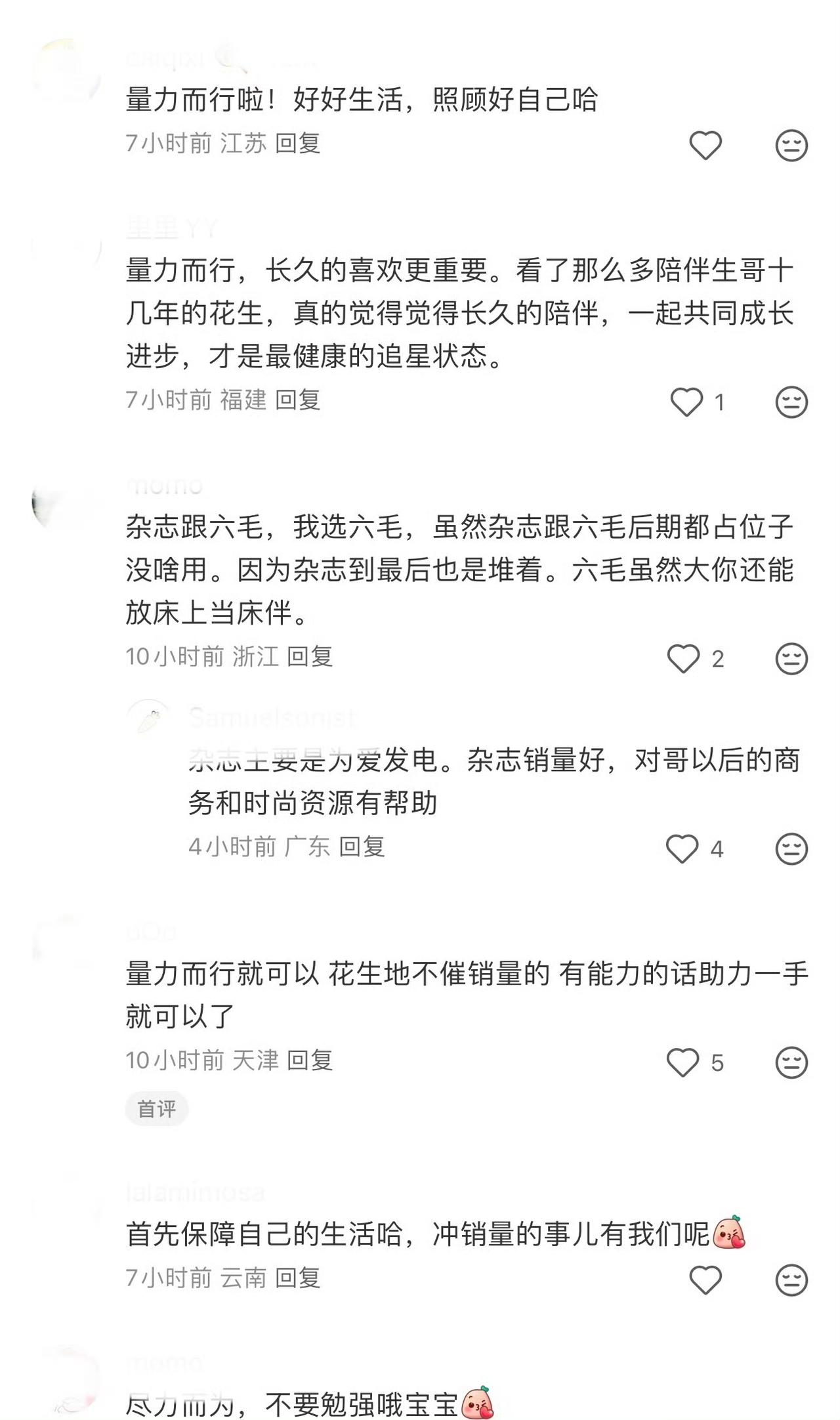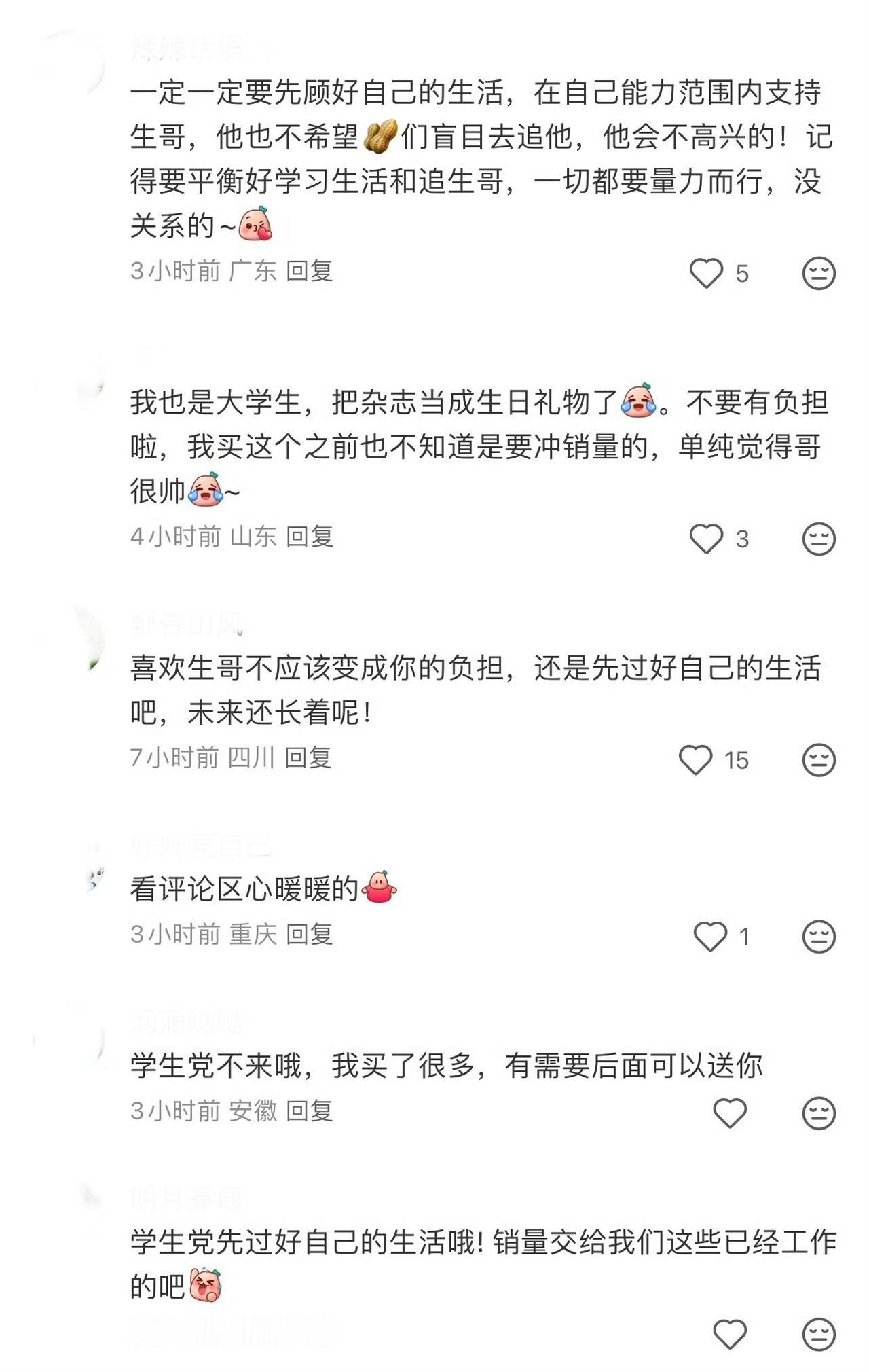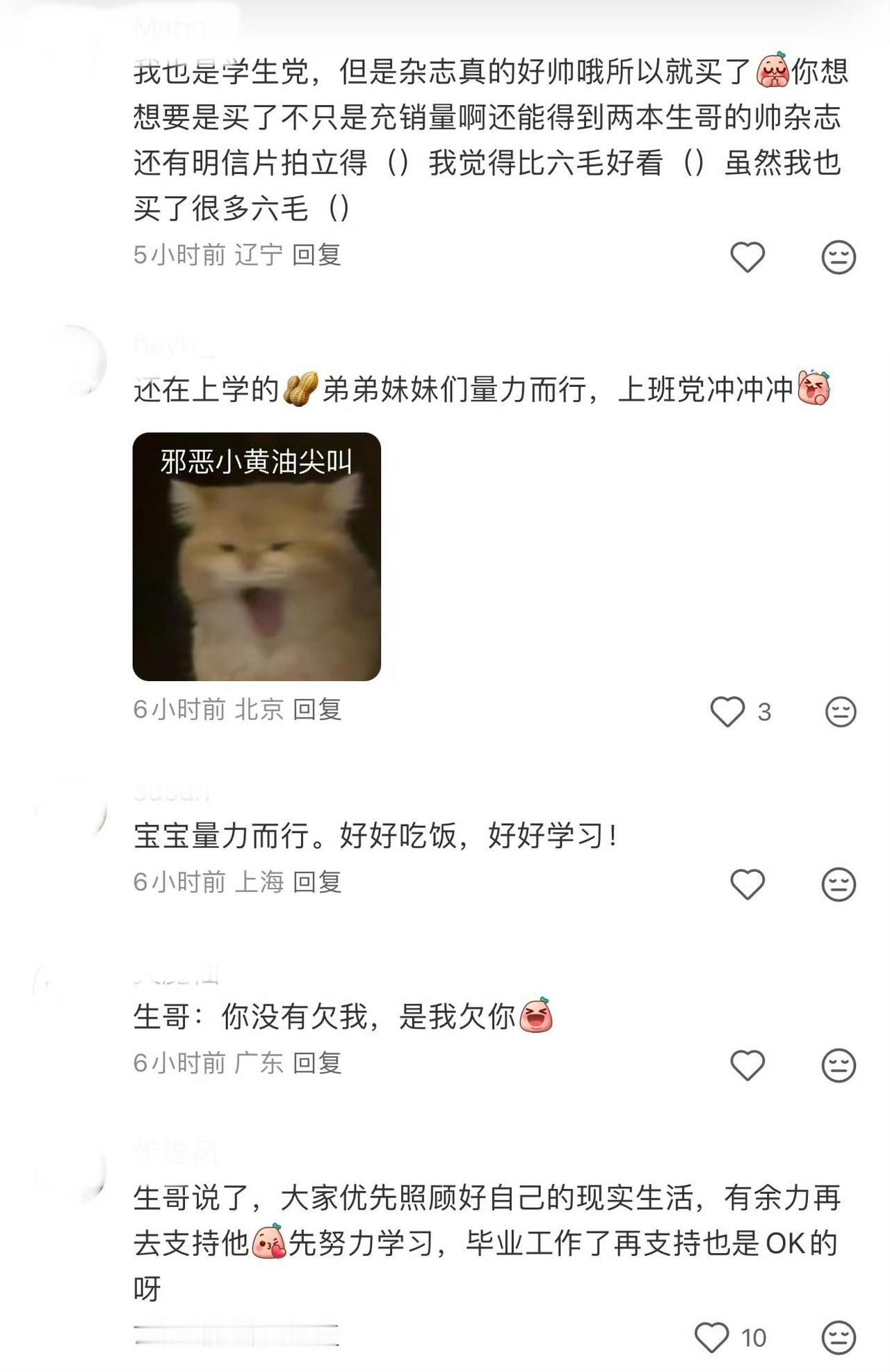 粉随正主,生哥三观正带着花生们也是紧随其后。 今天被这个帖子的评论给感动到了。 一个还是学生党的花生在犹豫要不要买生哥的杂志。 评论区的花生姐三观太正了。 大家都要他量力而行。 因为这是生哥在演唱会上一再说的,让大家兼顾好工作和学习再去见他。 花生姐说这样的事留给有经济能力的他们,等学生党工作后有了实力继续接棒。 还有花生姐表示可以买了送他……总之,花生们太像生哥了,温暖又有爱。