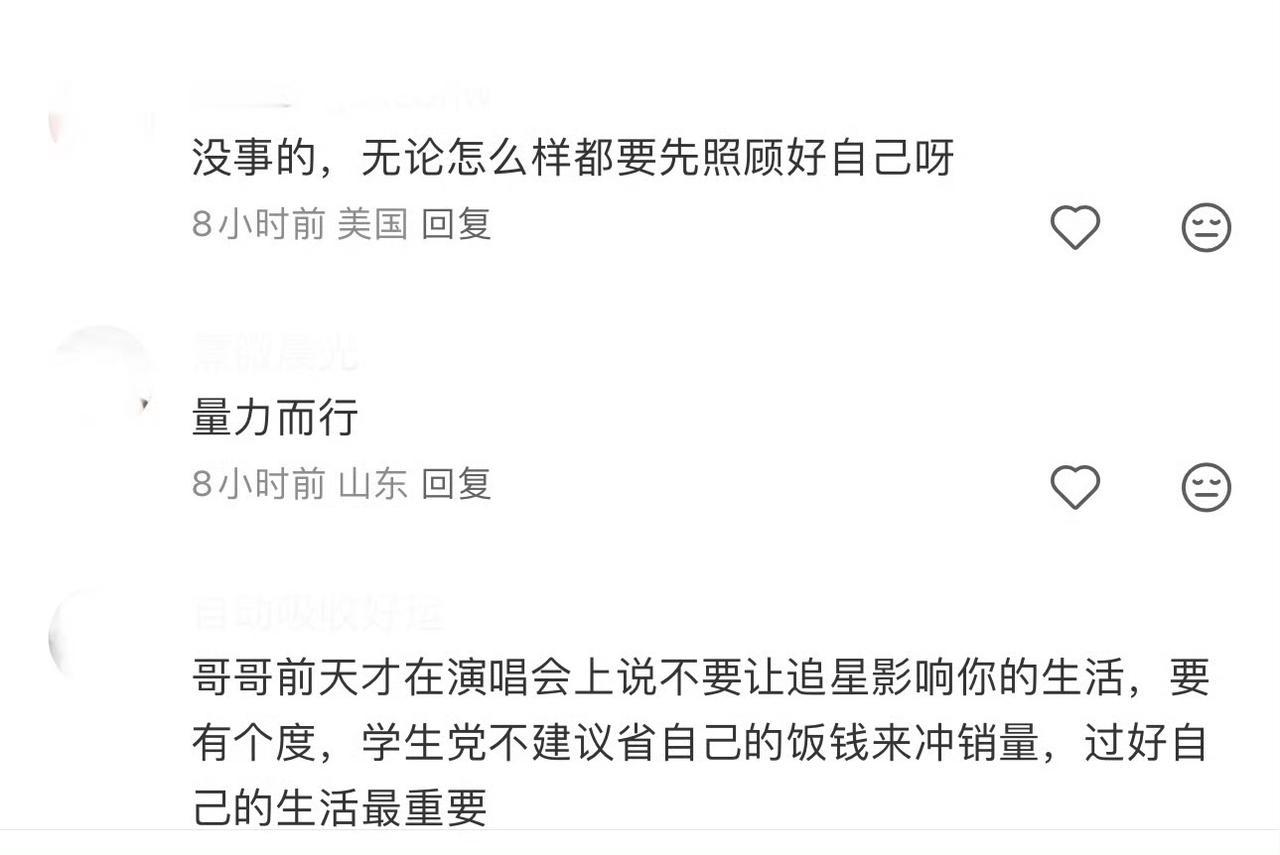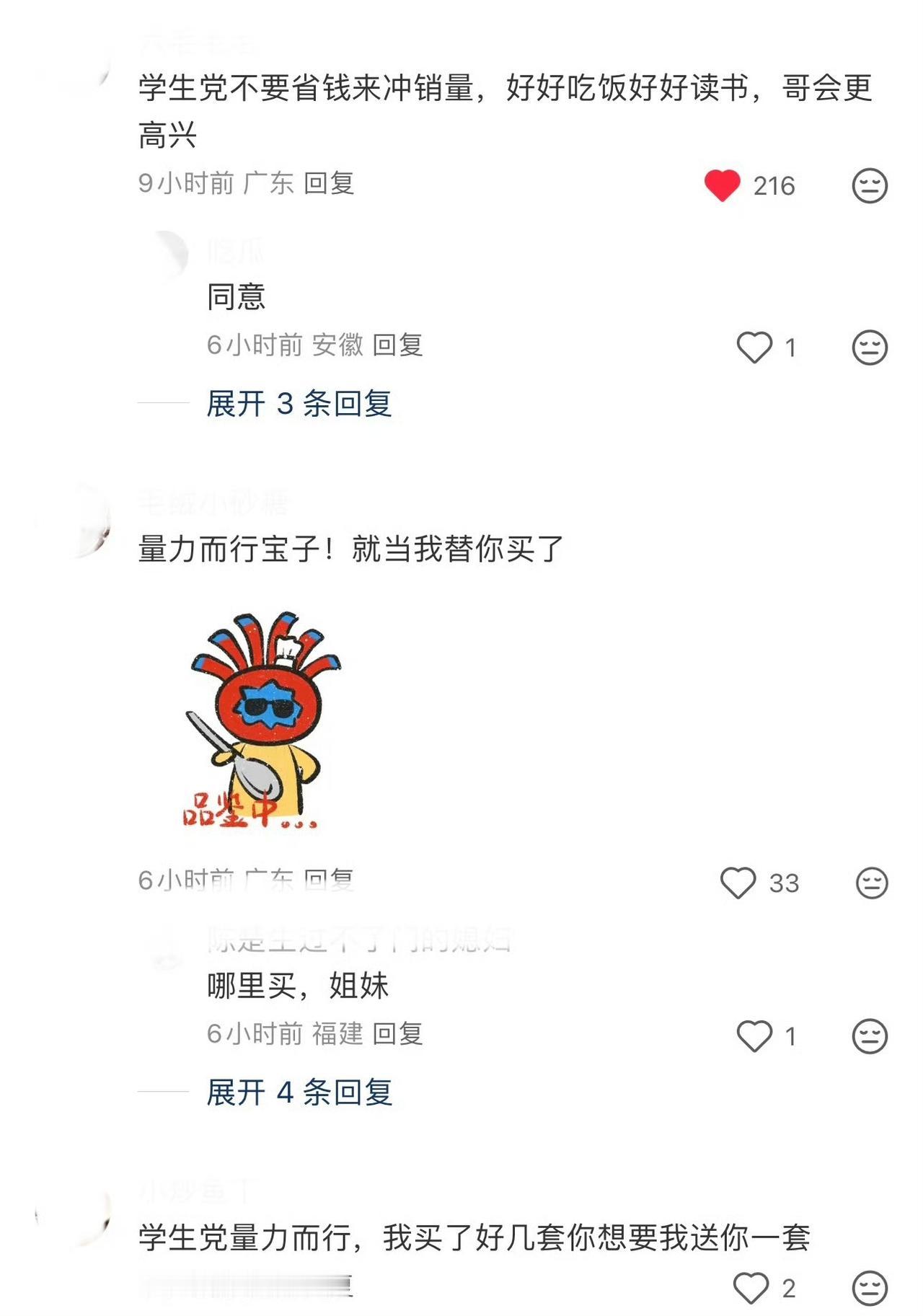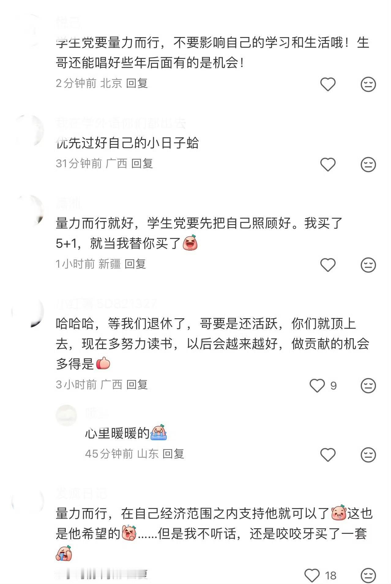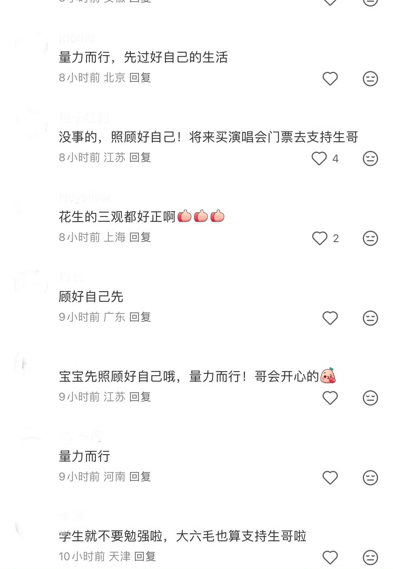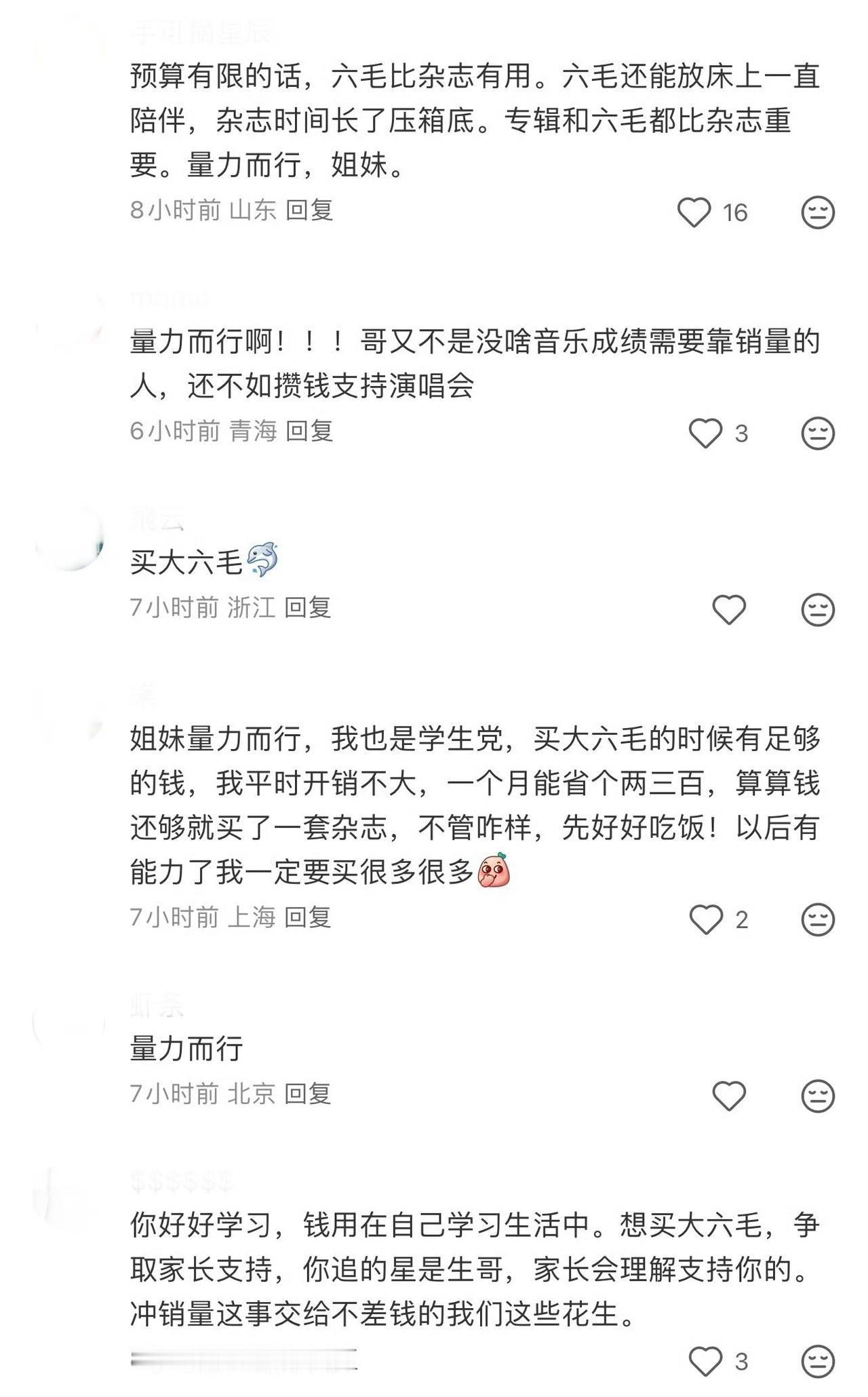 粉随正主,生哥三观正带着花生们也是紧随其后。 今天被这个帖子的评论给感动到了。 一个还是学生党的花生在犹豫要不要买生哥的杂志。 评论区的花生姐三观太正了。 大家都要他量力而行。 因为这是生哥在演唱会上一再说的,让大家兼顾好工作和学习再去见他。 花生姐说这样的事留给有经济能力的他们,等学生党工作后有了实力继续接棒。 还有花生姐表示可以买了送他……总之,花生们太像生哥了,温暖又有爱。