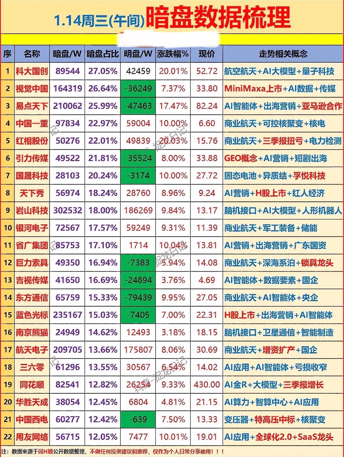 揭秘暗盘数据,带你玩转股市!📈💰 AI概念股活跃,商业航天、智能体、出海营销领涨,多股涨幅超两成,市场聚焦科技前沿与政策红利。
