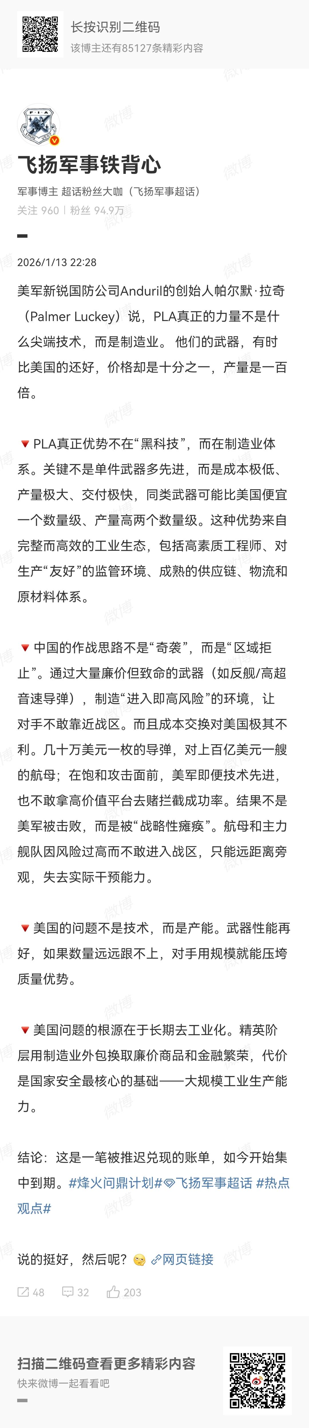 根据微博军事博主“飞扬军事铁背心”1月13日报道,美国新兴军工巨头、曾登上过时代杂志封面的帕尔默·拉齐,最近对中美军事力量进行了一番精彩的比较,同时表达了对于美国军事力量发展的浓烈担忧,在国外引起了巨大反响。 这个帕尔默·拉齐不是什么简单人物,他原本是一个硅谷程序员,后来开始研发AI产品,再接着又转而开发军事产品,而且每一次都取得了巨大成就,尤其是他创建的美国新兴军事企业Anduril,生生从美国传统军工巨头手中,抢走了好多美国国防部的订单,炙手可热,风头一时无两。 这样一个人物,对于军事的认知,毫无疑问是非常深刻的。 而他谈到中国的军事力量时,直接就指出:“中国真正的力量不是什么尖端技术,而是制造业!他们的武器,有时比美国的还好,价格却是十分之一,产量是一百倍!”中国的武器,“成本极低、产量极大、交付极快,同类武器可能比美国便宜一个数量级,产量高两个数量级。” 在这样的基础上,美国就算有一些还算是比较先进的武器,也没有任何用处,美国上百亿美元一艘的航空母舰,我们可以用无数几十万美元一枚的导弹将其从容摧毁,因此,事实上其实是美军根本不敢与我们交手,双方武器性价比差别太大了。 而这种问题的出现,则是在于美国自身制造业的衰落! 现在美国即便还有一些比较先进的武器,但是所有武器产能都非常有限,美国长期去工业化,导致现在美国已经失去了国家安全最为核心的一个基础:大规模工业生产能力! 说到这里,帕尔默·拉齐都近乎于有一种绝望,原因很简单,他能够看出问题所在,但是却改变不了什么,制造业已经空心化了,然后想要再工业化,这能实现吗?显然不可能! 因此,从长远来看,美国在军事力量上的不断衰落,是一种必然,且没有任何因素,能够改变这一点,即便美国技术进步,但是就算是拥有最尖端的技术,产能也跟不上,美国已经没有了那个工业生产能力,更何况,现在即便是在尖端技术上,美国也不一定比我们领先多少了。 帕尔默·拉齐这个观点,在国外引起了巨大的反响。一来,是帕尔默·拉齐身份特殊,他是美国新兴军工巨头,一言一行都受到诸多关注;二来,则是他指出的这个问题,实在是太过真实,又太过残酷,容不得人回避。 可是,即便如此,这个问题,似乎也没有任何可以解决的办法。特朗普宣称要让美国再次伟大,要让制造业回流,可是执行了这么多年,至今也没有什么成效,付出这样巨大的努力,收获却这样的渺小,足以说明再工业化的努力,几乎注定付诸东流。 美国的衰落,从美国的制造业开始外流那一刻开始,就已经是注定的命运了,一个没有大规模工业生产能力的国家,最后只会剩下一个空壳,衰落是迟早的事。