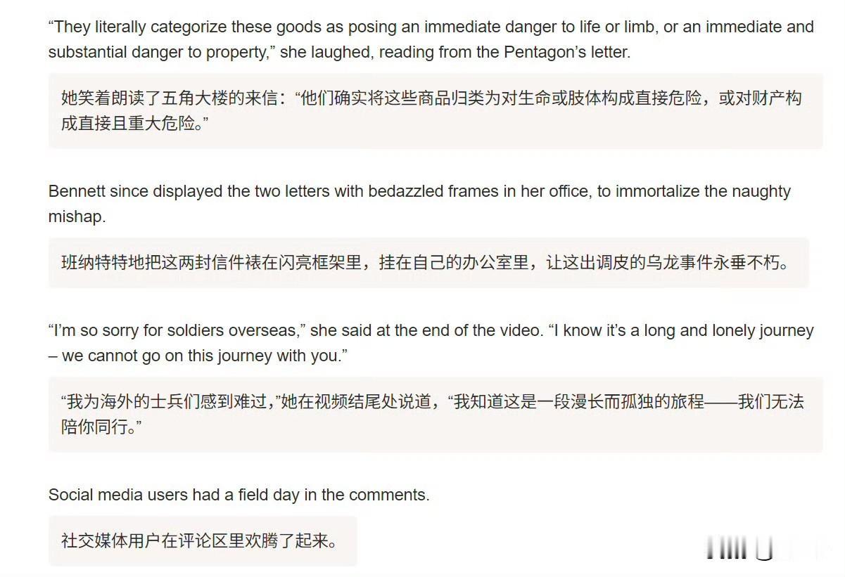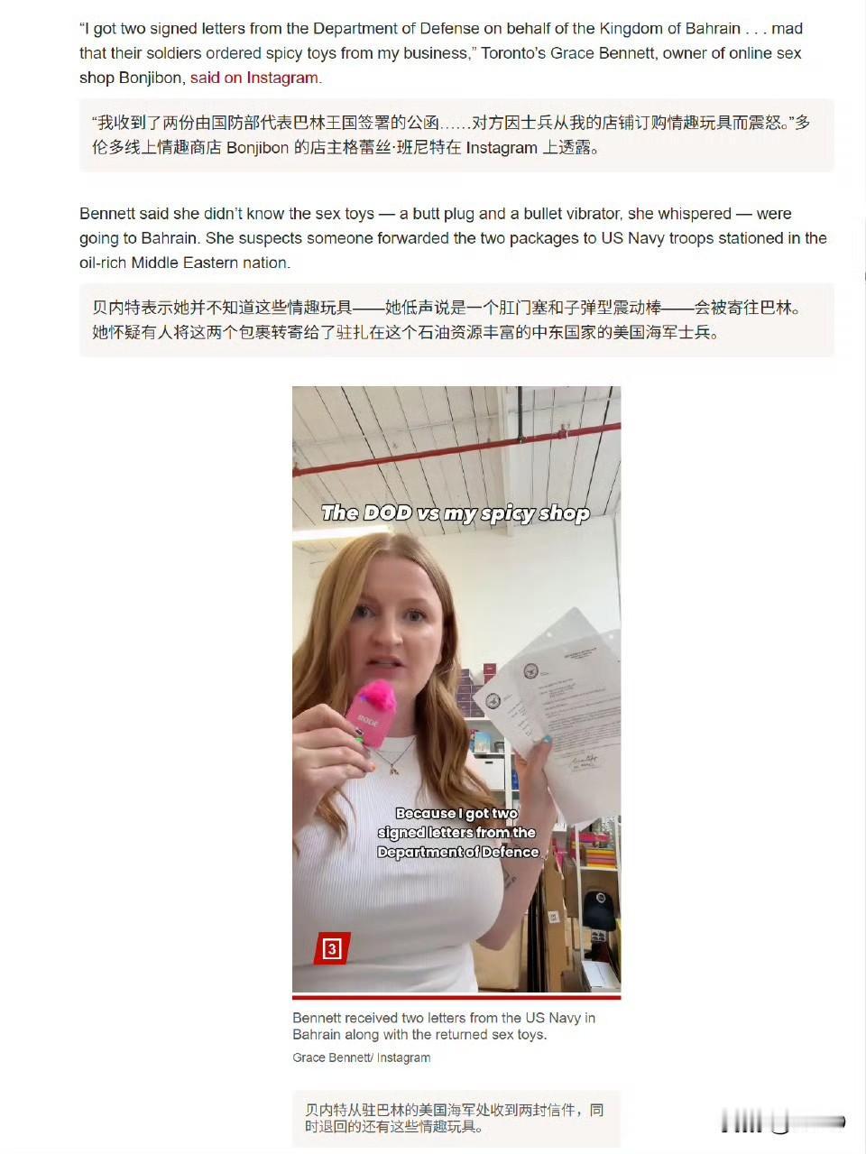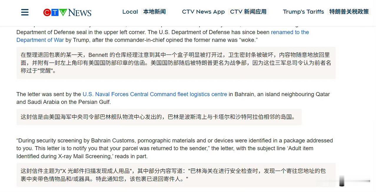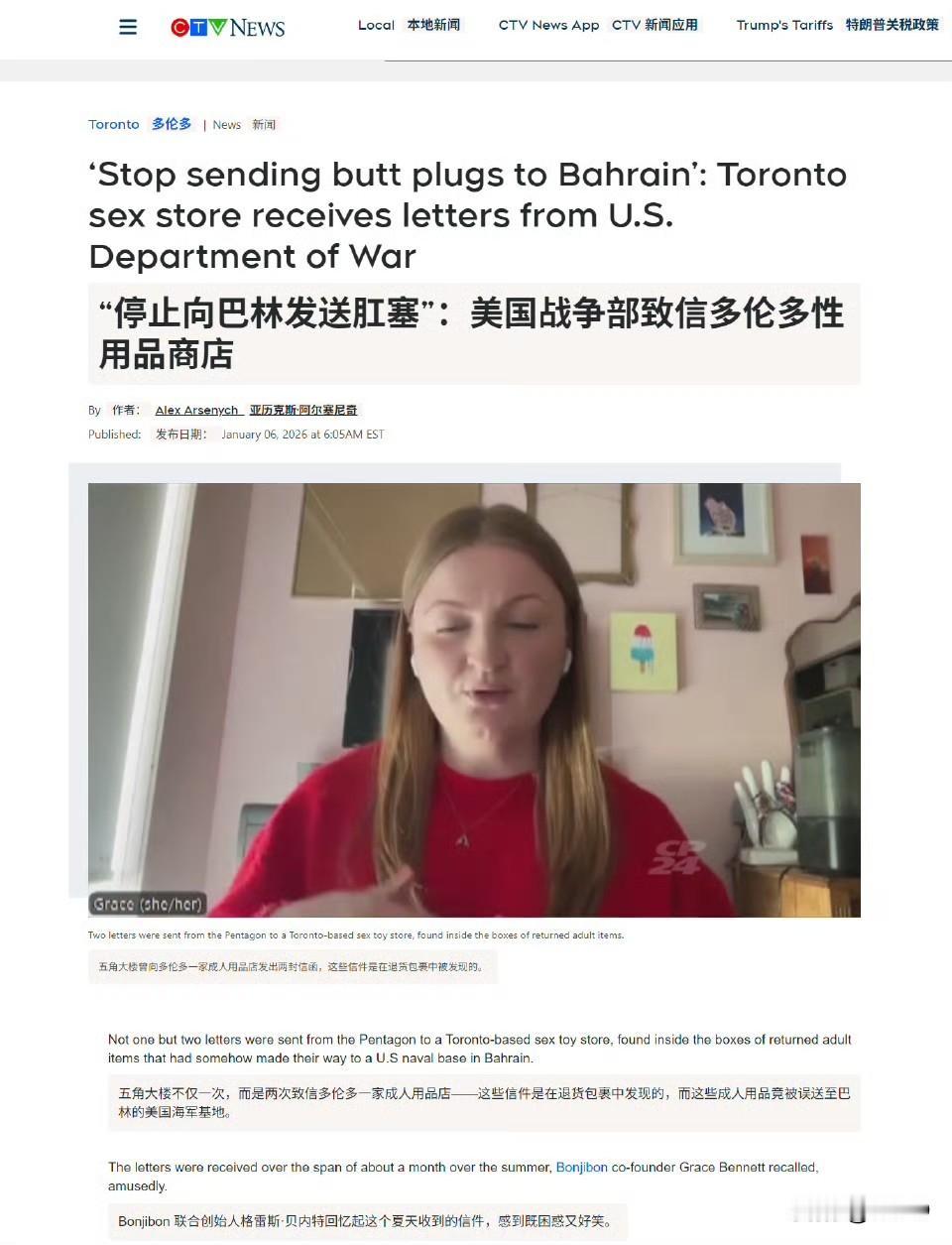 加拿大 CTV、美国纽约邮报报道:美国战争部两次致信多伦多一家成人用品店,要求该店停止向驻巴林的美军出售肛塞。五角大楼拒绝了多伦多 CTV 新闻的多次评论请求,称他们对此话题“无可奉告”。为纪念这一事件,该店表示已将这两封信分别裱框,悬挂于多伦多和 BC 省各自办公室内,均采用炫彩的华丽画框装裱。店主在视频中说:“我为海外的美军士兵们感到难过,我知道这是一段漫长而孤独的旅程——我们无法陪你同行。”