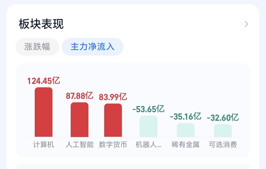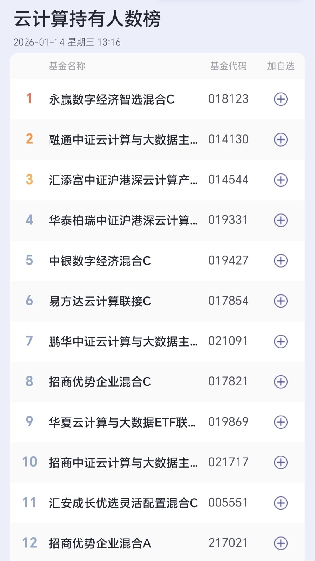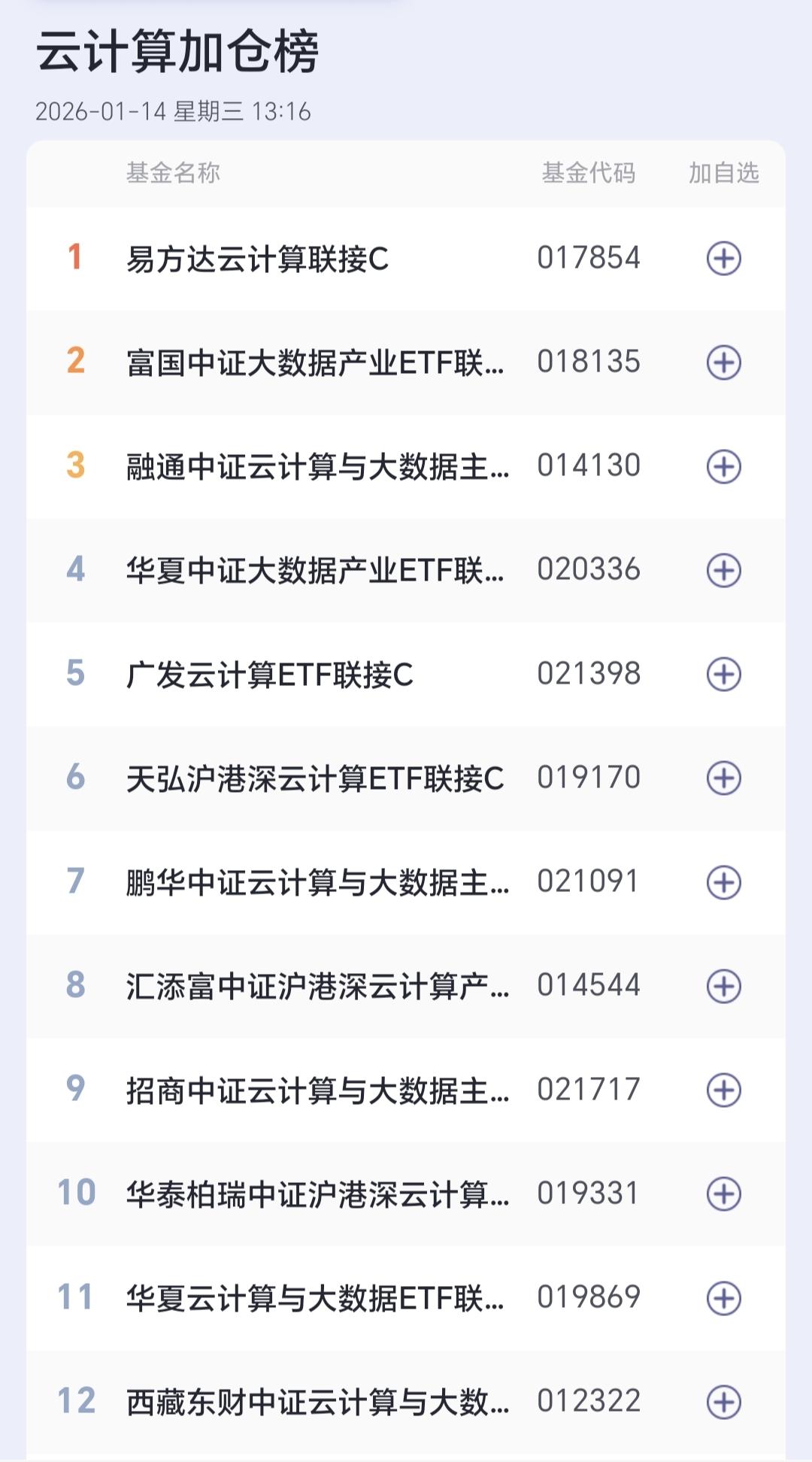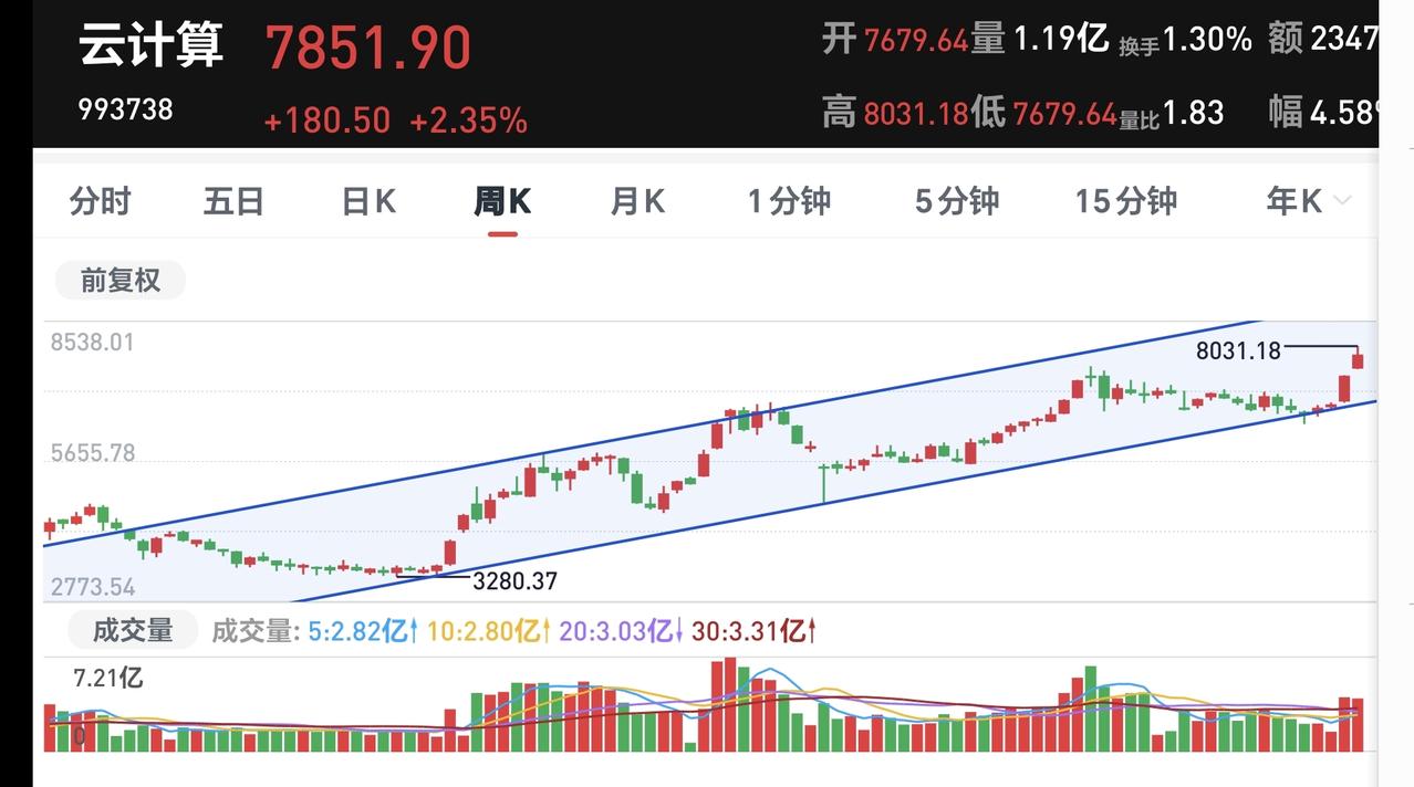 基金:市场盘中跳水的原因找到了 下午开盘以后,三大指数直线跳水,许多人不知道究竟发生了什么,其实这就是有关方面出手了,看下面的截图2,融资保证金从原来的80%提高到100%,前几天就说如果还继续像这样上涨的话,有关方面肯定会出手,如果不出手的话,就会变成疯牛,一旦形成疯牛,最后都是一地鸡毛,果不其然,有关方面终于出手了。 这个时候对于我们半仓的人来说,应对很简单,不可以轻易下场捞筹码,还是为了避免上涨的时候半仓,不可以变成下跌阶段成为满仓,因为这样很容易把2025年挣的钱全部还回去。 这个时候对于空仓的人来说,更是要管住手,不可以轻易进场,因为你没有利润垫底,一旦进场被套亏损的全部都是自己的本金,而不是利润的回吐。 这个时候对于满仓的人来说,应该要考虑好自己的进退,你是继续放手一搏,还是边战边退,每个人要制定好自己的策略。 持有的基金中,估值上涨幅度最大的三个板块是:AI应用板块,可控核聚变板块,芯片半导体板块,下跌幅度最大的三个板块是:创新药板块信,全合宜,白酒板块,估值整体上涨了1494元。 我们来看一下下面的截图5,现在两市累计成交25464亿,与昨天同期数量的1%,这说明下午开盘以后是大幅度放量,市场上涨3100多家,下跌2100多家,上涨家数多于下跌家数,跌停10家,涨停84家,主力资金净流入114亿。 我们来看一下下面的截图6,这是主力资金进出板块的情况,主力资金净流入最多的三个板块是:计算机板块,人工智能板块,数字货币板块,主力资金净流出最多的三个板块是:机器人板块,稀有金属板块,可选消费板块。 现在市场上涨幅度最大的三个板块是:金融科技板块,AI应用板块,云计算板块,云计算板块现在盘中估值上涨了2.30%,持有人数在所有板块中排名28位,这个板块今天加仓排行榜见下面的截图9,持有人数排行榜见下面的截图10,加仓人数最多的是易方达云计算,持有人数最多的是永赢数字经济智选混合。 我们来看一下下面的截图11,这是云计算板块周K线图,从图中可以看出,我画了两条倾斜向上的斜线,这是云计算板块周线级别上涨通道,现在的位置处于这个上涨通道中,也就是说,云计算板块周线级别处于上涨趋势中,持有的人可以继续持有,除非跌破这个上涨通道的下轨,才可以考虑要不要止盈出来观望。 市场不可能永远一直上涨,但在高位区域的时候,他们会让你相信市场会一直涨,他们会让你相信市场不可能跌,他们会让你相信市场只要下跌就是机会,我觉得距离这样的效果已经越来越近了。 每天都会分享我的观点,我的观点只代表我个人的看法,不能作为你操作的依据,据此操作后果自负。