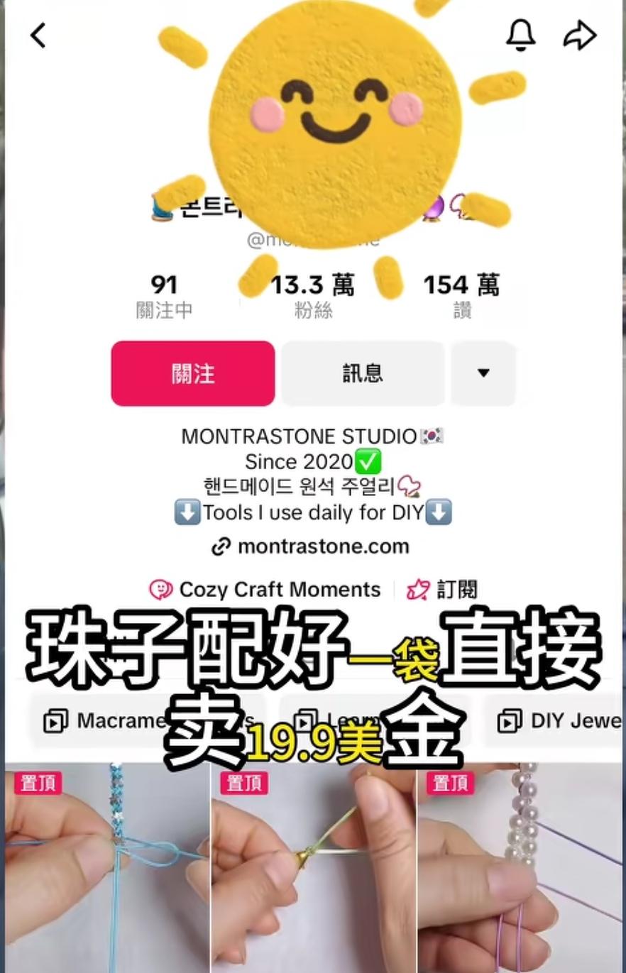 好创意,大市场,卖全球。 (如图所示)有位中国女卖家,就是拍摄自己各种DIY串珠的精美视频,一年吸粉12万,19.9美元一袋的各色珠子和佩绳,卖得那是风生水起,生意兴隆。好的创意,巨大的市场,服务全球客户。