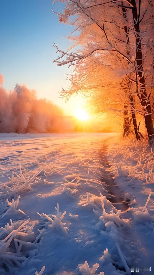 冬日之晨:严寒至致,旭日穿透晨雾,红光覆盖冰层,万木生辉。