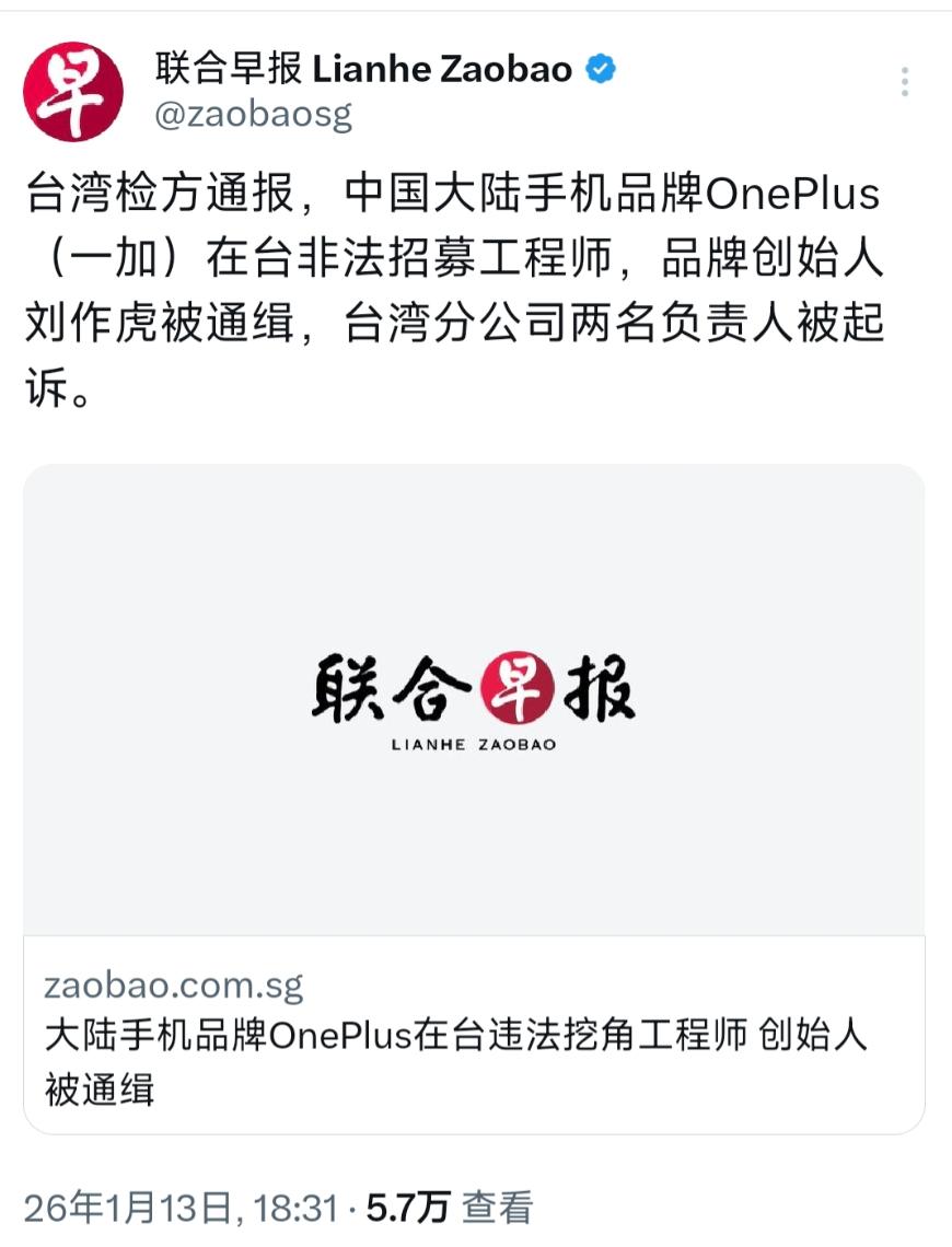倒反天罡!1月13日,新加坡联合早报发文:“台湾检方通报,中国大陆手机品牌OnePlus(一加)在台非法招募工程师,品牌创始人刘作虎被通缉,台湾分公司两名负责人被起诉。” 说白了,这是“台独”势力“吃里扒外”的表现,也是其最后的挣扎,是把司法当成了“台独”的政治算计工具。 要知道,别的国家都是一致对外,凝聚力量让自己的国家有更好的发展,而 “台独” 势力不仅没有做出有利于自己国家发展的事情,还将台积电主动推向美国、任由其核心技术与产能被掏空。这次又拿大陆企业开刀,给正常的人才招聘和产业交流扣上 “非法” 的帽子,蓄意制造两岸对立。 说实话,这只不过是“台独”势力在为其不得人心的分裂图谋铺路,也恰恰印证了中国一定要实现国家完全统一的必要性与紧迫性。唯有实现国家完全统一,才能彻底斩断 “台独” 势力祸台乱港的黑手,让两岸产业交流回归互利共赢的正轨,切实保障台湾民众的切身利益与发展福祉。 说到底,台独” 势力的任何政治算计,在统一的历史大势面前都是螳臂当车,终究难逃历史的审判。任何妄图分裂自己国家的跳梁小丑,都将被永远钉在历史的耻辱柱上。