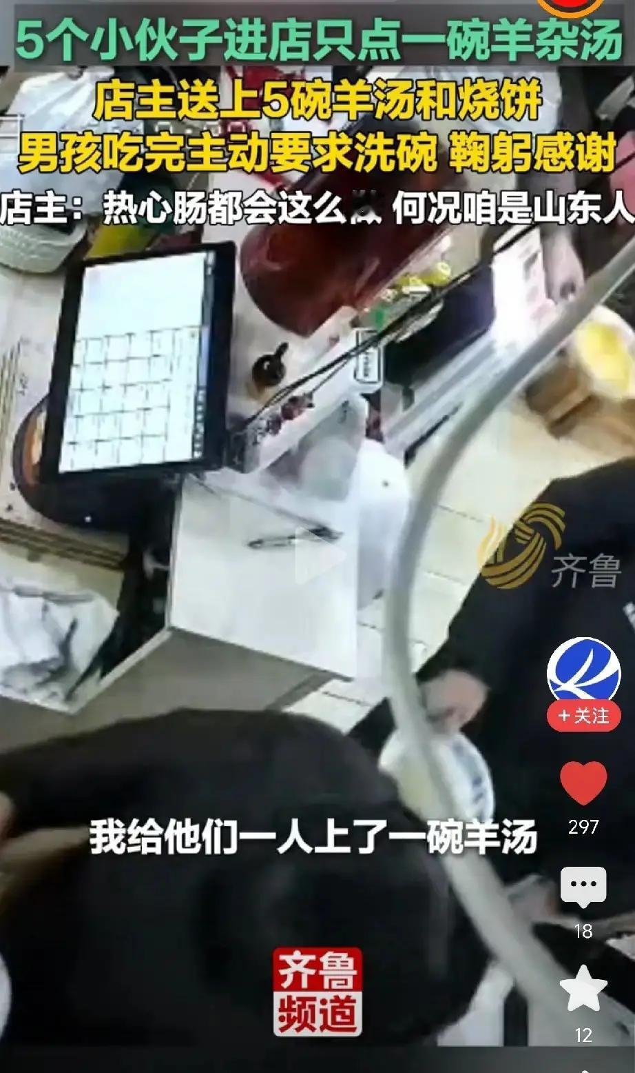 “活该红火!”山东济南,一羊汤馆里,5个小伙子进店就餐,竟只点了一碗羊杂汤,老板询问得知实情后,直接免费送上多碗羊汤和烧饼! 网友:这就是刻在山东人骨子里的仗义! 据报道,济南一家羊汤馆内,店主赵先生像往常一样打理着生意,店里进来了5个年轻小伙,几个人凑在一张桌子旁商量了半天,最后只点了一碗羊杂汤。 赵先生心里有点纳闷,走上前笑着询问缘由,这才知道,这几个小伙子是从青岛来济南找工作的,本想投奔朋友,结果没联系上,身上带的钱也快花完了,实在没办法,只能几个人合吃一碗羊汤省着点用。 得知情况后,赵先生心里顿时不是滋味,他摆摆手对着小伙子们说:“出门在外谁还没个难处,这不算啥!” 没等小伙子们反应过来,他转身就钻进了厨房,麻利地煮了好几碗热气腾腾的羊汤,又从柜子里拿出一沓刚出炉的烧饼,一起端到了桌上,还坚持说这是免费送的,不收一分钱。 小伙子们看着桌上的羊汤和烧饼,眼眶都有点发红,吃完饭之后,他们主动拿起店里的抹布和碗筷,把桌子擦得干干净净,用过的碗碟也都洗刷得锃亮,临走的时候,还特意对着赵先生深深鞠了一躬表达感谢。 赵先生事后坦言,换作任何一个热心肠的山东人,碰到这种事都会这么做,出门在外的孩子不容易,能帮一把就帮一把,都是小事。 这一幕被分享到网上后,许多网友都被老板的仗义打动了,纷纷直呼:“这样的良心店家,不红火都难!” 这几碗羊汤和一沓烧饼,在有些人眼里可能就是一顿普通的饭食,花不了多少钱,但对于身处窘境的小伙子们来说,却是寒冬里最暖的一份善意和体恤。 这一幕之所以看得人心里热乎乎的,是因为我们从中看到了陌生人之间最质朴的体谅,也看到了人性里最耀眼的光芒。 小伙子们的处境或许满是“不得已”的窘迫,他们没有选择挥霍浪费,而是精打细算想着渡过难关,这份懂事,让人忍不住心疼。 赵先生用几碗羊汤传递了善意,这份善意换不来惊天动地的回报,却能在人与人之间架起一座温暖的桥梁,既暖了别人的胃,也暖了大家伙的心,实在太值了!