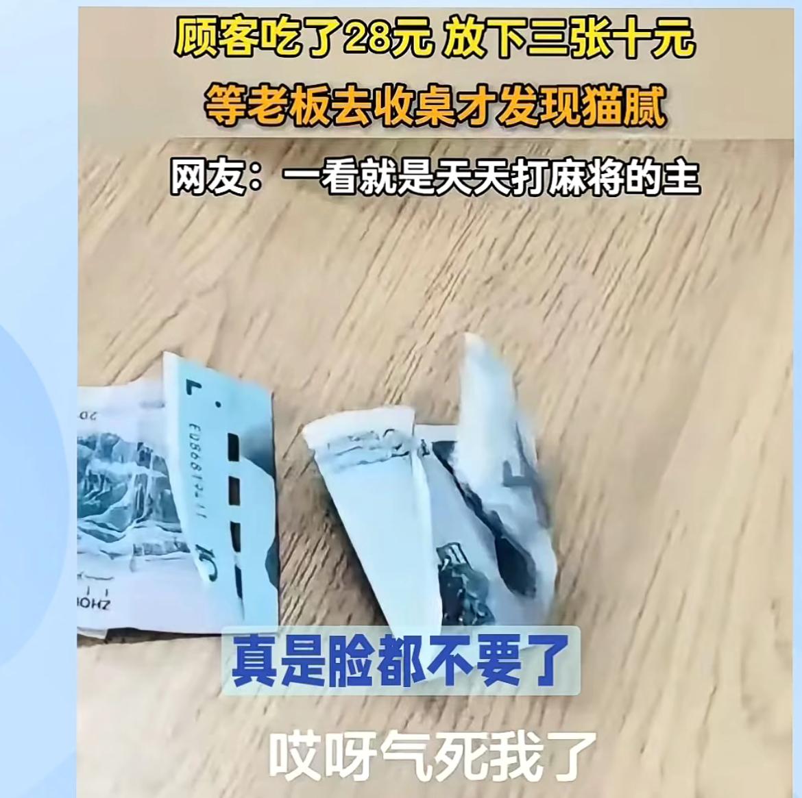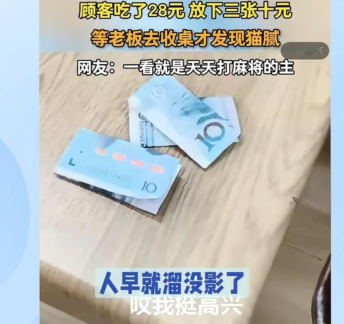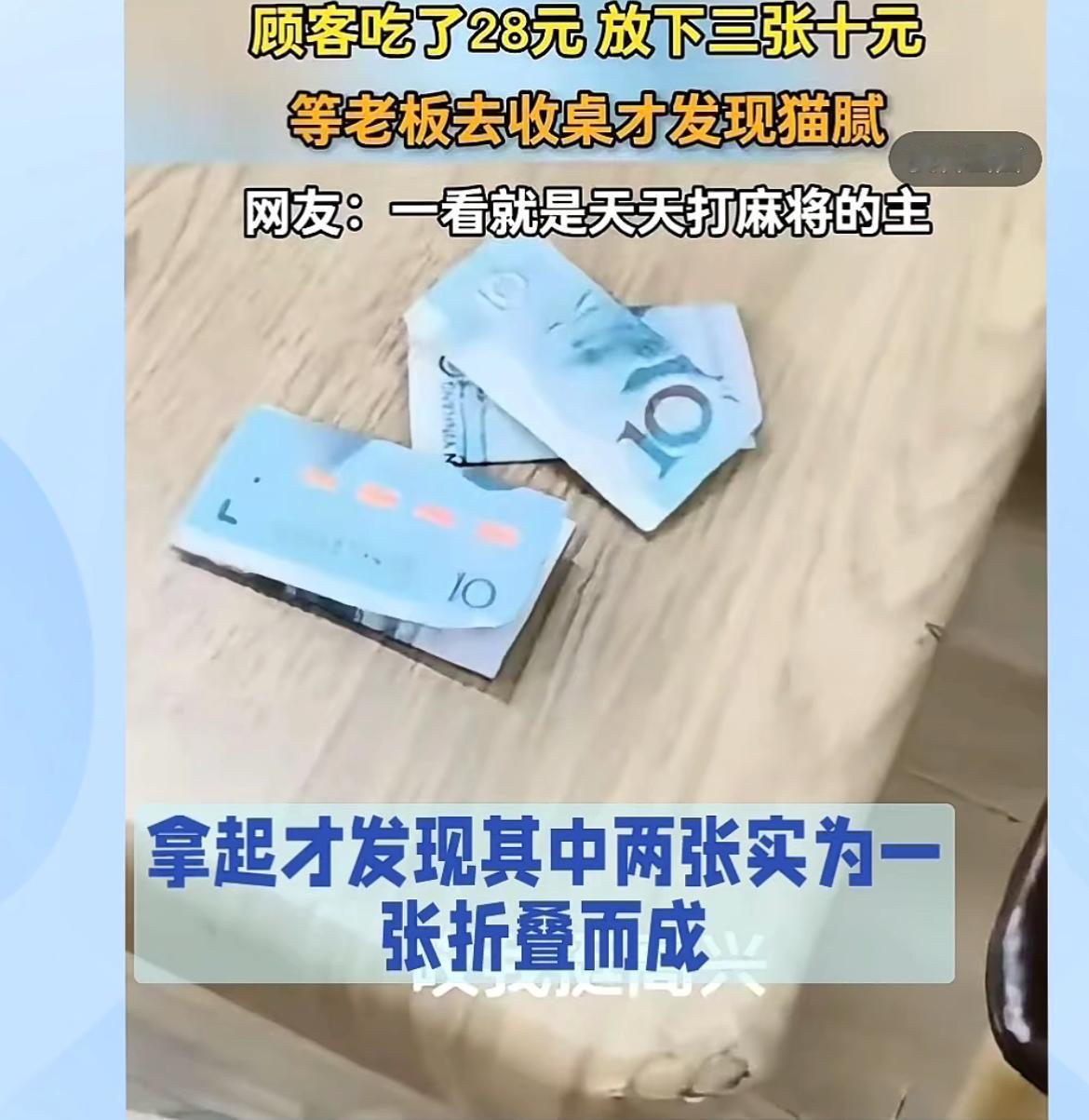 面馆老板吐槽,4女子吃面买单折叠10元钞票误导老板,本来要付28,结果只付20元。四个女子点了4碗素面,吃完了就把钱放在桌子上走人了,和老板说了一声结账。老板看到桌上的钱,就没有在意,等忙完来收桌子,看到折叠起来的三张10块,心想还挺讲究,多付了2块,打开一看,老板傻眼了,竟然是20,其中有一张折叠,看起来像30。老板无语了,想不到这些女人连8块钱都要骗,可是人早就没影了,只能自认倒霉。5块钱大碗面 折叠面