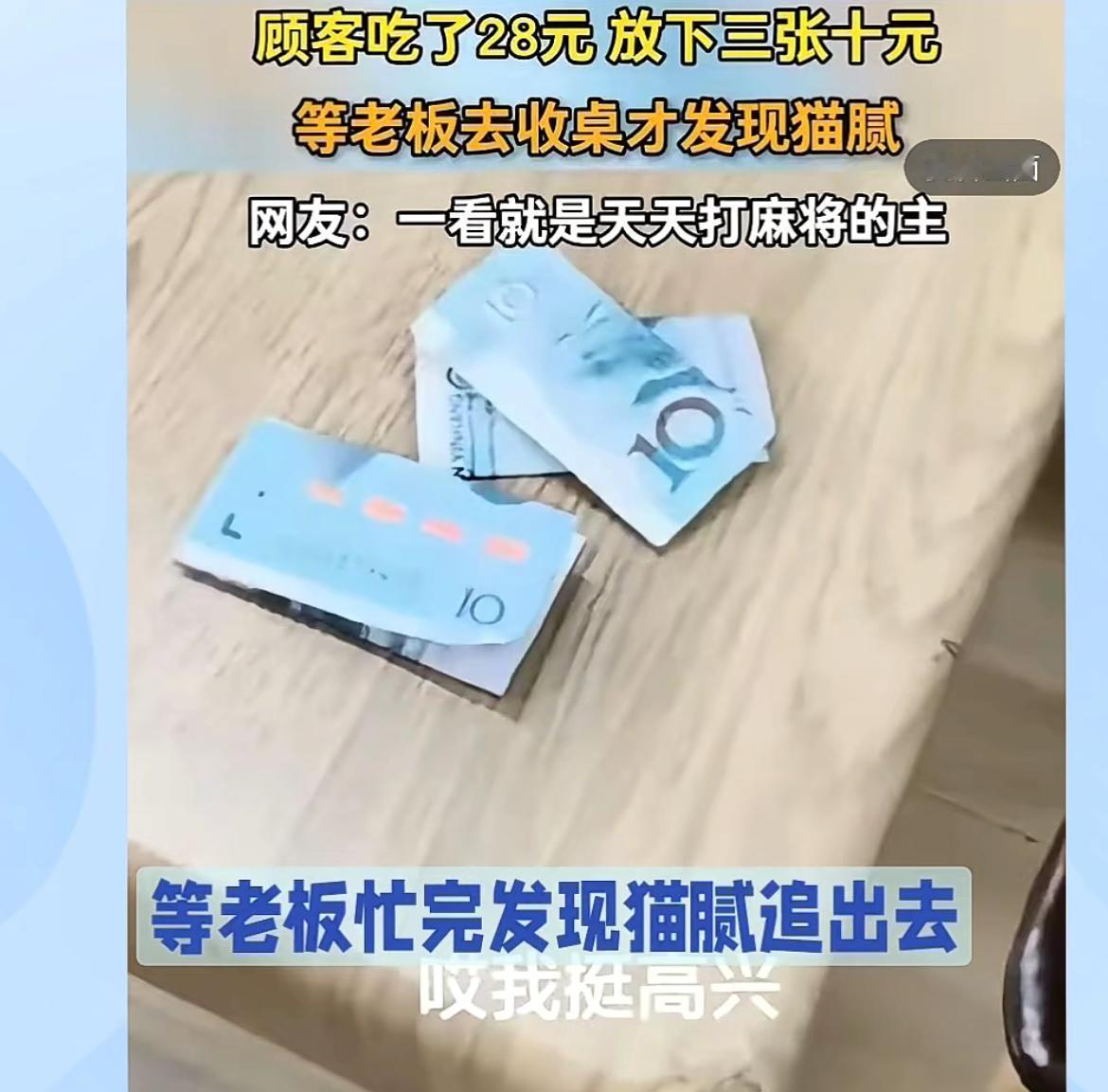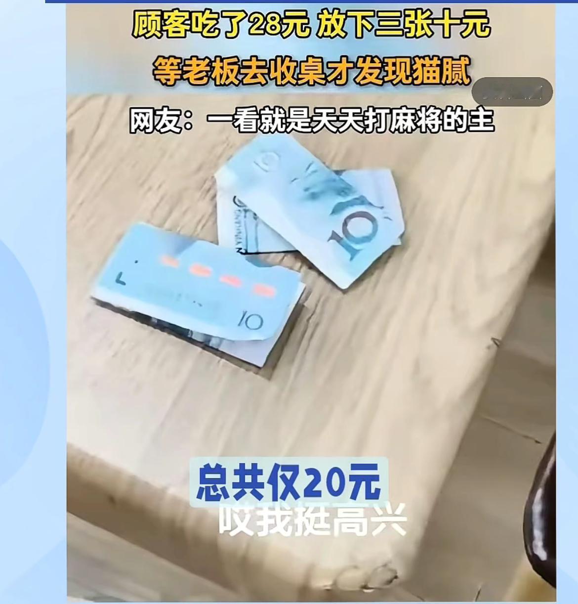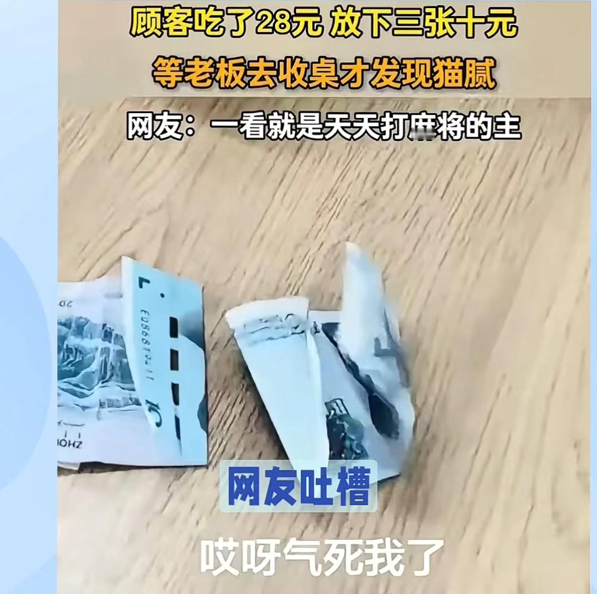 面馆老板吐槽,4女子吃面买单折叠10元钞票误导老板,本来要付28,结果只付20元。四个女子点了4碗素面,吃完了就把钱放在桌子上走人了,和老板说了一声结账。老板看到桌上的钱,就没有在意,等忙完来收桌子,看到折叠起来的三张10块,心想还挺讲究,多付了2块,打开一看,老板傻眼了,竟然是20,其中有一张折叠,看起来像30。老板无语了,想不到这些女人连8块钱都要骗,可是人早就没影了,只能自认倒霉。5块钱大碗面 折叠面