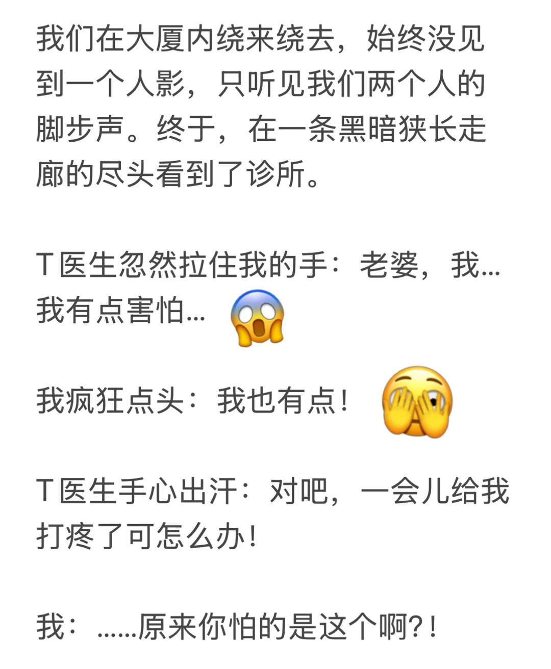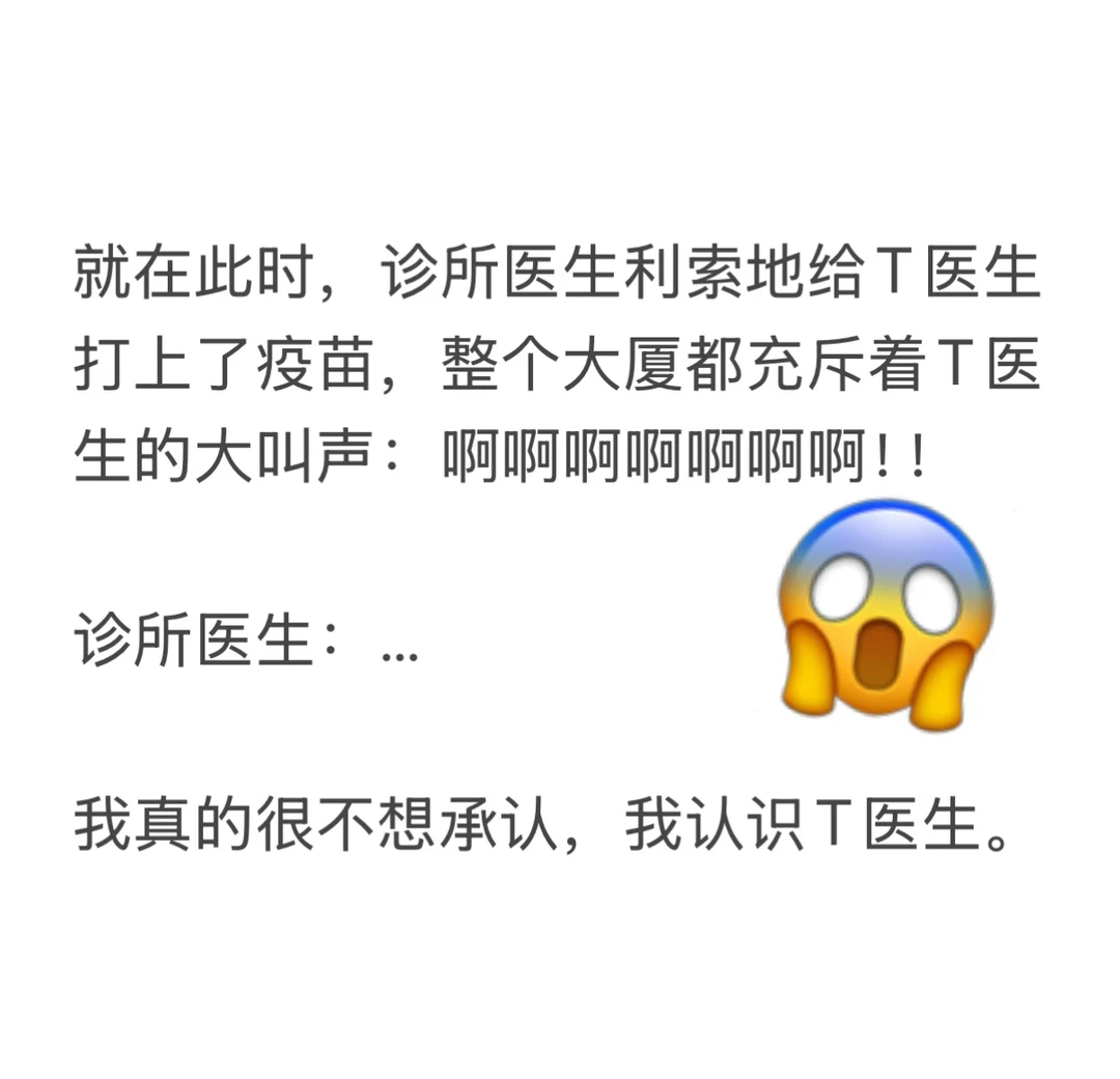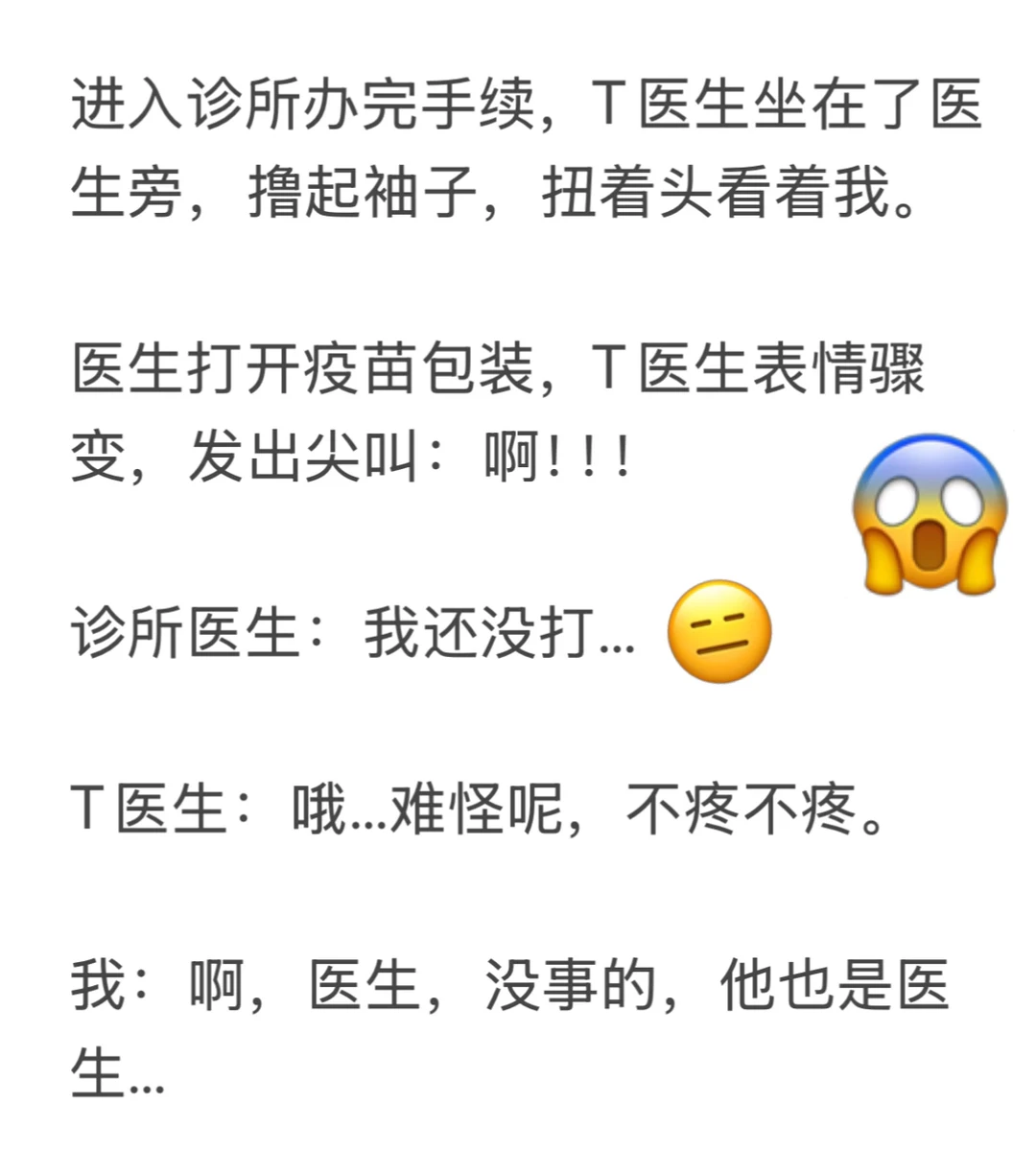 轮到我打疫苗时,T医生在旁边安慰:没事儿宝,不疼,我在呢我在呢… 我面不改色:… 我是个生过孩子的女人… 你觉得这个世界上还有什么疼痛是我承受不了的吗🤦♀️