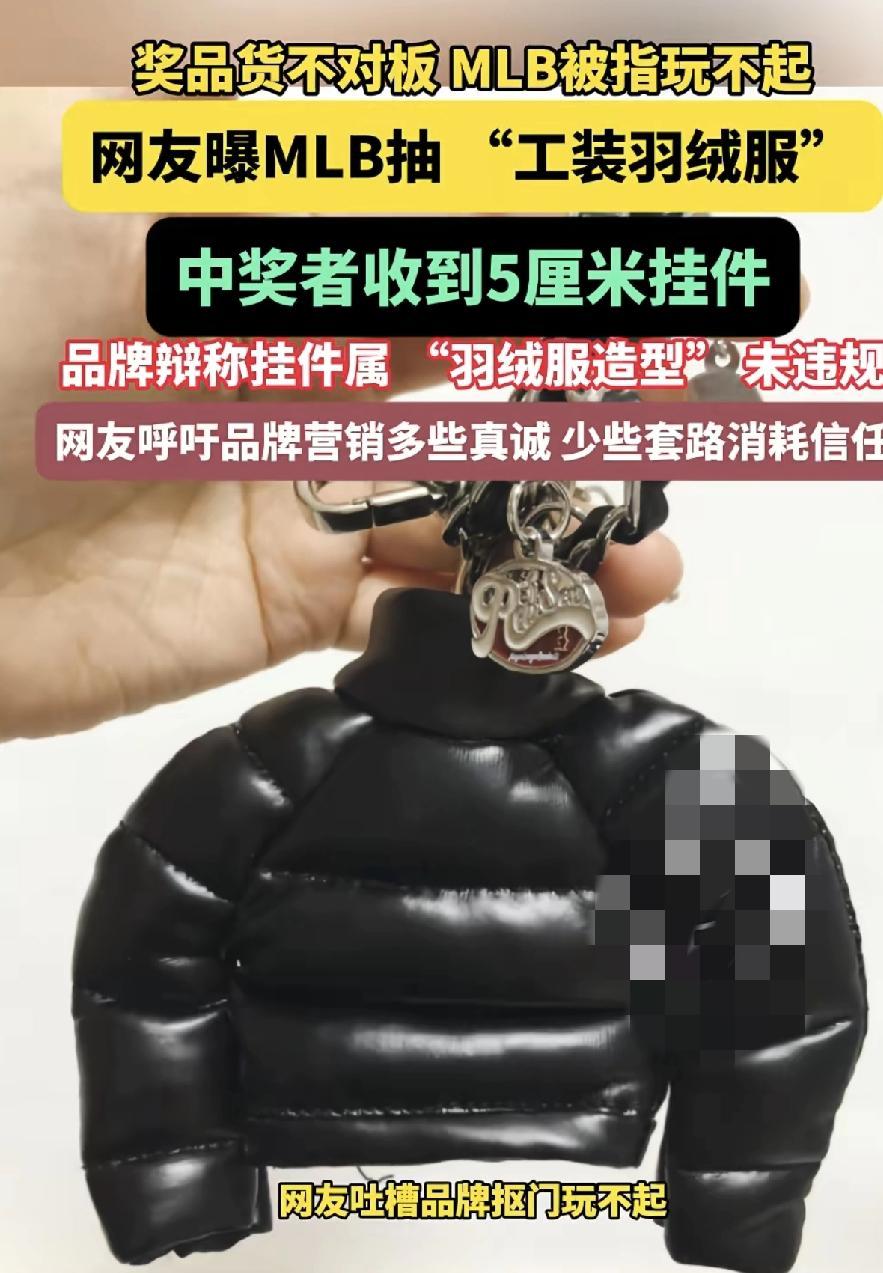 MLB官方微博发布抽奖活动,有网友抽中了工装羽绒服收到的却是一件5厘米的工装羽绒服挂件。直呼 商家玩不起,货不对版。而MBL客服人员称工装羽绒服并没有违规。这样的操作让网友觉得应该多一些真诚,少玩一点套路。一件能穿的羽绒服与一个挂件相比,明显是让网友难以接受。
