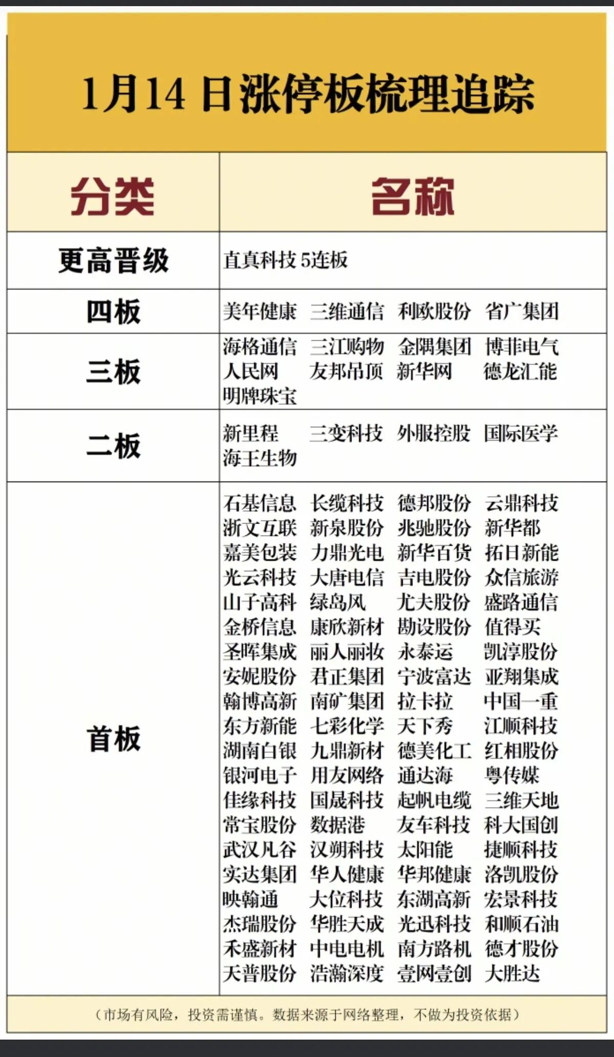 1月14日,周三A股涨停板梳理一览表!!! 直真科技今日成功晋级5连板,后市值得重点关注;美年健康、三维通信等四股今日成功晋级4板,后市值得期待;三板股票共9只,明日,大A是继续回调蓄力,还是上涨走牛,让我们拭目以待吧!!!