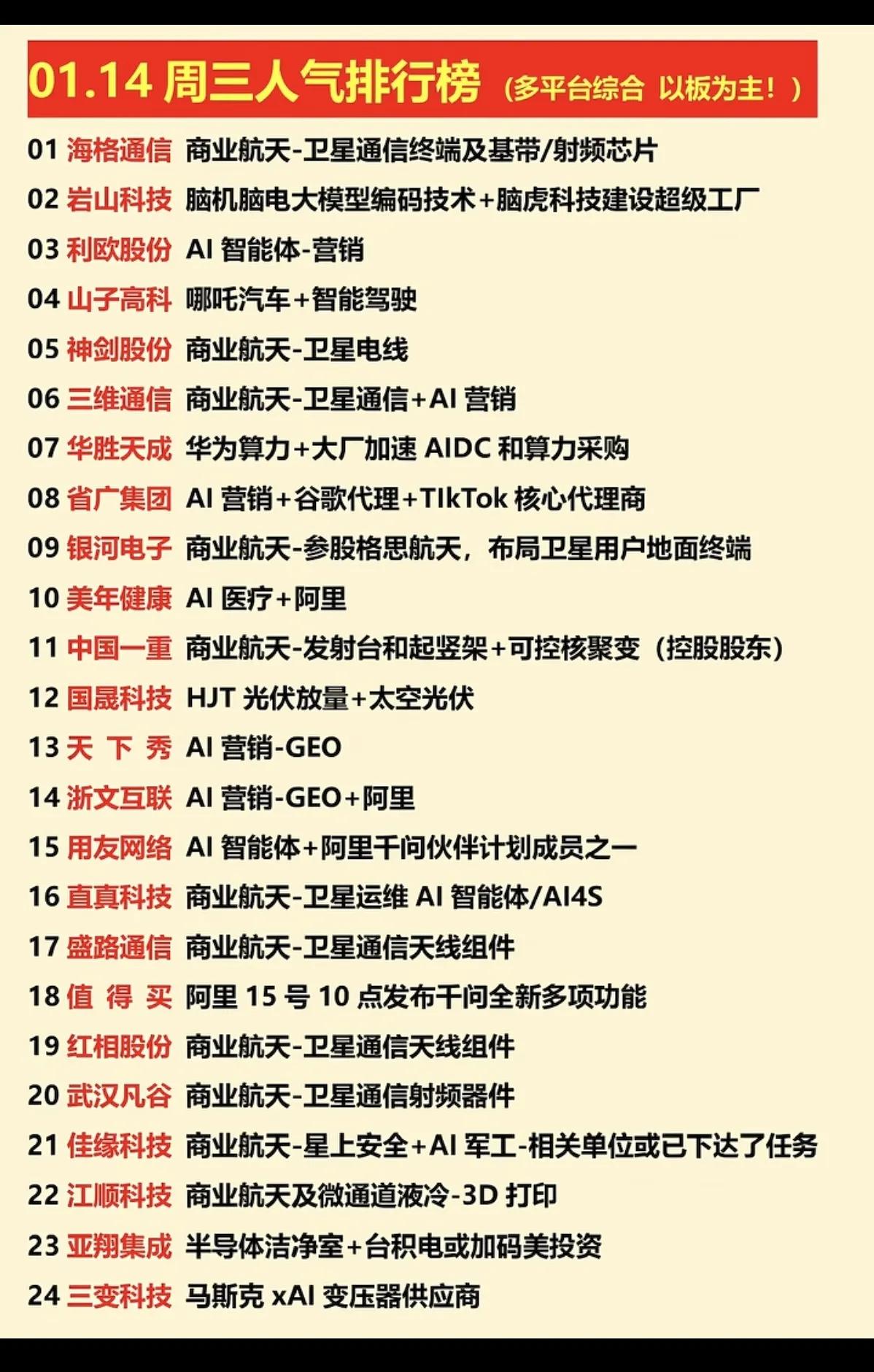 1月14日,周三A股人气排行榜!!! 海格通信,商业航天叠加射频芯片概念,大柚子加持,后市值得重点关注;岩山科技,脑机接口龙头,后市值得期待;利欧股份,AI智能体叠加AI营销概念,市场热门股,后市值得高看一眼!!!