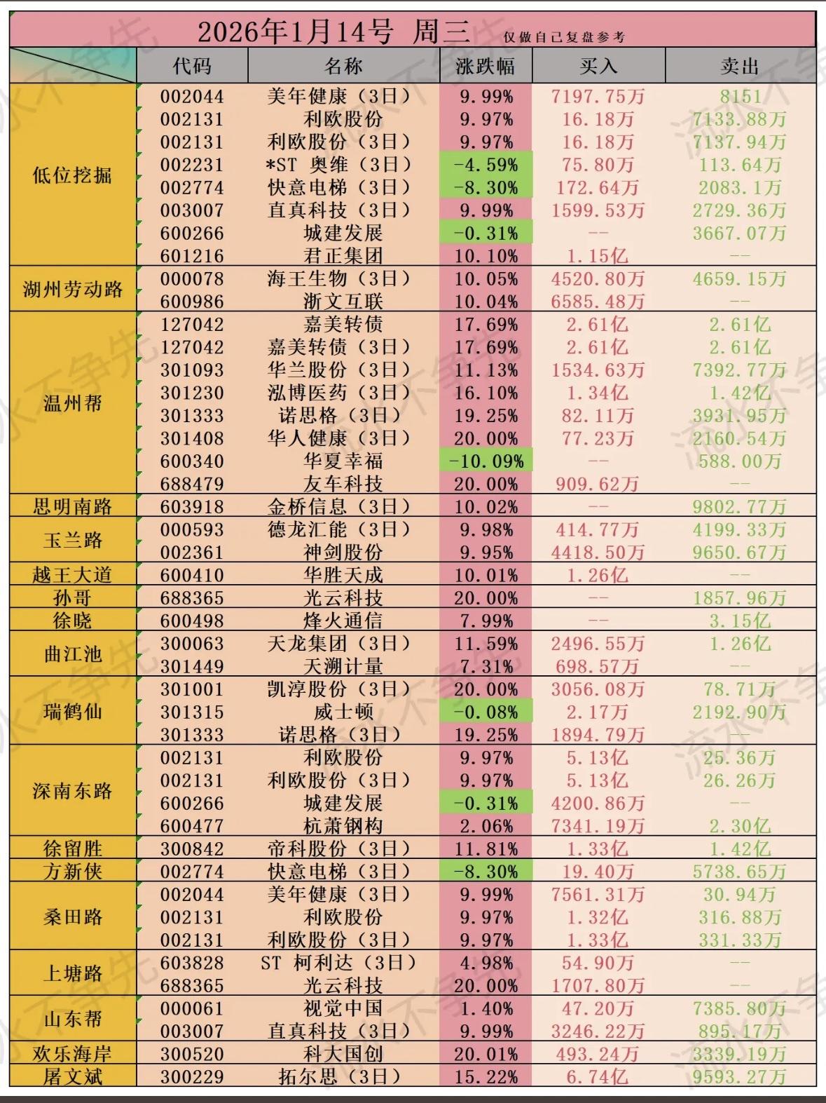2026年1月14日股票涨跌榜,带你领略市场风云!📈📉 "股市复盘:多股涨跌显著,山子高科、岩石科技领涨,威士顿微跌,资金流向活跃。" "股市复盘:多股涨跌显著,山子高科涨超10%,威士顿微跌,资金流向活跃,关注通信、科技板块动向。"