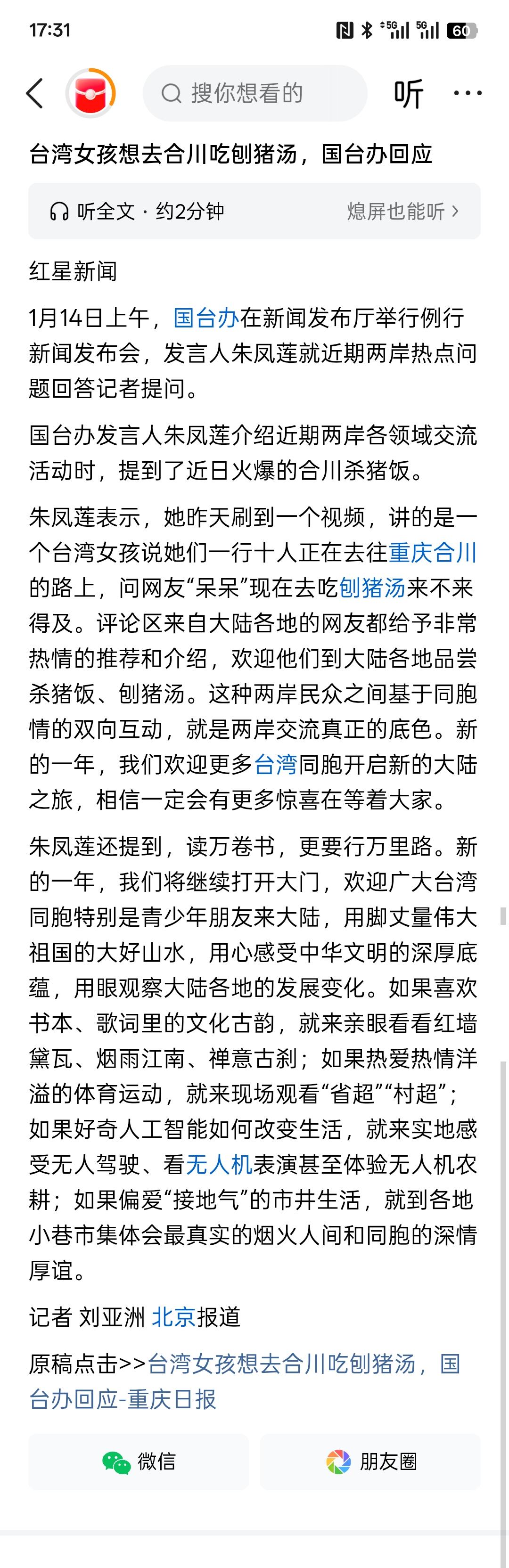 台湾女孩想去合川吃刨猪汤,国台办回应了,欢迎台湾同胞来到大陆,体验祖国的文化传统!读万卷书不如行万里路!欢迎台湾同胞青年来体验中国的大好河山!看看祖国的美好发展!去感受中国文化的底蕴与中国古胜铭记! 希望广大台湾青年同胞用脚去丈量美好的祖国山河!希望你更多的台湾青年应该来到中国大陆的感受中国的发展与科技的进步! 我们本是同根生,又何必要去做两家人!我们就是一家人