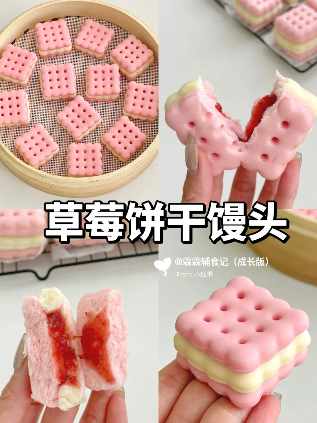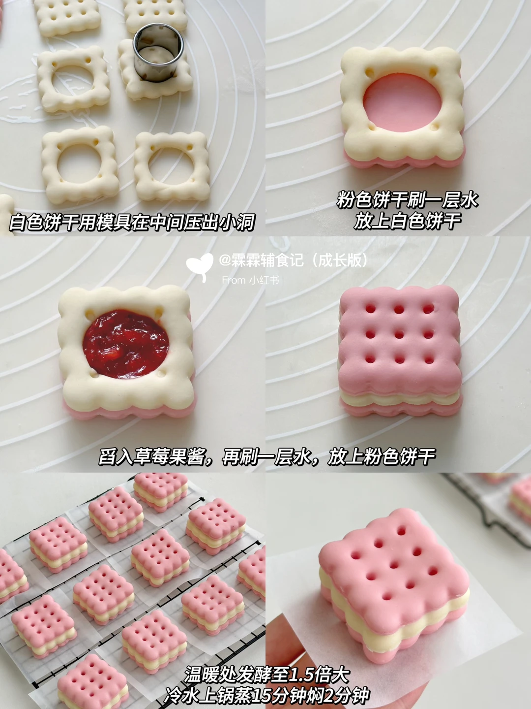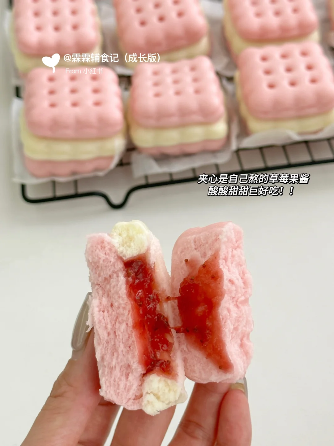 分享一款无敌可爱的草莓饼干馒头 用自制的草莓果酱做夹心,酸酸甜甜巨好吃! 用面包机做的果酱方便又省事,用不完的可以密封起来放冰箱,随吃随取,也可以抹在吐司上吃或者做成草莓果酱饮品[哇R][哇R] 做成馒头夹心也很惊艳!酸甜的果酱加上蓬松宣软的馒头,怎么吃都不会腻呀!加上造型可可爱爱,小朋友喜欢得不得了,妈妈们赶紧动手试试吧[派对R]