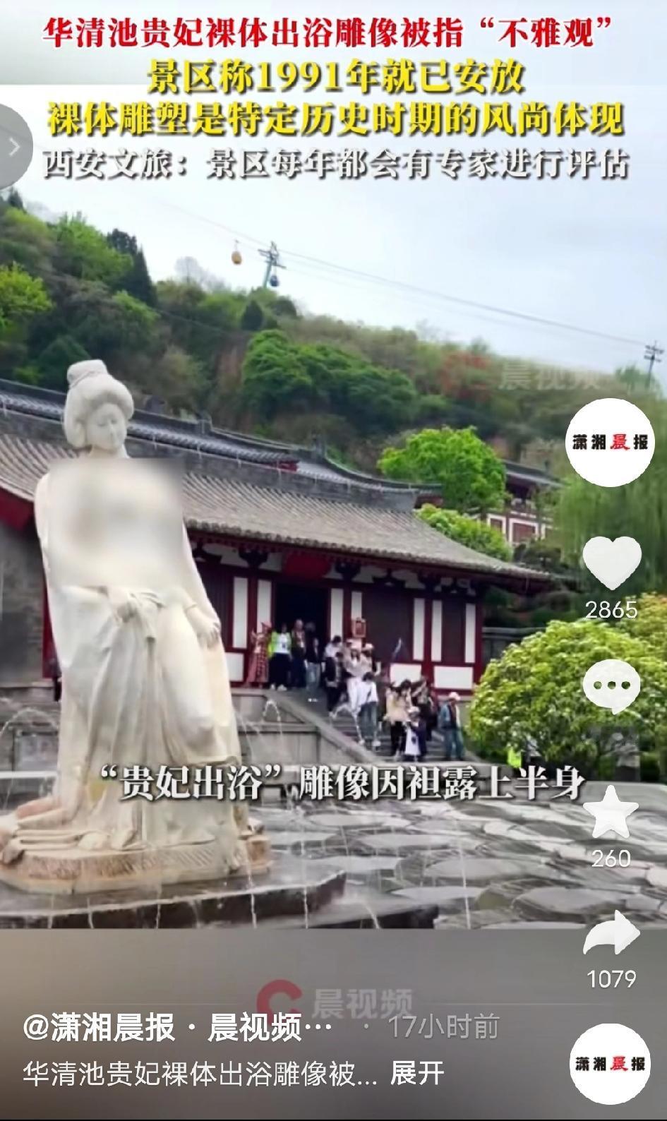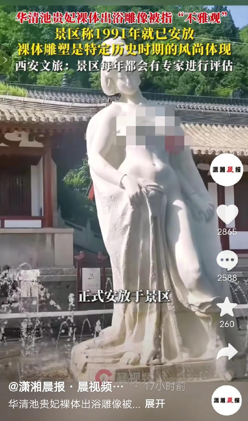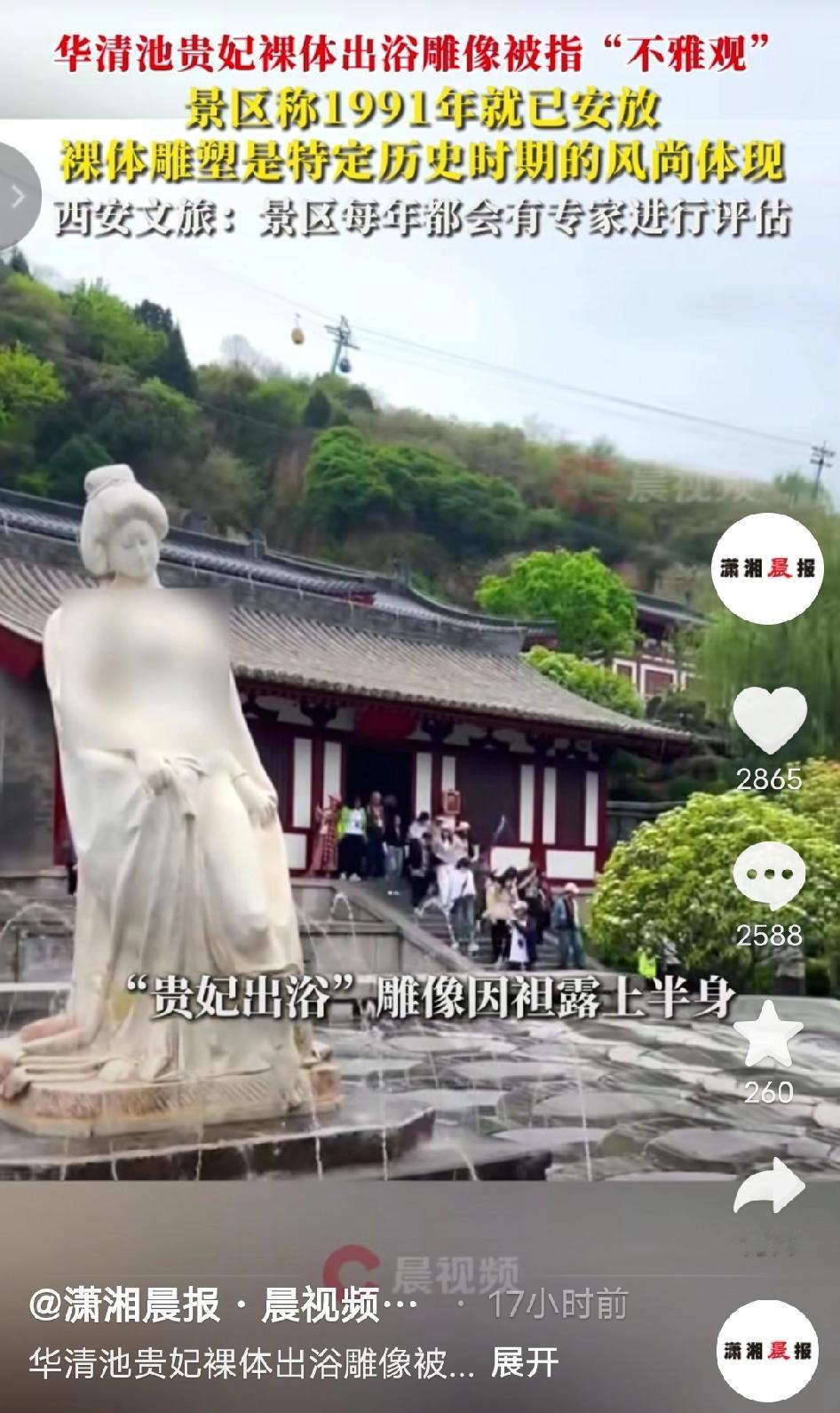 吵翻天了!西安华清池那尊立了35年的“贵妃出浴”雕像,最近有人发帖吐槽说“光着上半身太不雅观”,还质问“为啥不给雕像披件衣服”,这事儿直接把评论区吵成了菜市场!景区赶紧回应:这雕像是1991年就安了的老物件,每年都有专家评估,现在正等处理结果呢!一个立了35年的地标,现在突然被说‘不雅’,这事儿你怎么看? 其实这尊雕像来头不小,是我国著名雕塑家潘鹤教授的作品,1991年就安放在景区了,算下来已经在华清池站了35年。最早它在九龙湖旁边,2005年才挪到了御汤遗址博物馆附近,这么多年来一直是游客打卡拍照的标志性景点,从来没人觉得有问题。 结果就这么一个立了快半辈子的老雕塑,突然被翻出来说“不雅”,网友们直接分成了两派: - 有人急了:“杨贵妃出浴本来就是这个样子啊!总不能给她套个羽绒服吧?这是艺术还原,不是耍流氓!” - 也有人理解:“公共场合确实要考虑大众感受,尤其是带孩子的游客,或许加个轻纱装饰会更合适?” - 还有人调侃:“这雕像都没嫌自己站了35年冷,网友倒是先替它害臊了!” 面对争议景区说:“这雕像是特定历史时期的艺术作品,我们已经把情况报给上级了,正在等处理果。 西安文旅局也表示::“华清宫每年都会请专家评估所有景观,这尊雕像是长期陈列的,后续会结合专家意见来处理。” 说句实在话,我看到这事儿的时候直接笑出声了。 一个立了35年的老雕塑,怎么突然就“不雅”了?要是真觉得不合适,早干嘛去了?这就像你吃了35年的红烧肉,今天突然说“太油了”,不是有点扯吗? 我前几年专门去过华清池游玩,当时还带着家里长辈一起看这尊“贵妃出浴”雕像,长辈第一眼就感慨“这雕得真传神,怪不得能成标志性景,杨贵妃出浴本就该是这般模样”,那会儿不管是同行游客还是身边人,没人觉得有不妥,反而都在夸雕塑还原得好、有韵味。现在突然被揪出来骂“不雅”,我反而有点懵——难道我们的审美反而倒退了? 我倒觉得,这根本不是雕像是雅是俗的问题,而是现在有些人太敏感了。艺术的尺度和大众的审美本来就不是一回事,要是为了迎合少数人的看法,给杨贵妃硬披件衣服,那才是真的毁了艺术。 说白了,这尊雕像能立35年,本身就说明它经得起时间的考验。真没必要为了一点争议就大动干戈,不如让它继续站在那里,告诉大家什么是真正的历史与艺术。 希望专家们能给个公道的评估,别让这尊老雕塑受委屈。毕竟,杨贵妃当年出浴的时候,可没人说她“不雅”。 你觉得贵妃雕像该添加衣服吗? 华清池贵妃雕像 公共艺术争议 35年老雕塑 西安文旅 贵妃出浴雕像争议 来源:潇湘晨报-晨视频