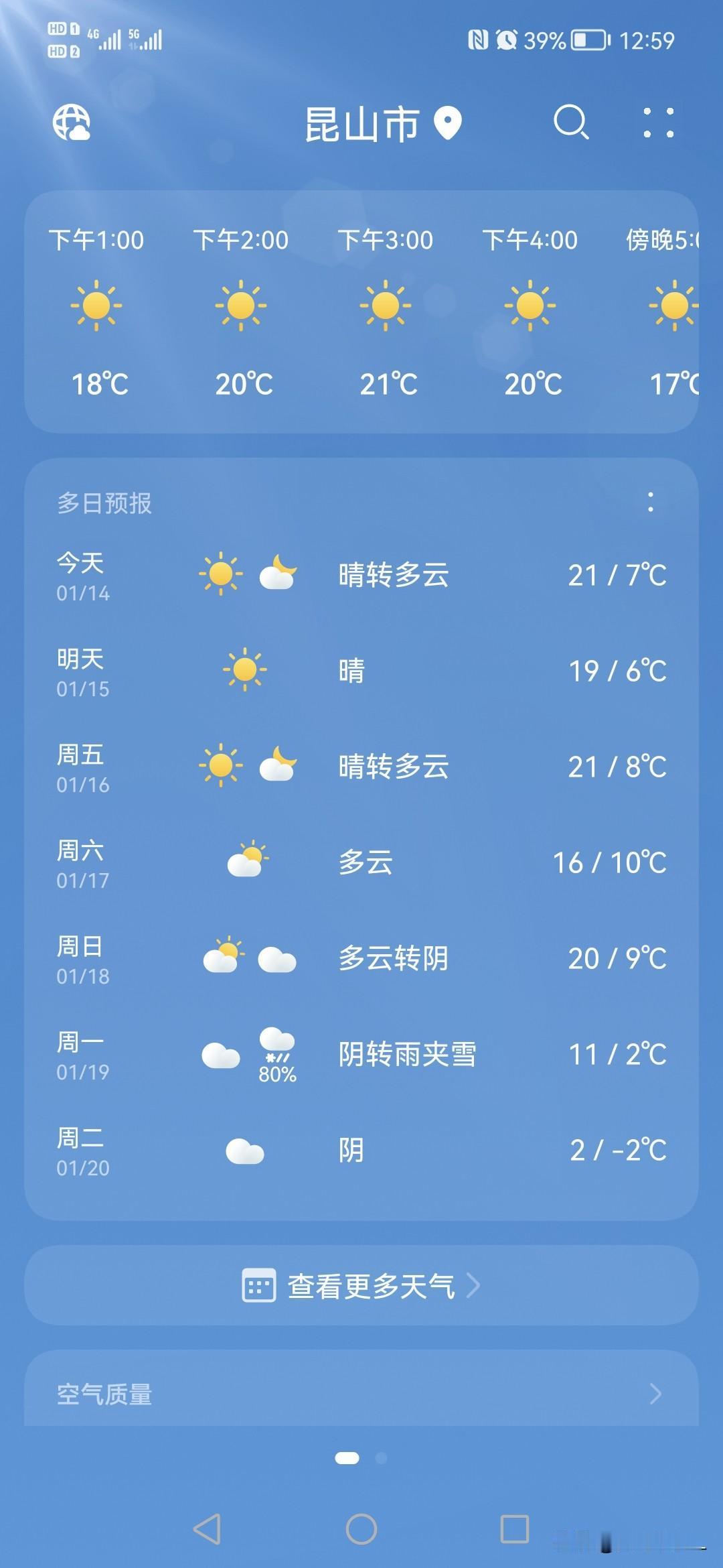 今天昆山的天气一点都不冷,中午有21度,下周二会降到2度,注意保暖。