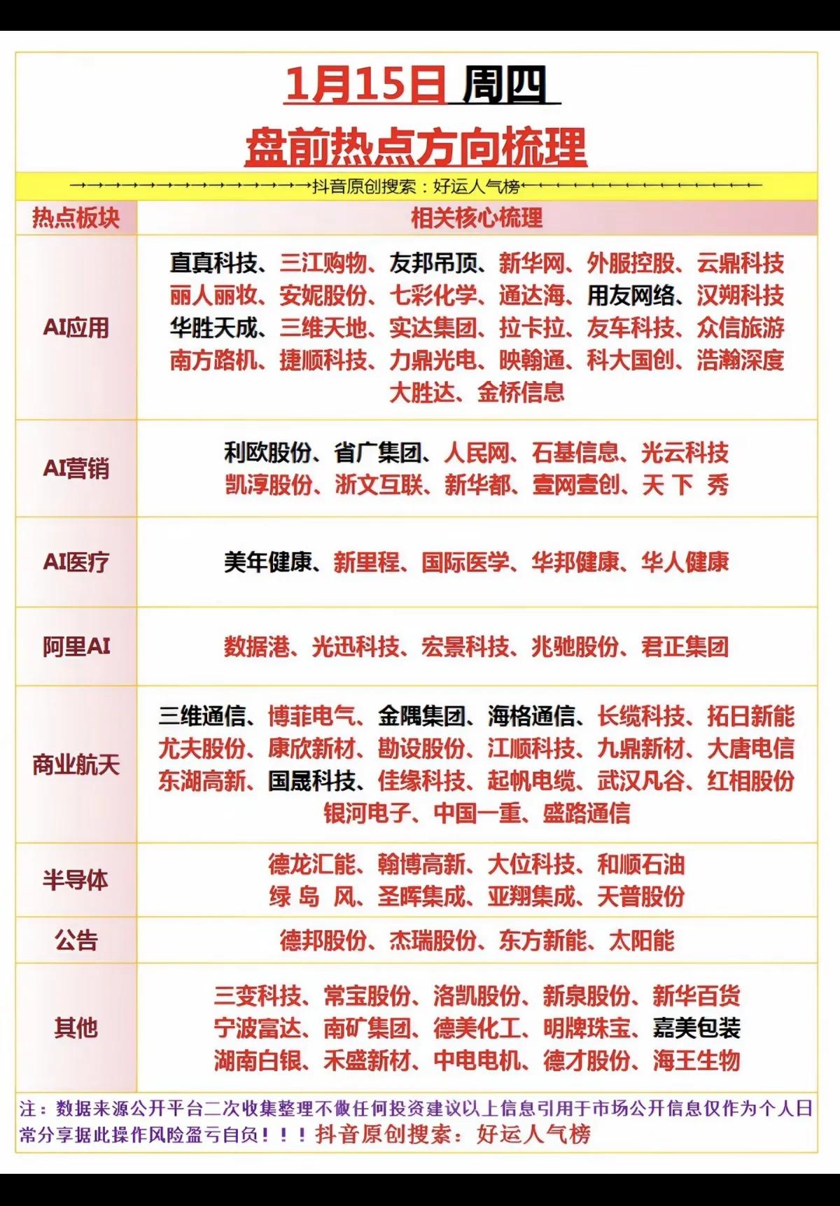 1月15日,周四A股盘前热点方向梳理一览表!!! AI应用板块:重点关注:三江购物、金桥信息、云鼎科技;AI营销板块:重点关注:壹网壹创、凯淳股份、天下秀;阿里AI板块:数据港、君正集团、光迅科技;商业航天板块:重点关注:博菲电气、九鼎新材、尤夫股份!!!