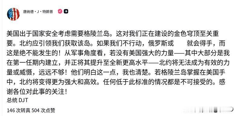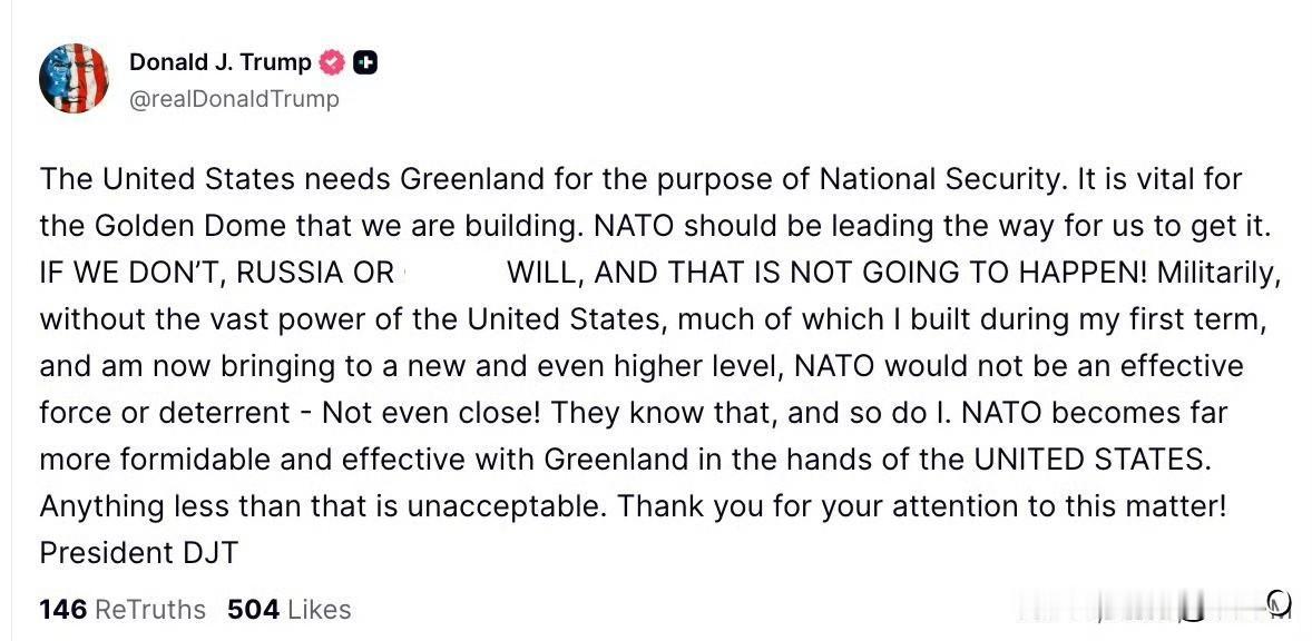 特朗普刚刚发帖,声称“美国”出于国家安全目的需要格陵兰,表示这对金穹至关重要。
