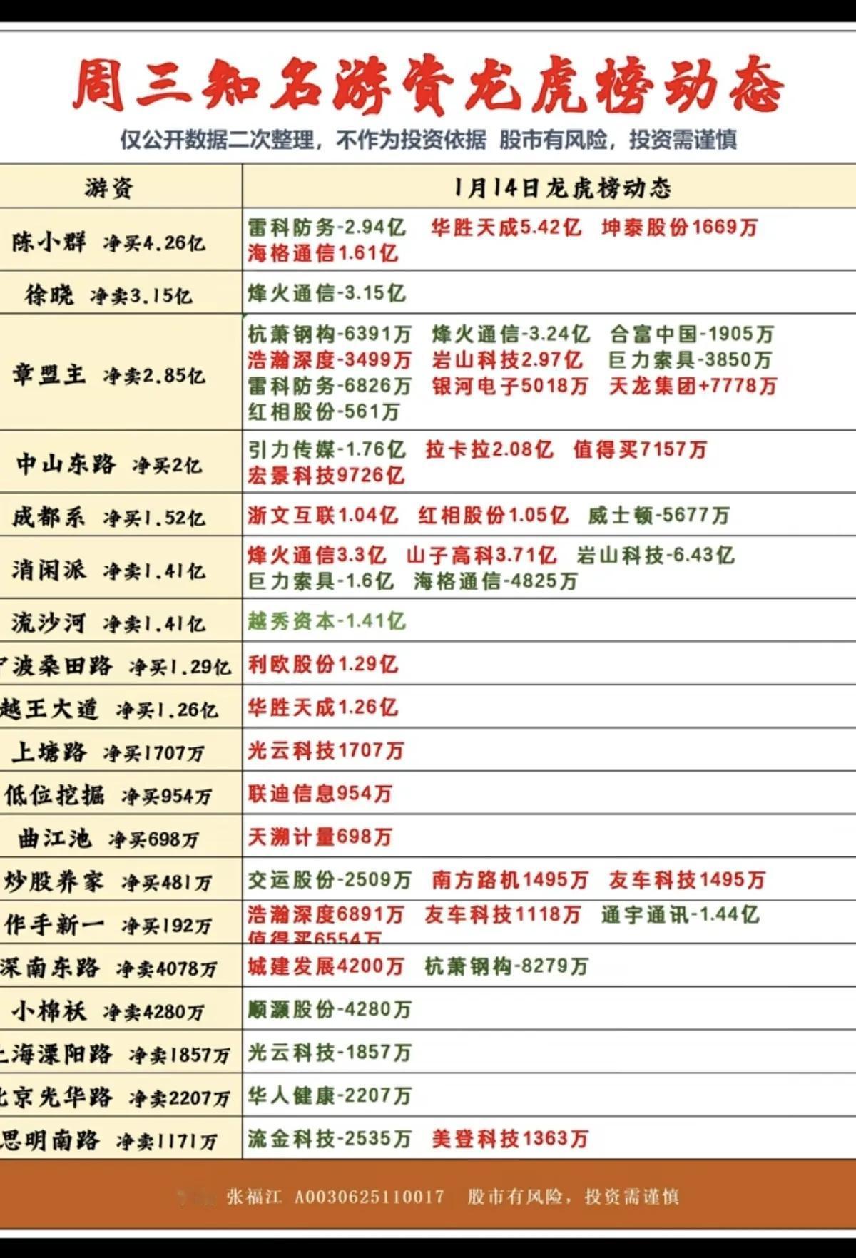 1月14日,周三A股大柚子买了啥? 群总买入华胜天成5.42亿、海格通信1.61亿、卖出雷科防务2.94亿;章盟主买入岩山科技2.97亿、银河电子5018万、天龙集团7778万、卖出烽火通信3.24亿、雷科防务6826万!!!